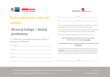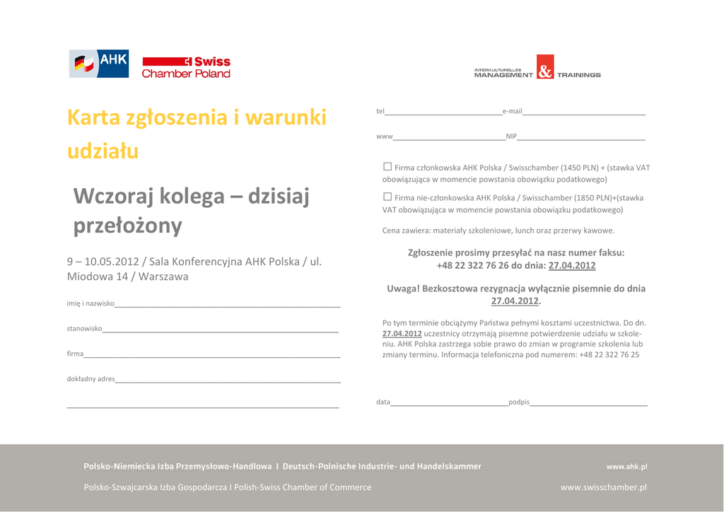 Karta zgłoszenia i warunki udziału tel_______________________e‐mail________________________ www______________________NIP_________________________ □ Firma członkowska AHK Polska / Swisschamber (1450 PLN) + (stawka VAT obowiązująca w momencie powstania obowiązku podatkowego) □ Wczoraj kolega – dzisiaj przełożony Firma nie‐członkowska AHK Polska / Swisschamber (1850 PLN)+(stawka VAT obowiązująca w momencie powstania obowiązku podatkowego) Cena zawiera: materiały szkoleniowe, lunch oraz przerwy kawowe. 9 – 10.05.2012 / Sala Konferencyjna AHK Polska / ul. Miodowa 14 / Warszawa Zgłoszenie prosimy przesyłać na nasz numer faksu: +48 22 322 76 26 do dnia: 27.04.2012 Uwaga! Bezkosztowa rezygnacja wyłącznie pisemnie do dnia 27.04.2012. imię i nazwisko____________________________________________ Po tym terminie obciążymy Państwa pełnymi kosztami uczestnictwa. Do dn. 27.04.2012 uczestnicy otrzymają pisemne potwierdzenie udziału w szkole‐ niu. AHK Polska zastrzega sobie prawo do zmian w programie szkolenia lub zmiany terminu. Informacja telefoniczna pod numerem: +48 22 322 76 25 stanowisko______________________________________________ firma__________________________________________________ dokładny adres____________________________________________ _____________________________________________________ Polsko‐Szwajcarska Izba Gospodarcza I Polish‐Swiss Chamber of Commerce data_______________________podpis_______________________ www.swisschamber.pl