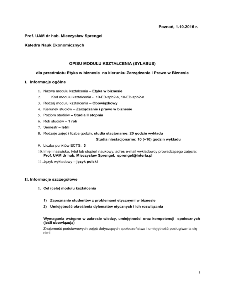 Poznań, 1.10.2016 r. Prof. UAM dr hab. Mieczysław Sprengel Katedra Nauk Ekonomicznych OPISU MODUŁU KSZTAŁCENIA (SYLABUS) dla przedmiotu Etyka w biznesie na kierunku Zarządzanie i Prawo w Biznesie I. Informacje ogólne 1. Nazwa modułu kształcenia – Etyka w biznesie 2. Kod modułu kształcenia - 10-EB-zpb2-s, 10-EB-zpb2-n 3. Rodzaj modułu kształcenia – Obowiązkowy 4. Kierunek studiów – Zarządzanie i prawo w biznesie 5. Poziom studiów – Studia II stopnia 6. Rok studiów – 1 rok 7. Semestr – letni 8. Rodzaje zajęć i liczba godzin, studia stacjonarne: 20 godzin wykładu Studia niestacjonarne: 10 (+10) godzin wykładu 9. Liczba punktów ECTS: 3 10. Imię i nazwisko, tytuł lub stopień naukowy, adres e-mail wykładowcy prowadzącego zajęcia: Prof. UAM dr hab. Mieczysław Sprengel, [email protected] 11. Język wykładowy – język polski II. Informacje szczegółowe 1. Cel (cele) modułu kształcenia 1) Zapoznanie studentów z problemami etycznymi w biznesie 2) Umiejętność określenia dylematów etycznych i ich rozwiązania Wymagania wstępne w zakresie wiedzy, umiejętności oraz kompetencji społecznych (jeśli obowiązują) Znajomość podstawowych pojęć dotyczących społeczeństwa i umiejętność posługiwania się nimi 1 2. Efekty kształcenia w zakresie wiedzy, umiejętności oraz kompetencji społecznych dla modułu kształcenia i odniesienie do efektów kształcenia dla kierunku studiów Odniesienie do efektów kształcenia dla kierunku # studiów Symbol efektów kształcenia* Po zakończeniu modułu (przedmiotu) i potwierdzeniu osiągnięcia efektów kształcenia student potrafi: EB_01 Określić różne koncepcje etyczne K_W01, K_W02, K_W04, K_U01, K_U02, KU_04, K_K01 EB_02 Wyjaśnić rolę bogactwa w perspektywie religijnej K_W05, K_U02, K_U03, K_K01, K_K04, K_K05 EB_03 Opisać genezę i historię etyki biznesu K_W05, K_W06,K_K04 EB_04 Prezentować postawę odpowiedzialności za biznes K_W05,K_U04, K_U05, K_K04, K_K05 EB_05 Interpretować dylematy ekonomiczne K_W06, K_U04, K_K07 EB_06 Stosować etykę w zarządzaniu zasobami ludzkimi K_U04, K_U05, K_K07 * kod modułu kształcenia, np. KHT_01 (KHT-kod modułu „Kataliza Heterogeniczna” w USOS) # efekty kształcenia dla kierunku studiów (np. K_W01, K_U01, ..) W – wiedza; U – umiejętności; K – kompetencje społeczne (wyszczególnione tylko w symbolach kierunkowych efektów kształcenia) 01, 02… – numer efektu kształcenia UWAGA! Zaleca się, aby, w zależności od modułu, liczba efektów kształcenia zawierała się w przedziale: 5-10. 3. Treści kształcenia Nazwa modułu kształcenia: Etyka w biznesie Symbol treści kształcenia* Opis treści kształcenia Odniesienie do efektów # kształcenia modułu TK_01 Etyka w biznesie w różnych koncepcjach etycznych EB_01 TK_02 Bogactwo w perspektywie religijnej EB_02 TK_03 Geneza i historia etyki biznesu EB_03 TK_04 Odpowiedzialność za biznes. EB_04 TK_05 Dylematy ekonomiczne w działalności podmiotów gospodarczych EB_05 TK_06 Etyka w zarządzaniu zasobami ludzkimi EB_06 * np. TK_01, TK_02, … # np. KHT_01 – kod modułu kształcenia wg tabeli w pkt. II 3 4. Zalecana literatura: Dowolne dostępne na rynku wydawniczym aktualne prace z zakresu etyki biznesu Literatura podstawowa: 1) E. Skrzypek (red.), Etyka w biznesie: monografia, Lublin 2010. 2) B .Klimczak, Etyka gospodarcza, Wrocław 2003. 3) Ł. Zaorski-Sikora, Etyka w biznesie, Łódź 2007. 2 Literatura uzupełniająca: 1) M. Borkowska, J.W. Gałkowski (red.), Etyka w biznesie, Lublin 2002, 2) P.M. Minus (red.), Etyka w biznesie, Warszawa 1998, 5. Informacja o tym, gdzie można zapoznać się z materiałami do zajęć, instrukcjami do laboratorium, itp. Biblioteka UAM w Poznaniu, Biblioteki Publiczne, Czytelnia Biblioteki Uniwersyteckiej UAM w Poznaniu III. Informacje dodatkowe 1. Odniesienie efektów kształcenia i treści kształcenia do sposobów prowadzenia zajęć i metod oceniania Nazwa modułu (przedmiotu): Etyka w biznesie Symbol efektu kształcenia dla modułu * Symbol treści kształcenia realizowanych w trakcie # zajęć Sposoby prowadzenia zajęć umożliwiające osiągnięcie założonych efektów kształcenia EB_01-06 TK_01 -06 Wykład Metody oceniania stopnia osiągnięcia założonego efektu & kształcenia Egzamin na podstawie testu pisemnego * np. KHT_01 – kod modułu kształcenia wg tabeli w pkt. II 3 i w pkt. II 4 # np. TK_01 – symbol treści kształcenia wg tabeli w pkt. II 4 & Proszę uwzględnić zarówno oceny formujące(F) jak i podsumowujące(P) 2. Obciążenie pracą studenta (punkty ECTS) Nazwa modułu (przedmiotu): Etyka w biznesie Forma aktywności Godziny zajęć (wg planu studiów) z nauczycielem Praca własna studenta (łącznie wszystkie formy) SUMA GODZIN SUMARYCZNA LICZBA PUNKTÓW ECTS DLA MODUŁU (PRZEDMIOTU) Średnia liczba godzin na zrealizowanie aktywności * Studia stacjonarne: 20 wykładów Studia niestacjonarne: 10 (+10) wykładów Studia stacjonarne: 70 h Studia niestacjonarne: 70 h, w tym 10 elearningu 90 3 * Godziny lekcyjne, czyli 1 godz. oznacza 45 min. Praca własna studenta – przykładowe formy aktywności: (1) przygotowanie do zajęć, (2) opracowanie wyników, (3) czytanie wskazanej literatury, (4) napisanie raportu z zajęć, (5) przygotowanie do egzaminu,… # 3 3. Sumaryczne wskaźniki ilościowe a) Liczba punktów ECTS, którą student uzyskuje na zajęciach wymagających bezpośredniego udziału nauczycieli akademickich - 3 b) Liczba punktów ECTS, którą student uzyskuje w ramach zajęć o charakterze praktycznym, takich jak zajęcia laboratoryjne i projektowe 4. Kryteria oceniania Stosuje się następujące kryteria oceniania studenta: a) Umiejętność określenia zachowań etycznych w biznesie b) Znajomość zagadnień omawianych na wykładzie Mieczysław Sprengel Katedra Nauk Ekonomicznych 4
