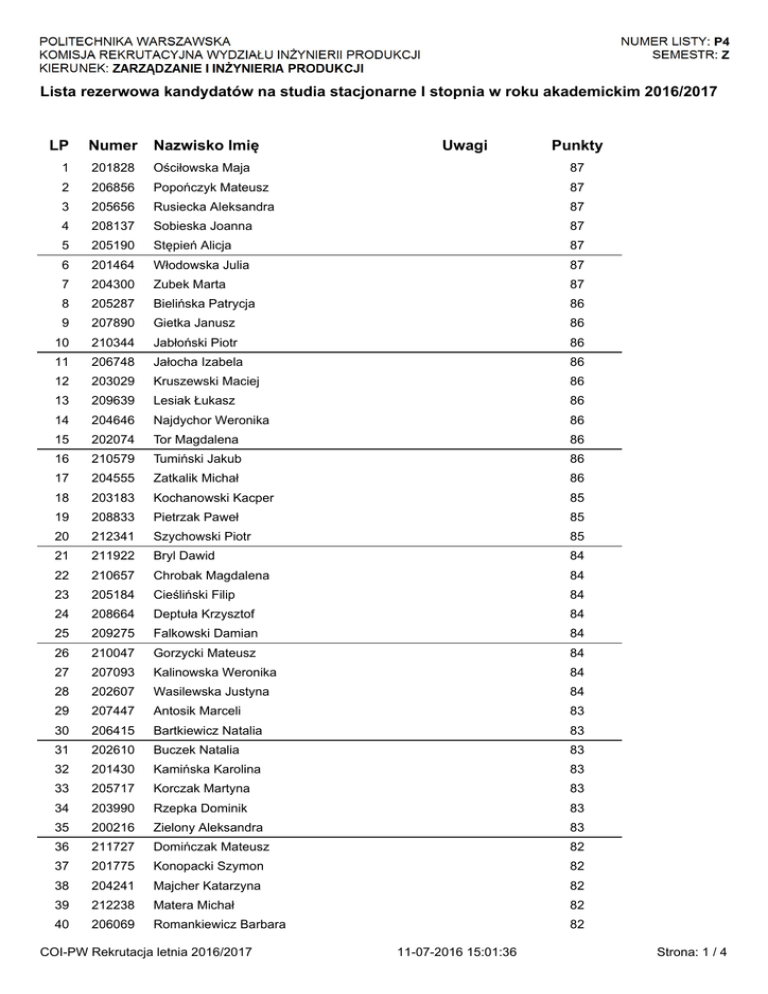 Lista rezerwowa kandydatów na studia stacjonarne I stopnia w roku akademickim 2016/2017 LP Numer Nazwisko Imię 1 201828 Ościłowska Maja 87 2 206856 Popończyk Mateusz 87 3 205656 Rusiecka Aleksandra 87 4 208137 Sobieska Joanna 87 5 205190 Stępień Alicja 87 6 201464 Włodowska Julia 87 7 204300 Zubek Marta 87 8 205287 Bielińska Patrycja 86 9 207890 Gietka Janusz 86 10 210344 Jabłoński Piotr 86 11 206748 Jałocha Izabela 86 12 203029 Kruszewski Maciej 86 13 209639 Lesiak Łukasz 86 14 204646 Najdychor Weronika 86 15 202074 Tor Magdalena 86 16 210579 Tumiński Jakub 86 17 204555 Zatkalik Michał 86 18 203183 Kochanowski Kacper 85 19 208833 Pietrzak Paweł 85 20 212341 Szychowski Piotr 85 21 211922 Bryl Dawid 84 22 210657 Chrobak Magdalena 84 23 205184 Cieśliński Filip 84 24 208664 Deptuła Krzysztof 84 25 209275 Falkowski Damian 84 26 210047 Gorzycki Mateusz 84 27 207093 Kalinowska Weronika 84 28 202607 Wasilewska Justyna 84 29 207447 Antosik Marceli 83 30 206415 Bartkiewicz Natalia 83 31 202610 Buczek Natalia 83 32 201430 Kamińska Karolina 83 33 205717 Korczak Martyna 83 34 203990 Rzepka Dominik 83 35 200216 Zielony Aleksandra 83 36 211727 Domińczak Mateusz 82 37 201775 Konopacki Szymon 82 38 204241 Majcher Katarzyna 82 39 212238 Matera Michał 82 40 206069 Romankiewicz Barbara 82 COI-PW Rekrutacja letnia 2016/2017 Uwagi 11-07-2016 15:01:36 Punkty Strona: 1 / 4 Lista rezerwowa kandydatów na studia stacjonarne I stopnia w roku akademickim 2016/2017 LP Numer Nazwisko Imię 41 208002 Szudejko Alicja 82 42 200387 Zalewska Martyna 82 43 200739 Zduńczyk Mateusz 82 44 202181 Bartnik Karol 81 45 204789 Bulkowska Olga 81 46 204736 Gawryszewska Weronika 81 47 203769 Jastrzębska Emilia 81 48 202589 Kubacka Oliwia 81 49 203442 Witkowski Paweł 81 50 205555 Górska Katarzyna 80 51 210339 Hrab Patryk 80 52 207745 Lutostańska Patrycja 80 53 201059 Ositek Magdalena 80 54 208434 Przybył Natalia 80 55 212027 Rajewska Adrianna 80 56 202931 Szymańska Nikola 80 57 208513 Zblewska Martyna 80 58 210322 Zięcina Mateusz 80 59 210512 Juszko Aleksandra 79 60 211430 Komorowski Paweł 79 61 210906 Malczuk Karol 79 62 204327 Padzik Piotr 79 63 211897 Świostek Michał 79 64 207109 Zakrzewski Damian 79 65 206030 Ziemiańczyk Katarzyna 79 66 204630 Dreling Mateusz 78 67 203659 Golik Aleksandra 78 68 201472 Koprzywa Dominik 78 69 210836 Petridis Mateusz 78 70 202165 Pyszyński Adrian 78 71 203939 Wituszyńska Aleksandra 78 72 206563 Grabowski Patryk 77 73 207222 Gutowski Ireneusz 77 74 210331 Jeż Olga 77 75 205566 Pietrak Sebastian 77 76 203664 Suchecka Klaudia 77 77 201134 Tomala Jakub 77 78 209271 Waszczyńska Ewelina 77 79 203742 Wilk Filip 77 80 210989 Chmielnicki Mikołaj 76 COI-PW Rekrutacja letnia 2016/2017 Uwagi 11-07-2016 15:01:36 Punkty Strona: 2 / 4 Lista rezerwowa kandydatów na studia stacjonarne I stopnia w roku akademickim 2016/2017 LP Numer Nazwisko Imię 81 207657 KACZMARSKI FILIP 76 82 208481 Krysiak Gabriela 76 83 211821 Łukasiewicz Damian 76 84 205842 Marciniak Adam 76 85 202463 Mróz Michał 76 86 211895 Pasternak Wojciech 76 87 210494 Sienkiewicz Maciej 76 88 202101 Wiśniewski Olgierd 76 89 210491 Żywko Mateusz 76 90 207668 Brzeziński Kacper 75 91 207666 Długosz Kamila 75 92 200960 Iskierka Weronika 75 93 211767 Janusz Alicja 75 94 210394 Nowek Marcin 75 95 207296 Peciak Julia 75 96 207823 Pietruczanis Paulina 75 97 210760 Pośnik Kamil 75 98 211051 Styka Bartosz 75 99 210924 Szulc Martyna 75 100 208979 Zawadka Aleksandra 75 101 205036 Dobczyński Dawid 74 102 207979 Gładysz Klaudia 74 103 207150 Gowkielewicz Patryk 74 104 207730 Izdebska Olga 74 105 202282 Kiska Kamil 74 106 208959 Koc Krystian 74 107 200191 Matysiak Piotr 74 108 208271 Woźniak Paulina 74 109 212159 Cielemęcki Paweł 73 110 203023 Krakowski Jakub 73 111 205283 Mańko Monika 73 112 207157 Paszkiewicz Jakub 73 113 201882 Zajączkowska Lidia 73 114 205081 Chmiel Aleksandra 72 115 208793 Floriańczyk Emilia 72 116 206114 Kulicki Bartosz 72 117 207604 Morusiewicz Paweł 72 118 200342 Narolewska Joanna 72 119 200843 Nowak Karolina 72 120 209077 Pasternak Jacek 72 COI-PW Rekrutacja letnia 2016/2017 Uwagi 11-07-2016 15:01:36 Punkty Strona: 3 / 4 Lista rezerwowa kandydatów na studia stacjonarne I stopnia w roku akademickim 2016/2017 LP Numer Nazwisko Imię 121 211052 Rakowski Kornel 72 122 206174 Tuszyńska Maria 72 123 211432 Tyburczy Aleksandra 72 124 209941 Halaba Paweł 71 125 210818 Kulesza Katarzyna 71 126 209762 Małkowski Tomasz 71 127 206357 Sacharczuk Tomasz 71 128 207110 Szabat Agata 71 129 210277 Tarkowski Szymon 71 130 201913 Widomska Wioletta 71 131 207783 Baran Jakub 70 132 202849 Harasimuk Agata 70 133 211730 Kutyła Tomasz 70 134 204006 Leszczak Piotr 70 135 200805 Miętus Karolina 70 136 209417 Skowyra Kamil 70 137 202229 Ukleja Oktawia 70 138 206437 Winiarska Marta 70 COI-PW Rekrutacja letnia 2016/2017 Uwagi 11-07-2016 15:01:36 Punkty Strona: 4 / 4