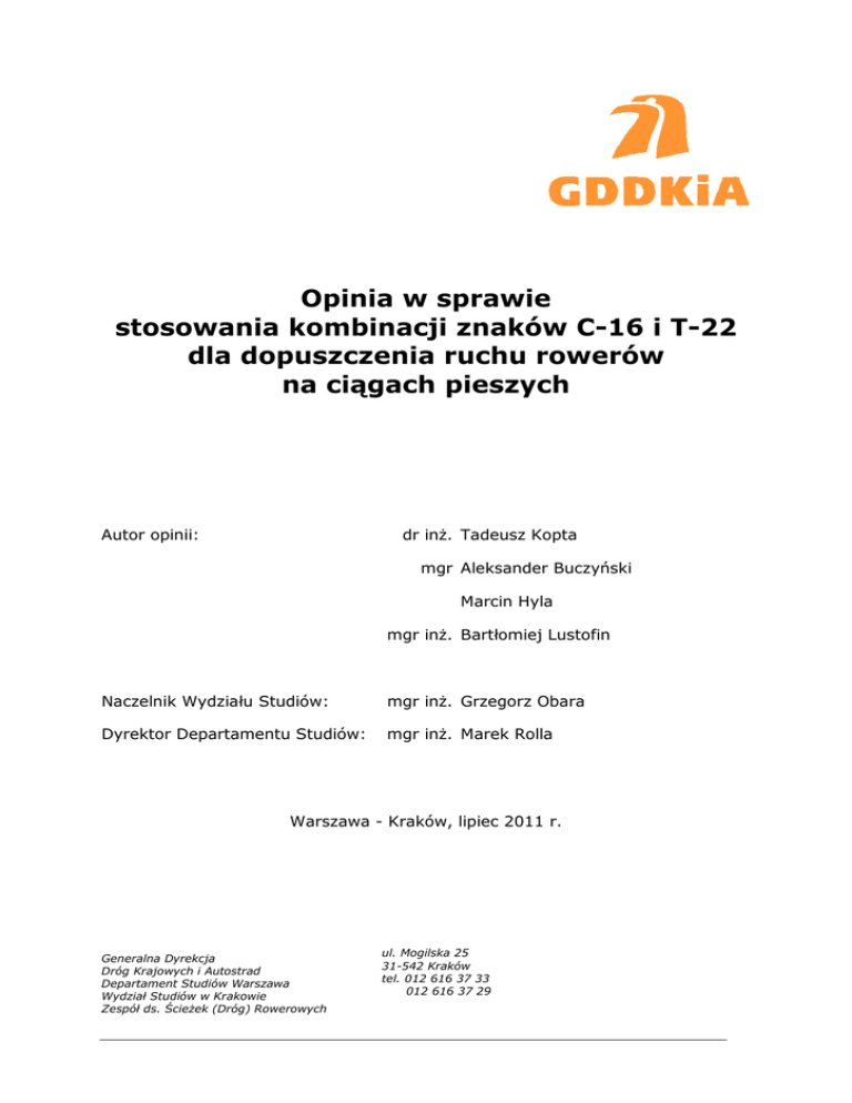 Opinia w sprawie stosowania kombinacji znaków C-16 i T-22 dla dopuszczenia ruchu rowerów na ciągach pieszych Autor opinii: dr inż. Tadeusz Kopta mgr Aleksander Buczyński Marcin Hyla mgr inż. Bartłomiej Lustofin Naczelnik Wydziału Studiów: mgr inż. Grzegorz Obara Dyrektor Departamentu Studiów: mgr inż. Marek Rolla Warszawa - Kraków, lipiec 2011 r. Generalna Dyrekcja Dróg Krajowych i Autostrad Departament Studiów Warszawa Wydział Studiów w Krakowie Zespół ds. Ścieżek (Dróg) Rowerowych ul. Mogilska 25 31-542 Kraków tel. 012 616 37 33 012 616 37 29 GDDKiA – Departament Studiów – Zespół ds. Ścieżek (Dróg) Rowerowych Spis treści 1. Wprowadzenie .......................................................................... 3 2. Cel i zakres zastosowania C-16 i T-22 .......................................... 3 3. Uwarunkowania prawne ............................................................. 5 3.1. Podstawa prawna ................................................................. 5 3.2. Dopuszczalność stosowania T-22 pod znakami nakazu .............. 6 3.3. Interpretacja znaczenia kombinacji znaków ............................. 6 3.4. Kategoryzacja znaków drogowych .......................................... 7 4. 4.1. Niemcy ............................................................................... 8 4.2. Polska .............................................................................. 10 5. 2 Przykłady zastosowania ............................................................. 8 Podsumowanie........................................................................ 10 Opinia w sprawie stosowania kombinacji znaków C-16 i T-22 1. Wprowadzenie Niniejsza opinia omawia cel, zakres, podstawy prawne i przykłady zastosowania ciągu pieszego z dopuszczonym ruchem rowerów, oznakowanego kombinacją znaków C-16 i T-22. Oznakowanie to służy dopuszczeniu ruchu rowerzystów na chodniku, ale bez obowiązku korzystania z niego, co wymusza kombinacja C-13/16. Tego typu rozwiązania są popularne m.in. w Niemczech, Austrii i Szwajcarii, a ostatnio coraz częściej także w Polsce. Umiejętne stosowanie C16+T-22, pozwala prowizorycznie poprawić spójność i bezpieczeństwo sieci tras rowerowych bez konieczności kosztownej przebudowy. Autorzy niniejszej opinii dziękują mgr. Ryszardowi Rakowerowi za współpracę przy analizie uwarunkowań prawnych. 2. Cel i zakres zastosowania C-16 i T-22 Celem zastosowania kombinacji znaków C-16 i T-22 jest danie rowerzystom wyboru części drogi z której chcą korzystać w sytuacji, w której niemożliwe jest – w związku np. z uwarunkowaniami ekonomicznymi lub terenowymi – zapewnienie infrastruktury w pełni odpowiadającej potrzebom wszystkich użytkowników rowerów. Kombinacja znaków C-16 i T-22 jest często jedynym zgodnym z prawem sposobem wpuszczenia rowerzystów na ciąg pieszy czy pieszo-jezdny poza jezdnią. Wymogi przepisów prawa budowlanego (rozporządzenie w sprawie warunków technicznych jakim powinny odpowiadać drogi publiczne i ich usytuowanie z 2 marca 1999 r. – Dz. U. z 1999 r. Nr 43, poz. 430) stawiają konkretne wymagania dotyczące szerokości (minimum 1,5 m dla drogi jednokierunkowej oraz 2,0 m dla drogi dwukierunkowej) oraz skrajni drogi rowerowej (0,2 m poza krawędź). W dodatku należy zachować skrajnię jezdni (0,5 m poza krawędź). Z kolei zapisy dotyczące przekrojów drogi rowerowej z dopuszczonym ruchem pieszym są nieczytelne, gdyż w świetle ustawy Prawo o Ruchu Drogowym na większości dróg rowerowych ruch pieszy jest w jakiejś formie dopuszczony. W przypadku kombinacji znaków C-16 i T-22 obowiązują wyłącznie przepisy prawa budowlanego dot. chodników (dróg dla pieszych). Kombinacja znaków C-16 i T-22 nie jest tożsama ze znakiem C-13 i pochodnymi (droga dla rowerów). Konsekwencje prawne użycia tych znaków są różne. Stąd są to dwa zupełnie różne instrumenty, które ma do dyspozycji zarządca drogi. Znak C-13 i pochodne, umieszczone zgodnie z § 2 pkt. 1 rozporządzenia w sprawie znaków i sygnałów drogowych (Dz. U. z 2002 r. Nr 170, poz. 1393) po prawej stronie jezdni, oznaczają na podstawie art. 33 ustawy Prawo o Ruchu Drogowym (a także w myśl Porozumienia Europejskiego do Konwencji Wiedeńskiej o Ruchu Drogowym, Dz. U. z 1988 r. Nr 5, poz. 44) obowiązek korzystania przez rowerzystę z drogi rowerowej. Tymczasem znak C-16 z tabliczką T-22 takiego obowiązku nie narzuca, pozostawiając rowerzystom wybór, czy chcą jechać jezdnią, czy też wolą poruszać się po tak oznakowanym ciągu. Jest to szczególnie korzystne w dwóch przypadkach: 3 GDDKiA – Departament Studiów – Zespół ds. Ścieżek (Dróg) Rowerowych • kiedy ciąg ma jakość utrudniającą poruszanie się po nim na rowerze, w szczególności w porównaniu do jezdni; • kiedy z danej trasy korzystają rowerzyści o bardzo silnie zróżnicowanych potrzebach i możliwościach (np. zarówno sportowcy, turyści rowerowi z dużym i ciężkim bagażem jak i rodziny z dziećmi na rowerach, osoby starsze czy rowerzyści niedoświadczeni) i nie istnieje możliwość zapewnienia na drodze rowerowej takich parametrów, aby wszyscy ci użytkownicy mogli z niej korzystać bezpiecznie i wygodnie. Idea „opcjonalnej” organizacji ruchu rowerowego wynika ze zrozumienia, że: • zderzenie tylne jest tylko jednym z wielu i wcale nie najczęstszym rodzajem wypadku z udziałem rowerzysty1, w związku z czym segregacja ruchu rowerowego nie zawsze poprawia bezpieczeństwo, a czasem może je nawet pogorszyć2; • zarówno same rowery jak i użytkownicy rowerów są różni: różnice obejmują m.in. wymiary roweru, prędkość i stabilność jazdy, tolerancję na nierówności i uskoki. Rozwiązania wymuszające korzystanie przez wszystkich użytkowników rowerów z tej samej części drogi wymagają zapewnienia na niej odpowiednich warunków: jeśli każdy rowerzysta ma korzystać z drogi dla rowerów