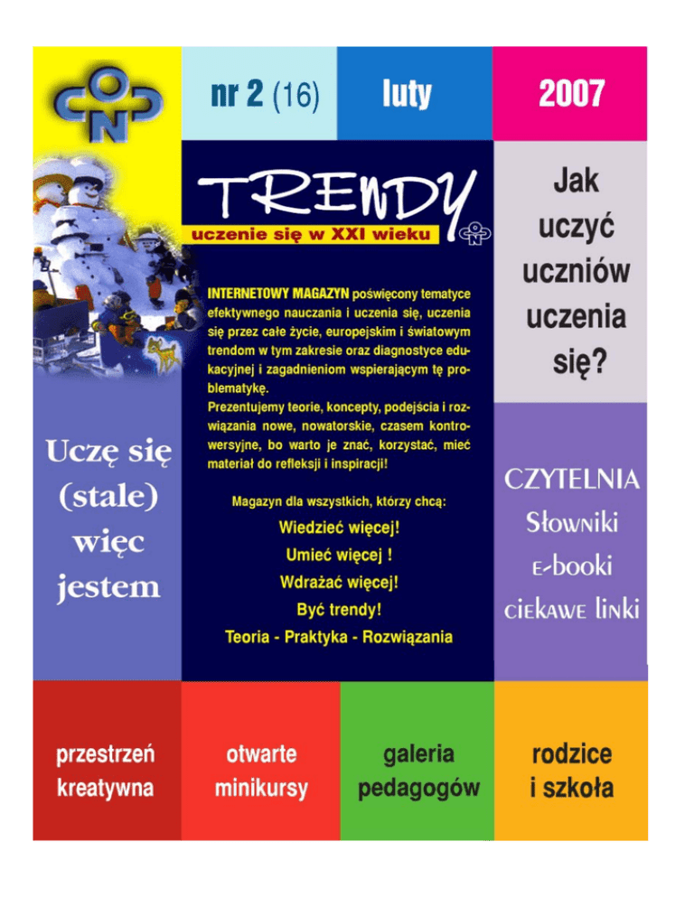 Internetowy magazyn CODN nr 2/16/2007 Przed Państwem wydanie lutowe magazynu Za oknem ziąb (przynajmniej w Warszawie), ale już czujemy wiosnę, bo jest naprawdę blisko! Optymizmem nas napawa także zbliżający się termin trzeciej już edycji Ogólnopolskiego Festiwalu Edukacyjnego, który odbędzie się w dniach 19-21. kwietnia w Płocku. Szczegóły będą ujawnione już wkrótce, a zanosi się na naprawdę znakomite wydarzenie. Ten Festiwal chcemy coraz bardziej zbliżyć do imprezy, która dostarcza wielu wrażeń, także od strony estetycznej. Planowane są zdarzenia towarzyszące: koncerty, przedstawienia teatralne, projekcje filmowe, wystawy oraz happening na rynku płockim dedykowany uczniom i ich rodzicom. Chcemy, aby Festiwal stał się nowoczesną imprezą edukacyjną obejmującą całą społeczność lokalną – zgodnie z ideami Kampanii na rzecz Uczenia się: uczymy się wszyscy, a że najlepiej uczymy się w dobrym klimacie zabawy, więc projektujemy takie właśnie sytuacje uczenia się. Zapraszamy do odwiedzania strony internetowej CODN, gdzie będą podane wszystkie informacje. Naszych Stałych i Nowych Czytelników zapraszam gorąco do przesyłania uwag i refleksji na temat zawartości magazynu Chcielibyśmy wiedzieć kto nas czyta, jak nas oceniacie, czy i w jaki sposób wykorzystywane są materiały z magazynu? Bardzo prosimy o korespondencję pod adres e-mail: [email protected] Zapraszamy do lektury Małgorzata Taraszkiewicz i Autorzy 15. lutego, 2007 r. Wyd. Pracownia Informacji Pedagogicznej CODN str.1 Internetowy magazyn CODN nr 2/16/2007 Spis treści artykułów 1. Bezpieczne ocenianie Małgorzata Taraszkiewicz........................................................................... str. 4 2. Dobra szkoła – co to takiego? Wiga Bednarkowa....................................................................................... str. 9 3. Pomyślmy starannie Małgorzata Taraszkiewicz........................................................................... str. 21 4. NLP, część 3 Janina Jaworek ........................................................................................... str. 24 5. Nauczyciel na miarę XXI wieku Fragmenty prac uczniów NKJO w Legnicy ................................................. str. 28 6. Manifest Ucznia Fragmenty prac uczniów NKJO w Legnicy ................................................. str. 33 7. Instrumental Enrichment – nowatorski program edukacyjny, rozwijający struktury inteligencji. Beata Wojciechowska................................................................................. str. 36 8. Nie wolno całować drzew! Zuzanna Kępińska ...................................................................................... str. 40 9. Metafory na problemy Porozmawiajmy o prozie życia.................................................................... str. 44 10. Zosia w szkole .................................................................................................................... str. 45 Magazyn wydawany przez Pracownię Informacji Pedagogicznej CODN Centralny Ośrodek Doskonalenia Nauczycieli 00-478 Warszawa, Aleje Ujazdowskie 28 Redaktor naczelny: Małgorzata Taraszkiewicz, tel. (0-22) 345 37 12 www.trendy.codn.edu.pl Zespół redakcyjny: Jarosław Budnicki, Zuzanna Kępińska; współpraca: Agata Baj. Projekt okładki: Anna Tyrakowska. Zamieszczone w magazynie teksty prezentują poglądy autorów i nie są równoznaczne ze stanowiskiem CODN jako instytucji. Prawa autorskie zastrzeżone. Korzystanie z materiałów dozwolone do użytku własnego i pracy z uczniami; przedruki i inne formy używania materiałów są możliwe po uzgodnieniu z redakcją. Wyd. Pracownia Informacji Pedagogicznej CODN str.2 Internetowy magazyn CODN nr 2/16/2007 Spis nowych materiałów DOOKOŁA Jak uczyć demokracji w szkole Miejsce: Czytelnia/e-booki Ogólnopolskie Forum Wychowania Przedszkolnego Miejsce: Jak uczyć…/Ciekawe linki www.blizejprzedszkola.pl Zespół. Praca zespołowa i praca w zespole Miejsce: Otwarte mini-kursy ------------------------------------------------------------------------ Wkrótce zostanie uruchomiona strona ”Kampanii na rzecz Uczenia się” Zapamiętaj ten adres! Wyd. Pracownia Informacji Pedagogicznej CODN str.3 Internetowy magazyn CODN nr 2/16/2007 1. Bezpieczne ocenianie Małgorzata Taraszkiewicz Pojęcie “uczenie się” to synonim rozwoju i pokonywania ograniczeń i rozwijania możliwości własnych. Niemal wszystko do czego podchodzimy po raz pierwszy, co robimy pierwszy raz wydaje się trudne, a nawet niemożliwe. Ale siła wewnętrznej potrzeby rozwoju (bo człowiek lubi, chce i musi się rozwijać!) poparta sprzyjającą atmosferą i wsparciem otoczenia – powoduje, że umiemy i wiemy coraz więcej. Każdy człowiek pragnie potwierdzenia i wzmocnienia swego poczucia własnej wartości, jest to ważny warunek poczucia bezpieczeństwa, poczucia wpływu i sprawstwa. Ważny budulec rozwoju. Oceny innych to potężne źródło formowania owej wrażliwej tkanki. W środowisku wspierającym, zachęcającym - człowiek rozkwita, pokonuje trudności, wzrasta jego otwartość na nowość i kreatywność. W środowisku permanentnie krytykującym, nastawionym na przyłapywanie na błędach - człowiek traci wszelką motywację (powoduje nim ewentualnie tylko strach)... i zamyka się w swojej skorupie. Często - głęboko sfrustrowany, wpada w depresję, izolację, pojawiają się zabójcze samokrytyczne myśli, (formułuje się samoopinia "człowieka niepotrzebnego, nieważnego", aż do ucieczki od życia w ogóle) lub w ramach samooobrony: eksponowane są zachowania agresywnego lekceważenia, prezentacja siły i wybór środowiska, które dostarcza więcej pozytywnych wzmocnień – jakie by one nie były. Doświadczenia biograficzne nieomal każdego z nas wpływają na to, że mało kto lubi być oceniany, a sytuacja poddawania nas ocenie w szkole generalnie przypominana jest jak
