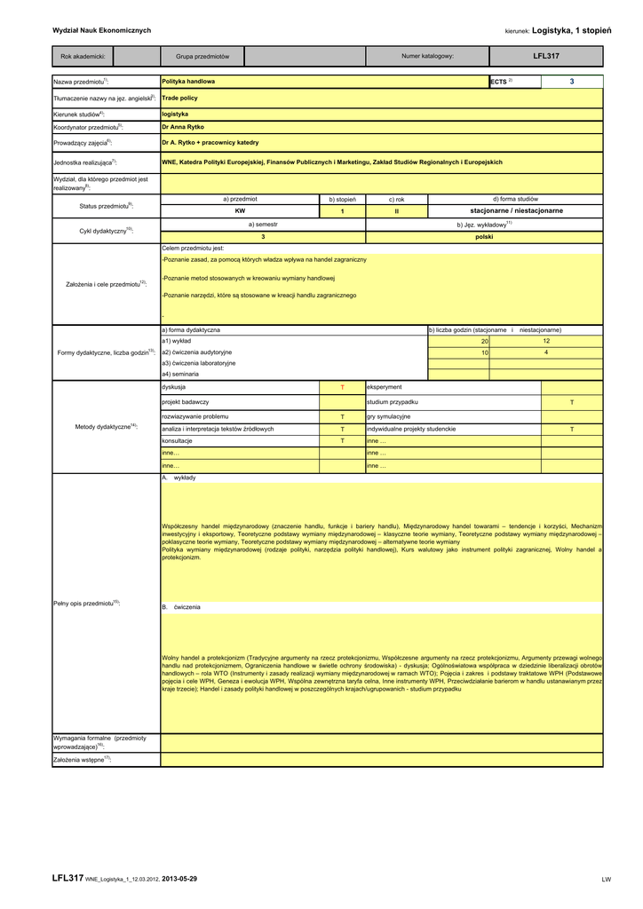 Wydział Nauk Ekonomicznych kierunek: Rok akademicki: Nazwa przedmiotu1): LFL317 Numer katalogowy: Grupa przedmiotów Logistyka, 1 stopień 3 ECTS 2) Polityka handlowa 3) Tłumaczenie nazwy na jęz. angielski : Trade policy Kierunek studiów4): logistyka 5) Koordynator przedmiotu : Dr Anna Rytko Prowadzący zajęcia6): Dr A. Rytko + pracownicy katedry Jednostka realizująca7): WNE, Katedra Polityki Europejskiej, Finansów Publicznych i Marketingu, Zakład Studiów Regionalnych i Europejskich Wydział, dla którego przedmiot jest realizowany8): Status przedmiotu9): a) przedmiot b) stopień c) rok d) forma studiów KW 1 II stacjonarne / niestacjonarne Cykl dydaktyczny10): a) semestr b) Jęz. wykładowy11) 3 polski Celem przedmiotu jest: -Poznanie zasad, za pomocą których władza wpływa na handel zagraniczny Założenia i cele przedmiotu12): -Poznanie metod stosowanych w kreowaniu wymiany handlowej -Poznanie narzędzi, które są stosowane w kreacji handlu zagranicznego a) forma dydaktyczna Formy dydaktyczne, liczba godzin13): b) liczba godzin (stacjonarne i niestacjonarne) a1) wykład 20 12 a2) ćwiczenia audytoryjne 10 4 a3) ćwiczenia laboratoryjne a4) seminaria dyskusja T projekt badawczy Metody dydaktyczne14): eksperyment studium przypadku rozwiazywanie problemu T analiza i interpretacja tekstów źródłowych T indywidualne projekty studenckie konsultacje T inne … gry symulacyjne inne… inne … inne… inne … A. T T wykłady Współczesny handel międzynarodowy (znaczenie handlu, funkcje i bariery handlu), Międzynarodowy handel towarami – tendencje i korzyści, Mechanizm inwestycyjny i eksportowy, Teoretyczne podstawy wymiany międzynarodowej – klasyczne teorie wymiany, Teoretyczne podstawy wymiany międzynarodowej – poklasyczne teorie wymiany, Teoretyczne podstawy wymiany międzynarodowej – alternatywne teorie wymiany Polityka wymiany międzynarodowej (rodzaje polityki, narzędzia polityki handlowej), Kurs walutowy jako instrument polityki zagranicznej, Wolny handel a protekcjonizm. Pełny opis przedmiotu15): B. ćwiczenia Wolny handel a protekcjonizm (Tradycyjne argumenty na rzecz protekcjonizmu, Współczesne argumenty na rzecz protekcjonizmu, Argumenty przewagi wolnego handlu nad protekcjonizmem, Ograniczenia handlowe w świetle ochrony środowiska) - dyskusja; Ogólnoświatowa współpraca w dziedzinie liberalizacji obrotów handlowych – rola WTO (Instrumenty i zasady realizacji wymiany międzynarodowej w ramach WTO); Pojęcia i zakres i podstawy traktatowe WPH (Podstawowe pojęcia i cele WPH, Geneza i ewolucja WPH, Wspólna zewnętrzna taryfa celna, Inne instrumenty WPH, Przeciwdziałanie barierom w handlu ustanawianym przez kraje trzecie); Handel i zasady polityki handlowej w poszczególnych krajach/ugrupowanich - studium przypadku Wymagania formalne (przedmioty wprowadzające)16): Założenia wstępne17): LFL317 WNE_Logistyka_1_12.03.2012, 2013-05-29 LW Wydział Nauk Ekonomicznych kierunek: Logistyka, 1 stopień 01 - definiuje pojęcia przedstawiane w ramach tematyki wykładów i ćwiczeń 05 - potrafi wykorzystać wiedzę teoretyczną do analizy studium przypadku Efekty kształcenia18): (z kolejnymi numerami, 01, 02, 03 itd.) 02 - potrafi opisać relacje między państwami/ ugrupowaniami i ich wpły na 06 - sporządzić pisemną pracę semestralną - studium przypadku wybranego kraju, rodzaj stosowanej polityki handlowej ugrupowania integracyjnego 03 - zna zasady i reguły wymiany handlowej funkcjonujące w ramach poszczególnych polityk handlowych 07 - potrafi uporządkować i ustnie zaprezentować posiadaną wiedzę na temat handlu i polityki handlowej stosowanej w poszczególnych krajach, ugrupowaniach, organizacjach. 04 - potrafi, wymienić, scharakteryzować pszczególne instrumenty i narzędzia polityki handlowej 08 - posiada swiadomość uzupełniania własnej wiedzy kolokwium na zajęciach ćwiczeniowych 01, 02, 03.04,05 praca pisemna przygotowywana w ramach pracy własnej studenta 01,02,03,04,05, ocena wynikająca z obserwacji w trakcie zajęć 06, 08 ocena eksperymentów wykonywanych w trakcie zajęć przygotowanie zespołowej analizy zdefiniowanego problemu 01,02,03,04,05, obserwacja w trakcie dyskusji zdefiniowanego problemu (aktywność) 07, 08 ocena wykonanie zadania projektowego na zdefiniowany temat Sposób weryfikacji efektów kształcenia19): ocena wystąpień i prezentacji w trakcie zajęć egzamin pisemny test komputerowy egzamin ustny inne.. inne… okresowe prace pisemne Forma dokumentacji osiągniętych efektów kształcenia 20): inne.. T złożone projekty referaty Elementy i wagi mające wpływ na ocenę końcową21): imienne karty oceny studenta treść pytań egzaminacyjnych z oceną T inne… Element oceny 01,02,03,04,05,07 lista obecności z uwagami T inne.. Waga w % kolokwium na zajęciach ćwiczeniowych 80% praca pisemna przygotowywana w ramach pracy własnej studenta 10% Element oceny ocena wykonania zadania projektowego na zdefiniowany temat ocena wynikająca z obserwacji w trakcie zajęć ocena eksperymentów wykonywanych w trakcie zajęć przygotowanie zespołowej analizy zdefiniowanego problemu ocena wystąpień i prezentacji w trakcie zajęć obserwacja w trakcie dyskusji zdefiniowanego problemu (aktywność) 5% egzamin pisemny test egzamin ustny inne.. inne… Miejsce realizacji zajęć22): Waga w % 5% inne.. sala dydaktyczna Literatura podstawowa i uzupełniająca23): a) podstawowa 1.Guzek M. 2006: Miedzynarodowe stosunki gospodarcze. Zarys teorii i polityki handlowej, PWE, Warszawa. 2.Rynarzewski T., Zielińska-Głębocka A, 2006: Międzynarodowe Stosunki Gospodarcze, Teoria wymiany i polityki handlowej, PWN b) uzupełniająca 3. Budnikowski A. 2006; Międzynarodowe stosunki gospodarcze, PWE, Warszawa. 4. Rytko A. 2003. Środkowoeuropejskie Porozumienie Wolnego Handlu CEFTA jako stadium rozwoju integracji europejskiej w sferze rolnictwa i gospodarki żywnościowej, Wydawnictwo SGGW, Warszawa. 5. Molle W. 2000: Ekonom