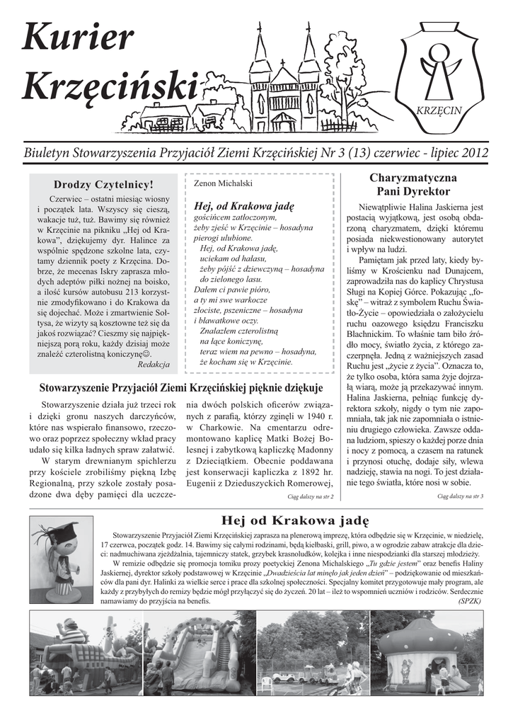 Kurier Krzęciński KRZĘCIN Biuletyn Stowarzyszenia Przyjaciół Ziemi Krzęcińskiej Nr 3 (13) czerwiec - lipiec 2012 Drodzy Czytelnicy! Czerwiec – ostatni miesiąc wiosny i początek lata. Wszyscy się cieszą, wakacje tuż, tuż. Bawimy się również w Krzęcinie na pikniku „Hej od Krakowa”, dziękujemy dyr. Halince za wspólnie spędzone szkolne lata, czytamy dziennik poety z Krzęcina. Dobrze, że mecenas Iskry zaprasza młodych adeptów piłki nożnej na boisko, a ilość kursów autobusu 213 korzystnie zmodyfikowano i do Krakowa da się dojechać. Może i zmartwienie Sołtysa, że wizyty są kosztowne też się da jakoś rozwiązać? Cieszmy się najpiękniejszą porą roku, każdy dzisiaj może znaleźć czterolistną koniczynę☺. Redakcja Charyzmatyczna Pani Dyrektor Zenon Michalski Hej, od Krakowa jadę nia dwóch polskich oficerów związanych z parafią, którzy zginęli w 1940 r. w Charkowie. Na cmentarzu odremontowano kaplicę Matki Bożej Bolesnej i zabytkową kapliczkę Madonny z Dzieciątkiem. Obecnie poddawana jest konserwacji kapliczka z 1892 hr. Eugenii z Dzieduszyckich Romerowej, Niewątpliwie Halina Jaskierna jest postacią wyjątkową, jest osobą obdarzoną charyzmatem, dzięki któremu posiada niekwestionowany autorytet i wpływ na ludzi. Pamiętam jak przed laty, kiedy byliśmy w Krościenku nad Dunajcem, zaprowadziła nas do kaplicy Chrystusa Sługi na Kopiej Górce. Pokazując „foskę” – witraż z symbolem Ruchu Światło-Życie – opowiedziała o założycielu ruchu oazowego księdzu Franciszku Blachnickim. To właśnie tam biło źródło mocy, światło życia, z którego zaczerpnęła. Jedną z ważniejszych zasad Ruchu jest „życie z życia”. Oznacza to, że tylko osoba, która sama żyje dojrzałą wiarą, może ją przekazywać innym. Halina Jaskierna, pełniąc funkcję dyrektora szkoły, nigdy o tym nie zapomniała, tak jak nie zapomniała o istnieniu drugiego człowieka. Zawsze oddana ludziom, spieszy o każdej porze dnia i nocy z pomocą, a czasem na ratunek i przynosi otuchę, dodaje siły, wlewa nadzieję, stawia na nogi. To jest działanie tego światła, które nosi w sobie. Ciąg dalszy na str 2 Ciąg dalszy na str 3 gościńcem zatłoczonym, żeby zjeść w Krzęcinie – hosadyna pierogi ulubione. Hej, od Krakowa jadę, uciekam od hałasu, żeby pójść z dziewczyną – hosadyna do zielonego lasu. Dałem ci pawie pióro, a ty mi swe warkocze złociste, pszeniczne – hosadyna i bławatkowe oczy. Znalazłem czterolistną na łące koniczynę, teraz wiem na pewno – hosadyna, że kocham się w Krzęcinie. Stowarzyszenie Przyjaciół Ziemi Krzęcińskiej pięknie dziękuje Stowarzyszenie działa już trzeci rok i dzięki gronu naszych darczyńców, które nas wspierało finansowo, rzeczowo oraz poprzez społeczny wkład pracy udało się kilka ładnych spraw załatwić. W starym drewnianym spichlerzu przy kościele zrobiliśmy piękną Izbę Regionalną, przy szkole zostały posadzone dwa dęby pamięci dla uczcze- Hej od Krakowa jadę Stowarzyszenie Przyjaciół Ziemi Krzęcińskiej zaprasza na plenerową imprezę, która odbędzie się w Krzęcinie, w niedzielę, 17 czerwca, początek godz. 14. Bawimy się całymi rodzinami, będą kiełbaski, grill, piwo, a w ogrodzie zabaw atrakcje dla dzieci: nadmuchiwana zjeżdżalnia, tajemniczy statek, grzybek krasnoludków, kolejka i inne niespodzianki dla starszej młodzieży. W remizie odbędzie się promocja tomiku prozy poetyckiej Zenona Michalskiego „Tu gdzie jestem” oraz benefis Haliny Jaskiernej, dyrektor szkoły podstawowej w Krzęcinie „Dwadzieścia lat minęło jak jeden dzień” – podziękowanie od mieszkańców dla pani dyr. Halinki za wielkie serce i prace dla szkolnej społeczności. Specjalny komitet przygotowuje mały program, ale każdy z przybyłych do remizy będzie mógł przyłączyć się do życzeń. 20 lat – ileż to wspomnień uczniów i rodziców. Serdecznie namawiamy do przyjścia na benefis. (SPZK) 2 Kurier Krzęciński 3(13)/2012 Aktualności Sołtysa! Od 12 maja br. nastąpiła zmiana rozkładu jazdy linii nr 213 MPK Kraków, jest 9 połączeń bezpośrednich do Krakowa – Łagiewnik z Krzęcina, pozostałe kursy są do Skawiny. Nastąpiła również zmiana rozkładu w soboty i święta z uwzględnieniem dojazdów do Kościoła. Sprawa przemieszczenia przystanków na „Dąbrówkach” jest w trakcie załatwiania, jak również oznakowanie przejścia dla pieszych przy Kościele. Jest to w gestii Zarządu Dróg Powiatu Krakowskiego. W kwietniu Sołectwo wystąpiło z pismem do UMiG w Skawinie w sprawie uruchomienia projektu budowy zatoki autobusowej na drodze krajowej nr 44 obok „Centrum Delikatesy”. Niedługo rozpocznie się budowa planowanych dróg gminnych. Projekt „Solary” będzie uruchomiony na przestrzeni III i IV kwartału br. Przeprowadziłem dwie rozmowy z władzami Gminy Krzęcin woj. Zachodnio-Pomorskie w celu nawiązania kontaktu między naszymi miejscowościami, lecz trzeba mieć świadomość o kosztach wizyt Gości i rewizyt przedstawicieli naszych miejscowości. Jeśli znajdą się środki na ten cel, to zdecydujemy o zaproszeniu oficjalnym! Z poważaniem Sołtys-Antoni Bylica Stowarzyszenie Przyjaciół Ziemi Krzęcińskiej pięknie dziękuje Ciąg dalszy ze str 1 żony Wilhelma Romera współzałożyciela Kółka Rolniczego w Krzęcinie. Zorganizowano kilka udanych imprez: w maju zeszłego roku „Wieczór wspomnień o błogosławionym Janie Pawle II”, koncerty kolęd z udziałem orkiestry Strażak, pań z KGW oraz dzieci ze szkół podstawowych w Krzęcinie i Zelczynie weszły na stałe do styczniowego kalendarza, piknik rodzinny „Hej od Krakowa jadę” ma już drugą edycję. W zeszłym roku SPZK wydało własnym sumptem tomik wierszy H. Lelek „Z różańcem w ręku”, w tym roku przy wsparciu finansowym Gminy Skawina wydany został tomik prozy poetyckiej Z. Michalskiego „Tu gdzie jestem”. Co roku, 1
