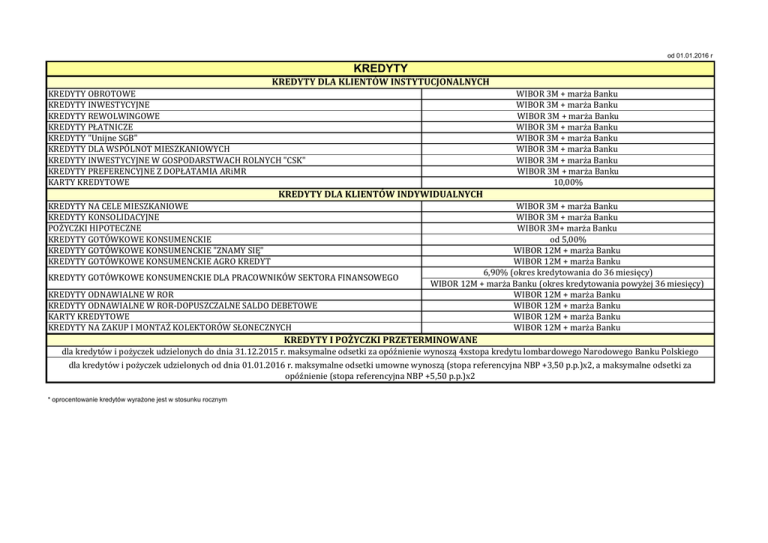 od 01.01.2016 r KREDYTY KREDYTY DLA KLIENTÓW INSTYTUCJONALNYCH KREDYTY OBROTOWE KREDYTY INWESTYCYJNE KREDYTY REWOLWINGOWE KREDYTY PŁATNICZE KREDYTY "Unijne SGB" KREDYTY DLA WSPÓLNOT MIESZKANIOWYCH KREDYTY INWESTYCYJNE W GOSPODARSTWACH ROLNYCH "CSK" KREDYTY PREFERENCYJNE Z DOPŁATAMIA ARiMR KARTY KREDYTOWE WIBOR 3M + marża Banku WIBOR 3M + marża Banku WIBOR 3M + marża Banku WIBOR 3M + marża Banku WIBOR 3M + marża Banku WIBOR 3M + marża Banku WIBOR 3M + marża Banku WIBOR 3M + marża Banku 10,00% KREDYTY DLA KLIENTÓW INDYWIDUALNYCH KREDYTY NA CELE MIESZKANIOWE KREDYTY KONSOLIDACYJNE POŻYCZKI HIPOTECZNE KREDYTY GOTÓWKOWE KONSUMENCKIE KREDYTY GOTÓWKOWE KONSUMENCKIE "ZNAMY SIĘ" KREDYTY GOTÓWKOWE KONSUMENCKIE AGRO KREDYT KREDYTY GOTÓWKOWE KONSUMENCKIE DLA PRACOWNIKÓW SEKTORA FINANSOWEGO KREDYTY ODNAWIALNE W ROR KREDYTY ODNAWIALNE W ROR-DOPUSZCZALNE SALDO DEBETOWE KARTY KREDYTOWE KREDYTY NA ZAKUP I MONTAŻ KOLEKTORÓW SŁONECZNYCH WIBOR 3M + marża Banku WIBOR 3M + marża Banku WIBOR 3M+ marża Banku od 5,00% WIBOR 12M + marża Banku WIBOR 12M + marża Banku 6,90% (okres kredytowania do 36 miesięcy) WIBOR 12M + marża Banku (okres kredytowania powyżej 36 miesięcy) WIBOR 12M + marża Banku WIBOR 12M + marża Banku WIBOR 12M + marża Banku WIBOR 12M + marża Banku KREDYTY I POŻYCZKI PRZETERMINOWANE dla kredytów i pożyczek udzielonych do dnia 31.12.2015 r. maksymalne odsetki za opóźnienie wynoszą 4xstopa kredytu lombardowego Narodowego Banku Polskiego dla kredytów i pożyczek udzielonych od dnia 01.01.2016 r. maksymalne odsetki umowne wynoszą (stopa referencyjna NBP +3,50 p.p.)x2, a maksymalne odsetki za opóźnienie (stopa referencyjna NBP +5,50 p.p.)x2 * oprocentowanie kredytów wyrażone jest w stosunku rocznym