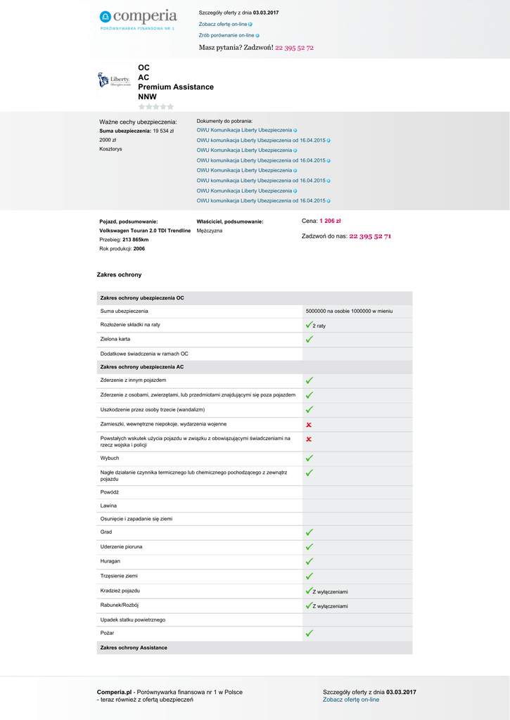 Szczegóły oferty z dnia 03.03.2017 Zobacz ofertę on-line Zrób porównanie on-line Masz pytania? Zadzwoń! 22 395 52 72 OC AC Premium Assistance NNW Ważne cechy ubezpieczenia: Dokumenty do pobrania: Suma ubezpieczenia: 19 534 zł OWU Komunikacja Liberty Ubezpieczenia 2000 zł OWU komunikacja Liberty Ubezpieczenia od 16.04.2015 Kosztorys OWU Komunikacja Liberty Ubezpieczenia OWU komunikacja Liberty Ubezpieczenia od 16.04.2015 OWU Komunikacja Liberty Ubezpieczenia OWU komunikacja Liberty Ubezpieczenia od 16.04.2015 OWU Komunikacja Liberty Ubezpieczenia OWU komunikacja Liberty Ubezpieczenia od 16.04.2015 Pojazd, podsumowanie: Właściciel, podsumowanie: Volkswagen Touran 2.0 TDI Trendline Mężczyzna Przebieg: 213 865km Cena: 1 206 zł Zadzwoń do nas: 22 395 52 71 Rok produkcji: 2006 Zakres ochrony Zakres ochrony ubezpieczenia OC Suma ubezpieczenia Rozłożenie składki na raty 5000000 na osobie 1000000 w mieniu 2 raty Zielona karta Dodatkowe świadczenia w ramach OC Zakres ochrony ubezpieczenia AC Zderzenie z innym pojazdem Zderzenie z osobami, zwierzętami, lub przedmiotami znajdującymi się poza pojazdem Uszkodzenie przez osoby trzecie (wandalizm) Zamieszki, wewnętrzne niepokoje, wydarzenia wojenne Powstałych wskutek użycia pojazdu w związku z obowiązującymi świadczeniami na rzecz wojska i policji Wybuch Nagłe działanie czynnika termicznego lub chemicznego pochodzącego z zewnątrz pojazdu Powódź Lawina Osunięcie i zapadanie się ziemi Grad Uderzenie pioruna Huragan Trzęsienie ziemi Kradzież pojazdu Z wyłączeniami Rabunek/Rozbój Z wyłączeniami Upadek statku powietrznego Pożar Zakres ochrony Assistance Comperia.pl - Porównywarka finansowa nr 1 w Polsce - teraz również z ofertą ubezpieczeń Szczegóły oferty z dnia 03.03.2017 Zobacz ofertę on-line Szczegóły oferty z dnia 03.03.2017 Zobacz ofertę on-line Zrób porównanie on-line Masz pytania? Zadzwoń! 22 395 52 72 Suma ubezpieczenia Brak Zakres terytorialny Polska i Europa Wiek pojazdu do którego można wykupić ubezpieczenie Do 12 lat Rodzaj pojazdu na który można wykupić ubezpieczenie Samochody osobowe i ciężarowe Ograniczenia ze względu na sposób użytkowania pojazdu (np. taxi, nauka jazdy, rent a car) Nie są objęte ubezpieczeniem Opcje zawarcia Tylko z OC lub z OC i AC Usprawnienie pojazdu na miejscu zdarzenia Do wysokości 600 zł. (na terytorium Polski lub 500 euro (za granicą) oraz naprawa nie przekroczy 1 godziny Pomoc w razie awarii Pomoc w razie wypadku Limit odległości od miejsca zamieszkania 150 km od miejsca zdarzenia Miejsce holowania Do warsztatu lub do najbliższego miejsca czasowego postoju położonego w odległości nie większej niż 150 km od miejsca zdarzenia Samochód zastępczy Po wypadku i kradzieży (bez względu na odległość miejsca zdarzenia od miejsca zamieszkania), po awarii tylko w sytuacji gdy awaria nastąpiła w odległości co najmniej 50 km od miejsca zamieszkani Ubezpieczonego Złomowanie pojazdu Parkowanie pojazdu Do 4 dób do wysokości 50 zł. na terytorium Polski lub 30 euro za granicą . Świadczenie przysługuje tylko gdy unieruchomienie nastąpiło powyżej 50 km od miejsca zamieszkaniaUbezpieczonego Transport zastępczy/przewóz osób O ile unieruchomienie na skutek awarii lub wypadku miało miejsce w odległości 50 km od początku lub celu podróży Nocleg/zakwaterowanie Maksymalnie 1 doba, o ile unieruchomienie na skutek awarii lub wypadku miało miejsce w odległości 50 km od początku lub celu podróży Dodatkowe informacje Pomoc przy wymianie koła, holowanie pojazdu poszkodowanego, pomoc przy otwarciu pojazdu, dowóz paliwa lub pomoc w przypadku zatankowani niewłaściwego paliwa, pomoc w przypadku zagubienia lub uszkodzenia kluczyków, dostarczenie części zamiennych, odbiór pojazdu po naprawie, kierowca zastępczy, przewóz medyczny, opieka nad dziećmi dostawa leków Zakres ochrony NNW Suma ubezpieczenia Wypłata świadczenia w razie śmierci Śmierć ubezpieczonego, o ile śmierć była następstwem nieszczęśliwego wypadku i nastąpiła przed upływem 2 lat od dnia wypadku -100% świadczenia Wsiadanie i wysiadanie z pojazdu Załadowanie lub wyładowanie pojazdu Pożar, wybuch pojazdu Zatrzymanie, postój, naprawa pojazdu Podwójne świadczenie w przypadku 90% trwałego uszczerbku na zdrowiu Garażowanie pojazdu Terytorium ochrony Terytorium ochrony ubezpieczenia AC Comperia.pl - Porównywarka finansowa nr 1 w Polsce - teraz również z ofertą ubezpieczeń Szczegóły oferty z dnia 03.03.2017 Zobacz ofertę on-line Szczegóły oferty z dnia 03.03.2017 Zobacz ofertę on-line Zrób porównanie on-line Masz pytania? Zadzwoń! 22 395 52 72 Kraje Unii Europejskiej Algeria Albania Libia Maroko Mołdawia Białoruś Bez kradzieży i wandalizmu Rosja (część europejska) Czarnogóra Serbia Bośnia i Hercegowina Tunezja Iran Turcja Izrael Ukraina Bez kradzieży i wandalizmu Wyłączenia Wyłączenia ubezpieczenia AC Udział własny w szkodzie Wprowadzony ( jego udział ustala się na etapie zawierania umowy) Amortyzacja za części Do 3 lat 20%; 3-5 lat 35%; 5-8 lat 45%; 8 lat i więcej 55% Rodzaj stacji naprawczej (ze względu na metodę naprawy) Warsztaty nieautoryzowane Rodzaj używanych części do naprawy Części zamienne o porównywalnej jakości Okres eksploatacji pojazdu w jakim można wykupić polisę AutoCasco Do 12 lat Minimalna szkoda (franszyza integralna) 200 zł. Szkoda została spowodowana wskutek rażącego niedbalstwa Nie wypłaci Kierowanie pojazdem w stanie nietrzeźwości, po zażyciu alkoholu, środków odurzających, substancji psychotropowych, lub jego pochodnych Nie wypłaci Kierujący pojazdem nie posiadał uprawnień do prowadzenia pojazdu Nie wypłaci Sprawca zbiegł lub oddalił się z miejsca zdarzenia nie wypłaci Pojazd nie miał ważnego przeglądu technicznego lub nie jest dopuszczony do ruchu Nie wypłaci Przywłaszczenie pojazdu Nie wypłaci Kradzież wyposażenia dodatkowego Uszkodzenie wyposażenia 
