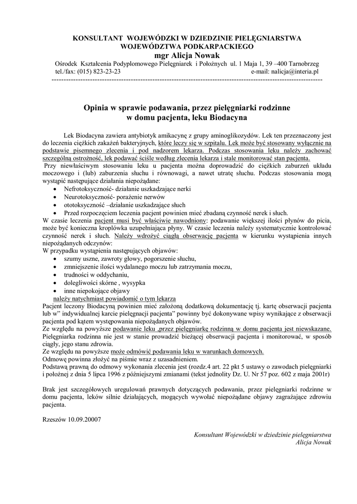 KONSULTANT WOJEWÓDZKI W DZIEDZINIE PIELĘGNIARSTWA WOJEWÓDZTWA PODKARPACKIEGO mgr Alicja Nowak Ośrodek Kształcenia Podyplomowego Pielęgniarek i Położnych ul. 1 Maja 1, 39 –400 Tarnobrzeg tel./fax: (015) 823-23-23 e-mail: [email protected] ----------------------------------------------------------------------------------------------------------------- Opinia w sprawie podawania, przez pielęgniarki rodzinne w domu pacjenta, leku Biodacyna Lek Biodacyna zawiera antybiotyk amikacynę z grupy aminoglikozydów. Lek ten przeznaczony jest do leczenia ciężkich zakażeń bakteryjnych, które leczy się w szpitalu. Lek może być stosowany wyłącznie na podstawie pisemnego zlecenia i pod nadzorem lekarza. Podczas stosowania leku należy zachować szczególną ostrożność, lek podawać ściśle według zlecenia lekarza i stale monitorować stan pacjenta. Przy niewłaściwym stosowaniu leku u pacjenta można doprowadzić do ciężkich zaburzeń układu moczowego i (lub) zaburzenia słuchu i równowagi, a nawet utratę słuchu. Podczas stosowania mogą wystąpić następujące działania niepożądane: Nefrotoksyczność- działanie uszkadzające nerki Neurotoksyczność- porażenie nerwów ototoksyczność –działanie uszkadzające słuch Przed rozpoczęciem leczenia pacjent powinien mieć zbadaną czynność nerek i słuch. W czasie leczenia pacjent musi być właściwie nawodniony: podawanie większej ilości płynów do picia, może być konieczna kroplówka uzupełniająca płyny. W czasie leczenia należy systematycznie kontrolować czynność nerek i słuch. Należy wdrożyć ciągłą obserwację pacjenta w kierunku wystąpienia innych niepożądanych odczynów: W przypadku wystąpienia następujących objawów: szumy uszne, zawroty głowy, pogorszenie słuchu, zmniejszenie ilości wydalanego moczu lub zatrzymania moczu, trudności w oddychaniu, dolegliwości skórne , wysypka inne niepokojące objawy należy natychmiast powiadomić o tym lekarza Pacjent leczony Biodacyną powinien mieć założoną dodatkową dokumentację tj. kartę obserwacji pacjenta lub w” indywidualnej karcie pielęgnacji pacjenta” powinny być dokonywane wpisy wynikające z obserwacji pacjenta pod kątem występowania niepożądanych objawów. Ze względu na powyższe podawanie leku ,przez pielęgniarkę rodzinną w domu pacjenta jest niewskazane. Pielęgniarka rodzinna nie jest w stanie prowadzić bieżącej obserwacji pacjenta i monitorować, w sposób ciągły, jego stanu zdrowia. Ze względu na powyższe może odmówić podawania leku w warunkach domowych. Odmowę powinna złożyć na piśmie wraz z uzasadnieniem. Podstawą prawną do odmowy wykonania zlecenia jest (rozdz.4 art. 22 pkt 5 ustawy o zawodach pielęgniarki i położnej z dnia 5 lipca 1996 z późniejszymi zmianami (tekst jednolity Dz. U. Nr 57 poz. 602 z maja 2001r) Brak jest szczegółowych uregulowań prawnych dotyczących podawania, przez pielęgniarki rodzinne w domu pacjenta, leków silnie działających, mogących wywołać niepożądane objawy zagrażające zdrowiu pacjenta. Rzeszów 10.09.20007 Konsultant Wojewódzki w dziedzinie pielęgniarstwa Alicja Nowak