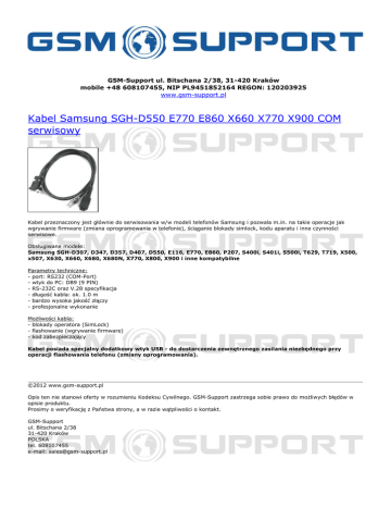 GSM-Support ul. Bitschana 2/38, 31-420 Kraków mobile +48 608107455, NIP PL9451852164 REGON: 120203925 www.gsm-support.pl Kabel Samsung SGH-D550 E770 E860 X660 X770 X900 COM serwisowy Kabel przeznaczony jest głównie do serwisowania w/w modeli telefonów Samsung i pozwala m.in. na takie operacje jak wgrywanie firmware (zmiana oprogramowania w telefonie), ściąganie blokady simlock, kodu aparatu i inne czynności serwisowe. Obsługiwane modele: Samsung SGH-D307, D347, D357, D407, D550, E116, E770, E860, P207, S400i, S401i, S500i, T629, T719, X500, x507, X630, X660, X680, X680N, X770, X800, X900 i inne kompatybilne Parametry techniczne: - port: RS232 (COM-Port) - wtyk do PC: DB9 (9 PIN) - RS-232C oraz V.28 specyfikacja - długość kabla: ok. 1.0 m - bardzo wysoka jakość złączy - profesjonalne wykonanie Możliwości kabla: - blokady operatora (SimLock) - flashowanie (wgrywanie firmware) - kod zabezpieczający Kabel posiada specjalny dodatkowy wtyk USB - do dostarczenia zewnętrznego zasilania niezbędnego przy operacji flashowania telefonu (zmiany oprogramowania). ©2012 www.gsm-support.pl Opis ten nie stanowi oferty w rozumieniu Kodeksu Cywilnego. GSM-Support zastrzega sobie prawo do możliwych błędów w opisie produktu. Prosimy o weryfikację z Państwa strony, a w razie wątpliwości o kontakt. GSM-Support ul. Bitschana 2/38 31-420 Kraków POLSKA tel. 608107455 e-mail: [email protected] Powered by TCPDF (www.tcpdf.org)