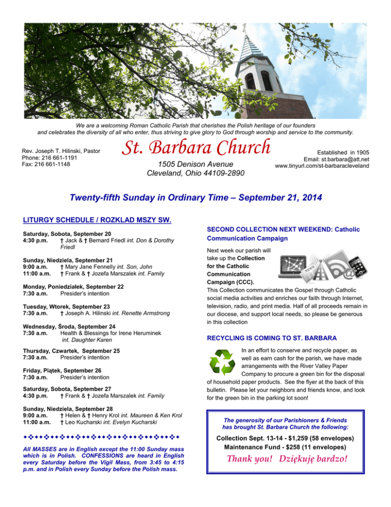 We are a welcoming Roman Catholic Parish that cherishes the Polish heritage of our founders and celebrates the diversity of all who enter, thus striving to give glory to God through worship and service to the community. Rev. Joseph T. Hilinski, Pastor Phone: 216 661-1191 Fax: 216 661-1148 St. Barbara Church 1505 Denison Avenue Cleveland, Ohio 44109-2890 Established in 1905 Email: [email protected] www.tinyurl.com/st-barbaracleveland Twenty-fifth Sunday in Ordinary Time – September 21, 2014 LITURGY SCHEDULE / ROZKLAD MSZY SW. Saturday, Sobota, September 20 4:30 p.m. † Jack & † Bernard Friedl int. Don & Dorothy Friedl Sunday, Niedziela, September 21 9:00 a.m. † Mary Jane Fennelly int. Son, John 11:00 a.m. † Frank & † Jozefa Marszalek int. Family Monday, Poniedziałek, September 22 7:30 a.m. Presider’s intention Tuesday, Wtorek, September 23 7:30 a.m. † Joseph A. Hilinski int. Renette Armstrong Wednesday, Środa, September 24 7:30 a.m. Health & Blessings for Irene Heruminek int. Daughter Karen Thursday, Czwartek, September 25 7:30 a.m. Presider’s intention Friday, Piątek, September 26 7:30 a.m. Presider’s intention Saturday, Sobota, September 27 4:30 p.m. † Frank & † Jozefa Marszalek int. Family Sunday, Niedziela, September 28 9:00 a.m. † Helen & † Henry Krol int. Maureen & Ken Krol 11:00 a.m. † Leo Kucharski int. Evelyn Kucharski All MASSES are in English except the 11:00 Sunday mass which is in Polish. CONFESSIONS are heard in English every Saturday before the Vigil Mass, from 3:45 to 4:15 p.m. and in Polish every Sunday before the Polish mass. SECOND COLLECTION NEXT WEEKEND: Catholic Communication Campaign Next week our parish will take up the Collection for the Catholic Communication Campaign (CCC). This Collection communicates the Gospel through Catholic social media activities and enriches our faith through Internet, television, radio, and print media. Half of all proceeds remain in our diocese, and support local needs, so please be generous in this collection RECYCLING IS COMING TO ST. BARBARA In an effort to conserve and recycle paper, as well as earn cash for the parish, we have made arrangements with the River Valley Paper Company to procure a green bin for the disposal of household paper products. See the flyer at the back of this bulletin. Please let your neighbors and friends know, and look for the green bin in the parking lot soon! The generosity of our Parishioners & Friends has brought St. Barbara Church the following: Collection Sept. 13-14 - $1,259 (58 envelopes) Maintenance Fund - $258 (11 envelopes) Thank you! Dziękuję bardzo! Please remember in your prayers Prayer List Patrick Kocon Please pray for our parishioners who are ill and all who are in need of our prayers: Funeral Mass was at St. Barbara’s on September 12 Joseph A. Hilinski Father of our Pastor, Fr. Joseph T. Hilinski. Funeral Mass was at St. Anthony of Padua Church on September 15. May they rest in peace HEARTFELT THANKS Fr. Joe would like to thank all who attended the wake and the funeral mass for his father, Joseph A. Hilinski, and all those who sent cards. Your prayers and your thoughtfulness are greatly appreciated by Fr. Joe and his family. THE ELEANOR MALBURG EASTERN CHURCHES SEMINAR -- Icons: Witnesses to Christian Faith & Life Friday, October 10 – at Holy Trinity Orthodox Church, 6822 Broadview Road, Parma OH 44134. 6:30 p.m. Registration, 7:00 p.m. Prayer, 7:30 p.m. “Icons: Witnesses to Christian Faith and Life”. Protopresbyter Thomas Hopko, Ph.D., dean emeritus, n St. Vladimir Orthodox Theological Seminary, Crestwood, N.Y. Reception & Refreshments Saturday, October 11 – at Notre Dame College, 4545 College Road, South Euclid, OH 44121, Administration Building, “Great Room,” 3rd floor. 8:30 a.m. Registration, 9:00 a.m. Welcome Moderator – Fr. Joseph Hilinski, Delegate for Ecumenical and Interfaith Affairs & Director of the Office of Continuing Education & Formation of Ministers for the Catholic Diocese of Cleveland; Pastor, St. Barbara Catholic Church, Cleveland Henry Arslanian, Phyllis Bobko Loretta Budzinski, Donna Cuevas, Donald Friedl Irene Heruminek, Eleanor Hodel Dorothy Noga, Kelli Shea, Doris Wojton Dora Wotowiec, Jeanette Woznicki OD KS. ANDRZEJA … DLACZEGO ZNOWU FRANCJA… -- PROCES KANONIZACYJNY KS. JERZEGO POPIELUSZKI 20 wrzesnia we francuskiej diecezji Cretel rusza process o uznanie cudu uzdrowienia 56 mezczyzny ze zlosliwego nowotwora krwi. Chory na bialaczke szpikowa Francois Audelan , 2 lata temu byl w stanie agonalnym,a zona przygotowywala juz formalnosci pogrzebowe, wybrala tez dla meza debowa trumne, i stal sie cud. Dpkladnie w rocznice urodzin Ksiedza Jerzego, 14 wrzesnia 2012, po modlitwie francuskiego ksiedza i polskiej zakonnicy przy relikwiach ksiedza Jerzego zlozonych na szpitalnym luzku umierajacego mezczyzny, powrocil on do zycia. Mozna sie zastanawiac, dlaczego Pan Bog ponownie wybral Francje na miejsce cudownego dzialania. Niedawno przeciez sledzilismy przypadek francuskiej zakonnicy, ktorej uzdrowienie zostalo uznane za cud do beatyfikacji Jana Pawla II. Siostra Marie Normand wurazila opinie, ze moze tutaj chodzic o plan Boga dotyczacy nawrocenia najstarszej cory Kosciola. Przypomne, ze Jan Pawel II w 1980 roku zadal dramatyczne pytanie: ”Francjo,co uczynilas ze swoim chrztem?” Uzdrowiona siostra powiedziala niedawno - Francja potrzebowala bardzo tej nowej wizyty Jana Pawla II, by nie utracic swych korzeni. A teraz wizyte we Francji zlozyl bl. ks.Jerzy Popieluszko. Bozy znak dokonany we Francji za wstawiennictwem ks. Jerzego jest kolejnym sygnalem dla niedowiarkow, swiadczacym o tym, ze Bog istnieje i objawia sie przez nadprzyrodzone znaki. Dzisiejszy swiat uciekajacy od Boga potrzebuje tych znakow z nieba. “Religious Art in Armenian Theology” , Rev. Archpriest Garabed Kochakian, M.Div., M.A., Pastor, St. John’s Armenian Church, Southfield, Mich. 10:00 A.M. Brunch, 10:45 A.M. “Russian and Byzantine Icons -- St