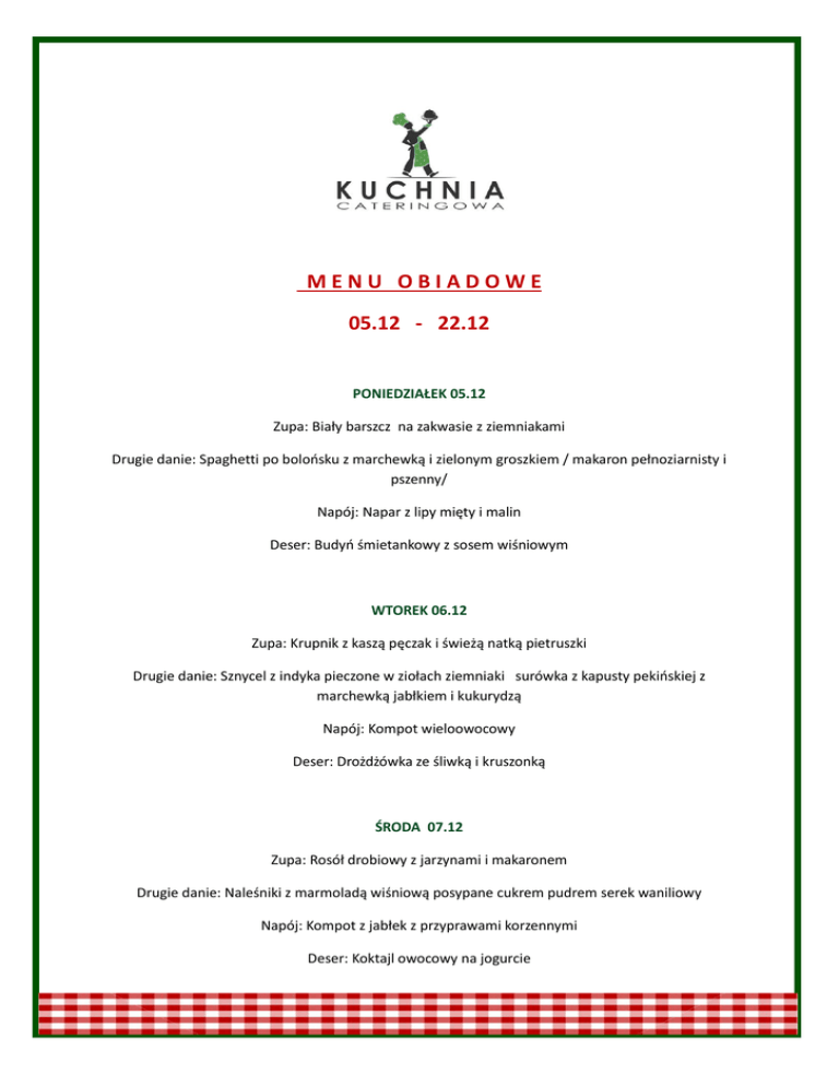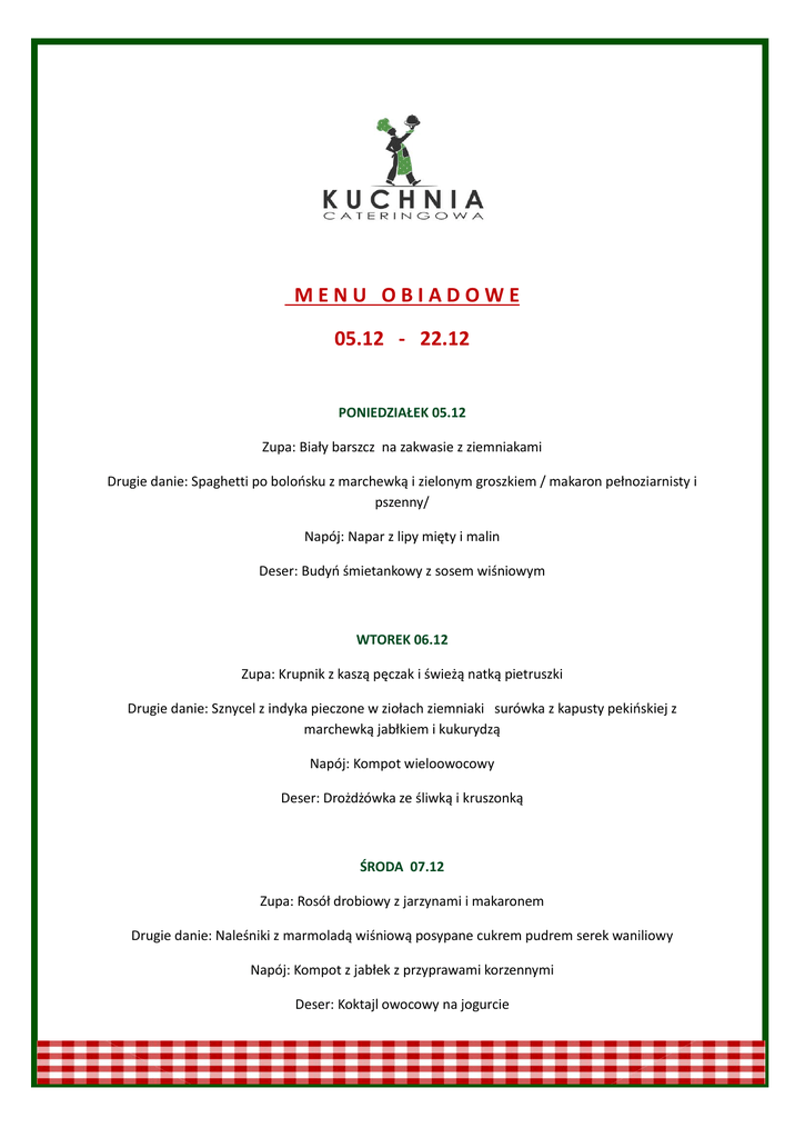 MENU OBIADOWE 05.12 - 22.12 PONIEDZIAŁEK 05.12 Zupa: Biały barszcz na zakwasie z ziemniakami Drugie danie: Spaghetti po bolońsku z marchewką i zielonym groszkiem / makaron pełnoziarnisty i pszenny/ Napój: Napar z lipy mięty i malin Deser: Budyń śmietankowy z sosem wiśniowym WTOREK 06.12 Zupa: Krupnik z kaszą pęczak i świeżą natką pietruszki Drugie danie: Sznycel z indyka pieczone w ziołach ziemniaki surówka z kapusty pekińskiej z marchewką jabłkiem i kukurydzą Napój: Kompot wieloowocowy Deser: Drożdżówka ze śliwką i kruszonką ŚRODA 07.12 Zupa: Rosół drobiowy z jarzynami i makaronem Drugie danie: Naleśniki z marmoladą wiśniową posypane cukrem pudrem serek waniliowy Napój: Kompot z jabłek z przyprawami korzennymi Deser: Koktajl owocowy na jogurcie CZWARTEK 08.12 Zupa: Jarzynowa z makaronem muszelki Drugie danie: Kurczak duszony w sosie pieczeniowym kasza kuskus z warzywami surówka z czerwonej kapusty Napój: Lemoniada pomarańczowa Deser: Ciastko kokosowe PIĄTEK 09.12 Zupa: Szczawiowa z jajkiem Drugi danie: Nuggetsy rybne puree ziemniaczane z koperkiem gotowana kiszona kapusta z jabłkiem i kminkiem Napój: Herbata Rooibos z cytryną Deser: Brownie z kaszy jaglanej PONIEDZIAŁEK 12.12 Zupa: Kalafiorowa z ziemniakami Drugie danie: Gulasz warzywny z mięsem drobiowym pyzy drożdżowe na parze surówka z czerwonych buraczków z natką pietruszki/ ogórek kiszony Napój: Napar z mięty i rumianku Deser: Jogurt naturalny z pieczoną śliwką WTOREK 13.12 Zupa: Ogórkowa zabielana z mięsem i koperkiem Drugie danie: Pierogi z serem polane sosem śmietanowym prażone jabłko z cynamonem Napój: Kompot wieloowocowy Deser: Ciasto marchewkowe z kremem budyniowym ŚRODA 14.12 Zupa: Zupa z czerwonej soczewicy i pomidorów z makaronem Drugie danie: Bitki wieprzowe duszone w sosie ziołowo cebulowym kasza gryczana niepalona blanszone warzywa – kalafior, marchew, brokuł Napój: Herbata Rooibos goździkowo cynamonowa Deser: Ciasto drożdżowe z owocami i kruszonką CZWARTEK 15.12 Zupa: Krupnik z kaszą jęczmienną i natką pietruszki Drugie danie: Pieczone w ziołach pałki kurczaka ryż paraboliczny zasmażany z warzywami surówka z białej kapusty z koperkiem Napój: Kompot z jabłek i porzeczek Deser: Ślimaczki cynamonowe PIĄTEK 16.12 Zupa: Barszcz czerwony z białą fasolą i natką pietruszki Drugie danie: Kotlet rybny z warzywami puree ziemniaczane z koperkiem surówka z kiszonej kapusty jabłka i natki pietruszki Napój: Herbata Rooibos pomarańczowa Deser: Budyń śmietankowy z sosem truskawkowo wiśniowym PONIEDZIAŁEK 19.12 Zupa: Zupa ziemniaczana z kawałkami mięsa Drugie danie: Makaron tagiatella z sosem pomidorowym i serem mozzarella posypany świeżą natką pietruszki kalafior blanszowany Napój: Lemoniada cytrynowa Deser: Ciasteczka owsiane z siemieniem lnianym słonecznikiem dynią i żurawiną WTOREK 20.12 Zupa: Tradycyjna pomidorowa z makaronem Drugie danie: Filet z kurczaka w panierce kukurydzianej talarki ziemniaczane marchewka z groszkiem/ ogórek kiszony Napój: Kompot wieloowocowy Deser: Korzenno-pomarańczowy kisiel wiśniowy ŚRODA 21.12 Zupa: Rosół drobiowy z jarzynami i makaronem Drugie danie: Sznycel wieprzowy z cebulką kaszą pęczak z warzywami surówka z buraczków Napój: Lemoniada pomarańczowa Deser: Jabłka i śliwki zapiekane z cynamonem pod owsianą kruszonką CZWARTEK 22.12 Zupa: Barszcz czerwony z pasztecikiem Drugie danie: Pierogi z kapustą okraszone duszoną cebulką Napój: Napar z lipy i malin Deser: Piernik z bakaliami i marmoladą śliwkową ŻYCZYMY SMACZNEGO! ALERGENY POKARMOWE : Mleko oraz jego przetwory ; Gluten ; Jajka i produkty pochodne ; Seler i produkty pochodne ; Ziarno sezamu ; Soja dieta zwykła standardowa – bez eliminacji nabiału, glutenu, jaj, dieta bezmleczna – dieta eliminująca nabiał, jako zamienniki wykorzystujemy nabiał roślinny (zbożowy) oraz oliwę dieta bezglutenowa – eliminacja glutenu oraz pochodnych glutenu
