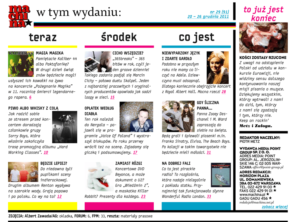 w tym wydaniu: nr 29 (91) 20 – 26 grudnia 2011 teraz Êrodek co jest MAGIA MAGIKA Pami´tacie Kaliber 44 albo Paktofonik´? W drugi dzieƒ Êwiàt znów b´dziecie mogli us∏yszeç ich kawa∏ki na ˝ywo na koncercie „Po˝egnanie Magika” w 11. rocznic´ Êmierci legendarnego rapera. 6 CICHO WSZ¢DZIE? „365breaks” – 365 bitów w rok, czyli jeden groove dziennie! Takiego zadania podjà∏ si´ Marcin Cichy – po∏owa duetu Skalpel. Jeden z najbardziej pracowitych i oryginalnych producentów opowiada jak sadzi loopy w sieci. 15 NIEWYPARZONY J¢ZYK I ZDARTE GARD¸O Podobno w przysz∏ym roku nie mamy co liczyç na Adele. Dziewczyna musi odsapnàç. Dlatego koniecznie obejrzyjcie koncert z Royal Albert Hall. Mocna rzecz! 28 PIWO ALBO WHISKY Z COLÑ Jak radziç sobie ze stresem przed koncertem doradzajà cz∏onkowie grupy Sorry Boys, która w∏aÊnie zakoƒczy∏a tras´ promocyjnà albumu „Hard Working Classes”. 10 OP¸ATEK WED¸UG DIAB¸A Ten rok nale˝a∏ do Nergala – pojawi∏ si´ w programie „Voice Of Poland” i wystraszy∏ biskupów. Po roku przerwy wróci∏ te˝ na scen´. Zajadamy si´ giczkà i podsumowujemy. 17 GDY ÂLICZNA PANNA... Panna Zooey Deschanel i M. Ward zapraszajà do siebie na Êwi´ta. B´dà grali i Êpiewali piosenki m.in. Franka Sinatry, Elvisa, The Beach Boys. Po kolacji w takim towarzystwie nie b´dziecie mieli md∏oÊci. 31 B¢DZIE LEPIEJ? Do niedawna byli pupilkami sceny indierockowej. Drugim albumem Renton wyp∏ywa na szerokie wody. Grajà popowo i po polsku. Co wy na to? 12 ZAMIAST RÓZGI Koncertowe DVD Beyonce, a mo˝e dokument o U2? Gra „Wiedêmin 2”, a maskotka Killer Rabbit? Prezenty dla ka˝dego. 23 NA DOBREJ FALI Co to jest pirackie radio? To rozg∏oÊnia, która nadaje nielegalnie z pok∏adu statku. Przynajmniej tak funkcjonowa∏o s∏ynne Wonderful Radio London. 33 to ju˝ jest koniec KOŚCI ZOSTAŁY RZUCONE Z uwagi na odstàpienie Polski od udzia∏u w konkursie Eurowizji, nie widzimy sensu dalszego kontynuowania naszej misji pisania o muzyce. Dzi´kujemy wszystkim, którzy wytrwali z nami do dziÊ, tym, którzy z nami si´ zgadzajà i tym, którzy nie. Keep on rockin' Metz i Załoga. REDAKTOR NACZELNY: PIOTR METZ WYDAWCA MEDIA POINT GROUP SP. Z O. O. ADRES MEDIA: POINT GROUP: AL. JEROZOLIMSKIE 146 C; 02-305 WARSZAWA [email protected] ADRES REDAKCJI: HORIZON PLAZA UL. DOMANIEWSKA 39A 02-672 WARSZAWA TEL. 022 429 91 00 H FAKS 022 429 91 01 H www.machina.pl H GADU GADU 456 H [email protected] zobacz wi´cej ZDJ¢CIA: Albert Zawada/AG: okladka, FORUM: 6, FPM: 33, reszta: materia∏y prasowe
