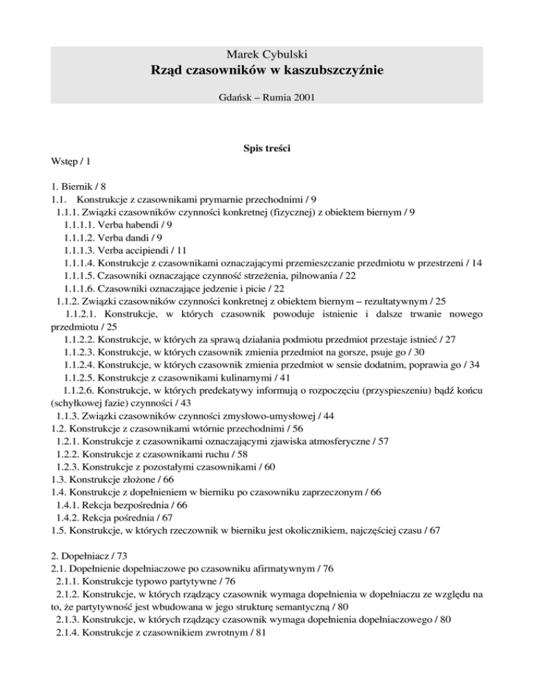 Marek Cybulski Rząd czasowników w kaszubszczyźnie Gdańsk – Rumia 2001 Spis treści Wstęp / 1 1. Biernik / 8 1.1. Konstrukcje z czasownikami prymarnie przechodnimi / 9 1.1.1. Związki czasowników czynności konkretnej (fizycznej) z obiektem biernym / 9 1.1.1.1. Verba habendi / 9 1.1.1.2. Verba dandi / 9 1.1.1.3. Verba accipiendi / 11 1.1.1.4. Konstrukcje z czasownikami oznaczającymi przemieszczanie przedmiotu w przestrzeni / 14 1.1.1.5. Czasowniki oznaczające czynność strzeżenia, pilnowania / 22 1.1.1.6. Czasowniki oznaczające jedzenie i picie / 22 1.1.2. Związki czasowników czynności konkretnej z obiektem biernym – rezultatywnym / 25 1.1.2.1. Konstrukcje, w których czasownik powoduje istnienie i dalsze trwanie nowego przedmiotu / 25 1.1.2.2. Konstrukcje, w których za sprawą działania podmiotu przedmiot przestaje istnieć / 27 1.1.2.3. Konstrukcje, w których czasownik zmienia przedmiot na gorsze, psuje go / 30 1.1.2.4. Konstrukcje, w których czasownik zmienia przedmiot w sensie dodatnim, poprawia go / 34 1.1.2.5. Konstrukcje z czasownikami kulinarnymi / 41 1.1.2.6. Konstrukcje, w których predekatywy informują o rozpoczęciu (przyspieszeniu) bądź końcu (schyłkowej fazie) czynności / 43 1.1.3. Związki czasowników czynności zmysłowo-umysłowej / 44 1.2. Konstrukcje z czasownikami wtórnie przechodnimi / 56 1.2.1. Konstrukcje z czasownikami oznaczającymi zjawiska atmosferyczne / 57 1.2.2. Konstrukcje z czasownikami ruchu / 58 1.2.3. Konstrukcje z pozostałymi czasownikami / 60 1.3. Konstrukcje złożone / 66 1.4. Konstrukcje z dopełnieniem w bierniku po czasowniku zaprzeczonym / 66 1.4.1. Rekcja bezpośrednia / 66 1.4.2. Rekcja pośrednia / 67 1.5. Konstrukcje, w których rzeczownik w bierniku jest okolicznikiem, najczęściej czasu / 67 2. Dopełniacz / 73 2.1. Dopełnienie dopełniaczowe po czasowniku afirmatywnym / 76 2.1.1. Konstrukcje typowo partytywne / 76 2.1.2. Konstrukcje, w których rządzący czasownik wymaga dopełnienia w dopełniaczu ze względu na to, że partytywność jest wbudowana w jego strukturę semantyczną / 80 2.1.3. Konstrukcje, w których rządzący czasownik wymaga dopełnienia dopełniaczowego / 80 2.1.4. Konstrukcje z czasownikiem zwrotnym / 81 2.1.5. Konstrukcje z predykatami nieczasownikowymi / 81 2.2. Dopełnienie dopełniaczowe po czasowniku zaprzeczonym / 81 2.2.1. Rekcja bezpośrednia / 81 2.2.2. Rekcja pośrednia / 86 2.2.3. Konstrukcje z zaimkiem ńic / 86 2.2.3.1.Konstrukcje, w których ńic (ńick) jest dopełnieniem / 87 2.2.3.1.1. Rekcja bezpośrednia / 87 2.2.3.1.2. Rekcja pośrednia / 88 2.2.3.2. Konstrukcje, w których ńic jest podmiotem / 88 2.2.3.3. Konstrukcje, w których ńic jest okolicznkiem / 88 2.2.3.4. Konstrukcje, w których ńic (ńick) jest określeniem przymiotnika vart / 88 2.2.4. Podmiot przy zaprzeczonym czasowniku bëc / 89 2.2.5. Konstrukcje z tzw. podmiotem logicznym w dopełniaczu / 89 2.3. Skostniałe dopełniaczowe formy xleba, sëra, kuxa / 89 2.4. Konstrukcje, w których rzeczownik w dopełniaczu jest okolicznikiem / 91 3. Celownik / 92 3.1. Celownik jako dopełnienie dalsze / 93 3.1.1. Konstrukcje, w których dopełnienie ulega czynności / 93 3.1.1.1. Verba dandi / 93 3.1.1.2. Verba accipiendi / 94 3.1.1.3. Celownik z czasownikami, oznaczającymi przemieszczanie w przestrzeni / 95 3.1.2. Konstrukcje, w których dopełnienie celownikowe stoi po czasownikach, nazywających czynności zmysłowo-umysłowe / 95 3.1.3. Konstrukcje, w których celownik jako dopełnienie dalsze stoi po czasownikach kreujących, likwidujących lub zmieniających (trwale lub nietrwale) przedmiot-dopełnienie bliższe w bierniku / 97 3.1.4. Pozostałe konstrukcje z dopełnieniem celownikowym / 99 3.2. Celownik po czasownikach ruchu lub procesu / 99 3.3. Ślady archaicznego celownika zbliżenia / 100 3.4. Konstrukcje z tzw. czasownikiem konwencjonalnym (dativus ethicus) / 100 4. Celownik lub biernik (dopełniacz) / 102 4.1. Konstrukcje o znaczeniu bić, karać, karcić kogoś / 102 4.2. Konstrukcje z dopełnieniem po tzw. czasownikach trzeciosobowych / 105 5. Narzędnik / 106 5.1. Narzędnik jako dopełnienie bliższe / 106 5.1.1. Po czasownikach oznaczających ruch, rzucanie, potrząsanie / 106 5.1.2. Po czasownikach oznaczających panowanie, rządzenie, władanie (verba regendi) / 108 5.1.3. Po czasownikach oznaczających pogardę / 108 5.2. Narzędnik jako dopełnienie dalsze / 108 5.2.1. Po czasownikach oznaczających troskę, opiekę / 108 5.2.2. Jako dopełnienie czasownika pomocniczego / 108 5.3. Narzędnik predykatywny / 109 5.3.1. Orzecznik rzeczownikowy / 109 5.3.2. Orzecznik przymiotnikowy (wyrażony przymiotnikiem lub zaimkiem) / 110 5.3.3. Orzecznik rzeczownikowy w mianowniku / 110 5.3.4. Dopełnienie orzekające przy czasownikach oznaczających nazywanie, mianowanie, rzadziej zrobienie czegoś / 110 5.4. Narzędnik jako okolicznik określający / 111 5.4.1. przestrzeń, w której odbywa się jakiś ruch / 111 5.4.2. czas trwania czynności / 111 5.4.3. sposób, dzięki któremu czynność dochodzi do skutku / 111 5.4.4. przyczynę, wzgląd, z powodu których następuje czynność werbalna / 112 6. Bezokolicznik / 113 6.1. Konstrukcje, w których bezokolicznik pełni rolę gramatyczną / 114 6.1.1. Jako składnik czasu przyszłego wraz z czasownikiem bëc w odpowiedniej formie / 114 6.1.2. Jako część formy 1. os. pluralis imperat. typu xcemë le so zażëc / 114 6.2. Konstrukcje z czasownikiem fazowym / 116 6.3. Konstrukcje z czasownikiem modalnym / 120 6.3.1. Konstrukcje: czasownik (predykatyw) modalny + bezokolicznik / 120 6.3.2. Konstrukcje, w których czasownik modalny da się zmultiwerbizować / 141 6.4. Bezokolicznik po predykatywnie nieczasownikowym / 141 6.4.1. Po tzw. czasowniku niefleksyjnym / 141 6.4.2. Po innych predykatywach nieczasownikowych / 142 6.5. Konstrukcje, w których bezokolicznik w tradycyjnym ujęciu jest podmiotem / 143 6.6. Konstrukcje z czasownikami ruchu / 145 6.7. Kon