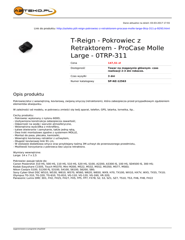 Dane aktualne na dzień: 03-03-2017 17:55 Link do produktu: http://azteko.pl/t-reign-pokrowiec-z-retraktorem-procase-molle-large-0trp-311-p-9293.html T-Reign - Pokrowiec z Retraktorem - ProCase Molle Large - 0TRP-311 Cena 147,51 zł Dostępność Towar na magazynie głównym- czas realizacji 2-3 dni robocze. Czas wysyłki 3 dni Numer katalogowy SP-NZ-12563 Opis produktu Pokrowiec/etui z wewnętrzną, kevlarową, zwijaną smyczą (retraktorem), która zabezpiecza przed przypadkowym zgubieniem elementów ekwipunku. W zależności od modelu, w pokrowcu zmieści się twój aparat, telefon, GPS, latarka, lornetka, itp.. Cechy produktu: - Pokrowiec wykonany z nylonu 600D, - Usztywniona konstrukcja zabezpiecza zawartość, - Odporność na wodę i warunki atmosferyczne, - Wewnętrzna wyściółka z mikrofibry, - Łatwe otwieranie i zamykanie, także jedną ręką, - Dwa troki montażowe zgodne z systemem MOLLE, - Montaż do pasa, plecaka, kamizelki, - Wewnątrz kevlarowy retraktor z uchwytem, - Długość kevlarowej linki 91 cm, - W zestawie dodatkowa smycz oraz przyklejany taśmą 3M uchwyt do przenoszonego przedmiotu, - Możliwość korzystania z pokrowca bez użycia retraktora. Wymiary wewnętrzne: Large: 14 x 7 x 2,5 Pokrowiec pasuje także do: Canon Powershot 310 HS, 500 HS, 110 HS, 510 HS, 520 HS, S100, A2200, A3300 IS, 100 HS, SD4500 IS, 300 HS; Kodak Easyshare C1505, Touch M5370, Mini M200, M522, M532, M552, M5350, M577, M583; Nikon Coolpix S100, S1200 PJ, S3100, S4100, S6100, S6200, S80; Sony Cyber-Shot DSC W510, W530, W610, W570, W560, W620, W650, WX9, H70, TX100, WX10, HX7V, WX5, TX55, TX10; Olympus TG-310, TG-320, TG-610, TG-810, VG-110, VG-120, VG-160, VR-320; Panasonic Lumix DMC 3D1, FH2, FH25, FH27, FH5, FP5, FP7, FX78, S2, S3, SZ1, SZ7, TS10, TS3, FH6, FH8, FH22 wygenerowano w programie shopGold Powered by TCPDF (www.tcpdf.org)