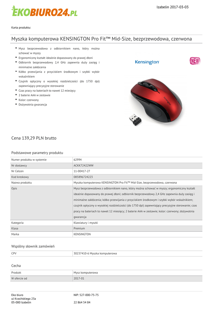 Izabelin 2017-03-03 Karta produktu: Myszka komputerowa KENSINGTON Pro Fit™ Mid-Size, bezprzewodowa, czerwona Mysz bezprzewodowa z odbiornikiem nano, który można schować w myszy Ergonomiczny kształt idealnie dopasowany do prawej dłoni Odbiornik bezprzewodowy 2,4 GHz zapewnia duży zasięg i minimalne zakłócenia Kółko przewijania z przyciskiem środkowym i szybki wybór wskaźnikiem Czujnik optyczny o wysokiej rozdzielczości (do 1750 dpi) zapewniający precyzyjne sterowanie Czas pracy na bateriach to nawet 12 miesięcy 2 baterie AAA w zestawie Kolor: czerwony Dożywotnia gwarancja Cena 139,29 PLN brutto Podstawowe parametry produktu Numer produktu w systemie 62994 Nr dostawcy ACKK72422WW Nr Celcen 11-00417-27 Kod kreskowy 085896724223 Nazwa produktu Myszka komputerowa KENSINGTON Pro Fit™ Mid-Size, bezprzewodowa, czerwona Opis Mysz bezprzewodowa z odbiornikiem nano, który można schować w myszy; ergonomiczny kształt idealnie dopasowany do prawej dłoni; odbiornik bezprzewodowy 2,4 GHz zapewnia duży zasięg i minimalne zakłócenia; kółko przewijania z przyciskiem środkowym i szybki wybór wskaźnikiem; czujnik optyczny o wysokiej rozdzielczości (do 1750 dpi) zapewniający precyzyjne sterowanie; czas pracy na bateriach to nawet 12 miesięcy; 2 baterie AAA w zestawie; kolor: czerwony; dożywotnia gwarancja Kategoria Klawiatury i myszki Klasa Premium Marka KENSINGTON Wspólny słownik zamówień CPV 30237410-6 Myszka komputerowa Cecha Produkt Mysz komputerowa W ofercie od 2017-01 Eko biuro ul Krasińskiego 23a 05-080 Izabelin NIP: 527-000-75-75 22 864 54 84 Izabelin 2017-03-03 Karta katalogowa produktu cd. Myszka komputerowa KENSINGTON Pro Fit™ Mid-Size, bezprzewodowa, czerwona Typ Bezprzewodowy Certyfikaty Ilość lat gwarancji Gwarancja dożywotnia Hit Standard Nowy produkt w ofercie Nowość Kolor Kolor Czerwony Pozostałe zdjęcia produktu Serdecznie zapraszamy do współpracy Eko biuro zespół. Eko biuro ul Krasińskiego 23a 05-080 Izabelin NIP: 527-000-75-75 22 864 54 84
