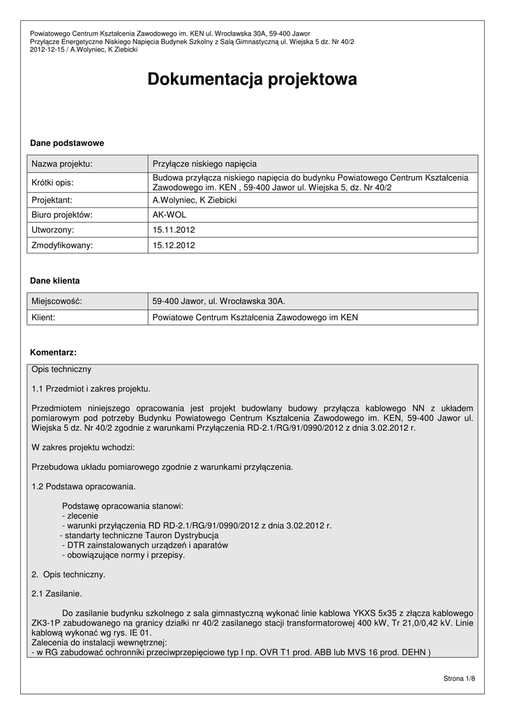 Powiatowego Centrum Kształcenia Zawodowego im. KEN ul. Wrocławska 30A, 59-400 Jawor Przyłącze Energetyczne Niskiego Napięcia Budynek Szkolny z Salą Gimnastyczną ul. Wiejska 5 dz. Nr 40/2 2012-12-15 / A.Wolyniec, K Ziebicki Dokumentacja projektowa Dane podstawowe Nazwa projektu: Przyłącze niskiego napięcia Projektant: Budowa przyłącza niskiego napięcia do budynku Powiatowego Centrum Kształcenia Zawodowego im. KEN , 59-400 Jawor ul. Wiejska 5, dz. Nr 40/2 A.Wolyniec, K Ziebicki Biuro projektów: AK-WOL Utworzony: 15.11.2012 Zmodyfikowany: 15.12.2012 Krótki opis: Dane klienta Miejscowość: 59-400 Jawor, ul. Wrocławska 30A. Klient: Powiatowe Centrum Kształcenia Zawodowego im KEN Komentarz: Opis techniczny 1.1 Przedmiot i zakres projektu. Przedmiotem niniejszego opracowania jest projekt budowlany budowy przyłącza kablowego NN z układem pomiarowym pod potrzeby Budynku Powiatowego Centrum Kształcenia Zawodowego im. KEN, 59-400 Jawor ul. Wiejska 5 dz. Nr 40/2 zgodnie z warunkami Przyłączenia RD-2.1/RG/91/0990/2012 z dnia 3.02.2012 r. W zakres projektu wchodzi: Przebudowa układu pomiarowego zgodnie z warunkami przyłączenia. 1.2 Podstawa opracowania. Podstawę opracowania stanowi: - zlecenie - warunki przyłączenia RD RD-2.1/RG/91/0990/2012 z dnia 3.02.2012 r. - standarty techniczne Tauron Dystrybucja - DTR zainstalowanych urządzeń i aparatów - obowiązujące normy i przepisy. 2. Opis techniczny. 2.1 Zasilanie. Do zasilanie budynku szkolnego z sala gimnastyczną wykonać linie kablowa YKXS 5x35 z złącza kablowego ZK3-1P zabudowanego na granicy działki nr 40/2 zasilanego stacji transformatorowej 400 kW, Tr 21,0/0,42 kV. Linie kablową wykonać wg rys. IE 01. Zalecenia do instalacji wewnętrznej: - w RG zabudować ochronniki przeciwprzepięciowe typ I np. OVR T1 prod. ABB lub MVS 16 prod. DEHN ) Strona 1/8 Powiatowego Centrum Kształcenia Zawodowego im. KEN ul. Wrocławska 30A, 59-400 Jawor Przyłącze Energetyczne Niskiego Napięcia Budynek Szkolny z Salą Gimnastyczną ul. Wiejska 5 dz. Nr 40/2 2012-12-15 / A.Wolyniec, K Ziebicki - wyłącznik główny wymienić na DPX125 z wyzwalaczem wzrostowym - obwód wyłącznika PPOZ zasilić z nowego zabezpieczenia S301 - przewody z wyłącznika PPOZ zamontowanego w stacji transformatorowej przenieść do rozdzielni Nn. Żyły neutralna izolacja w kolorze niebieskim, żyła PE z kolorze żółto-zielonym. Napięcie zasilania 400/230V, 50Hz. Warunki przyłączenia RD-2.1/RG/91/0990/2012 z dnia 3.02.2012 r. określają moc przyłączeniową na 38,0 kW. 2.2 Rozdzielnia Istniejącą rozdzielnie żeliwną zlokalizowaną w budynku Sali gimnastycznej należy przebudować. Zakres przebudowy: - demontaż istniejącego zasilania linia kablową YAKY 4x240 - wymiana wyłącznika głównego na DPX 125 wyposażonego w cewkę wyzwalacza elektromagnetycznego. - zabudować S301b6 do zasilania wyłączniki PPOZ - zabudować ochronniki przepięciowe 400V typ. MVS16 prod. DEHN Prace wykonać wg IE03 Budynek został wyposażony w wyłącznik PPOZ. Istniejący wyłącznik należy podłączyć z wykorzystaniem istniejących przewodów do cewki wyzwalacza DPX125. Zadziałanie wyłącznika PPOZ spowoduje wyłącznie napięcia na całym obiekcie. 2.3 Instalacja wyrównawcza. Bez zmian. 2.4. Instalacja odgromowa Poza zakresem opracowania 2.5 Ochrona przeciwporażeniowa. Jako ochronę przed niebezpiecznym napięciem dotyku przewiduje się w sieci 400/230V. Ochronę podstawowa - IZOLACJA Ochrona Dodatkowa - SAMOCZYNNE WYŁACZANIE ZASILANIA 2.6 Ochrona przed korozją W celu ochrony przed korozją metalowych elementów np. konstrukcje stalowe należy pomalować farbami ochronnymi. 2.7 Obliczenia l. Obliczenie mocy maksymalnej oraz dobór wlz. Do obliczeń przyjęto max moc wynikającą z warunków przyłączenia : Moc w szafce pomiarowej wynosi ( moc umowna ) : P = 38,0 kW; Un=400V; cosφ=0,95 IB = 59,10 A Zabezpieczenie przedlicznikowe 00 80 A gG Sprawdzenie wlz YKXS 5x35, Idd=122 A dla ułożenia typ D In>=1,25*IB=73,88 A Strona 2/8 Powiatowego Centrum Kształcenia Zawodowego im. KEN ul. Wrocławska 30A, 59-400 Jawor Przyłącze Energetyczne Niskiego Napięcia Budynek Szkolny z Salą Gimnastyczną ul. Wiejska 5 dz. Nr 40/2 2012-12-15 / A.Wolyniec, K Ziebicki In=80 A ( wkładka bezpiecznikowa gG ) Iz>=k2*In/1,45=1,6*80/1,45=88,278 A Dla przewodu wielożyłowego YKXS 5x35 żyła 35 mm2 Idd= 122 A Idd=122 A >=Iz Zabezpieczenie przelicznikowe In=80A gG Zabezpieczenie przeciążeniowe S303C63 Zasilanie wykonano w układzie TN-S Gdzie: P – Moc czynna obciążenia PB – obliczeniowy prąd obciążenia przewodu In – prąd znamionowy zabezpieczenia Iz – wymagana minimalna długotrwała obciążalność prądowa przewodu k2 – współczynnik krotności prądu Idd – długotrwała dopuszczalna obciążalność przewodów I’z – długotrwała dopuszczalna z katalogu producenta Kp – współczynnik poprawkowy uwzględniający sposób ułożenia przewodu 2. Obliczenia spadków napięć Obliczono spadki napięcia na poszczególnych obwodach: - Obwód I zasilający od miejskiej stacji transformatorowej do szafki ZK3a-1P - linia YAKXS 4x240 mm l~329m ( s=240 ) , P=38,0 kW, ∆U%= 0,9705 V - Obwód II od ZK3a-1P do Rozdzielni Głównej l~120m - spadek napięcia w szafce pomiarowej ZK3a-1P dla linii zasilającej Nn od stacji trafo =0,93<4% - spadek napięcia od ZK3a-1P do Rozdzielni Głównej Szkoły 1,48<4% 3. Obliczenie wartości impedancji pętli zwarciowej Dane do obliczeń: Transformator Sn=400 kVA, 21/0,42kV, Uz=4,5% Linia zasilająca od miejskiej stacji transformatorowej do szafki złączowo-pomiarowej ZK3a-1P YAKXS 4x240 mm - 329 m Strona 3/8 Powiatowego Centrum Kształcenia Zawodowego im. KEN ul. Wrocławska 30A, 59-400 Jawor Przyłącze Energetyczne Niskiego Napięcia Budynek Szkolny z Salą Gimnastyczną ul. Wiejska 5 dz. Nr 40/2 2012-12-15 / A.Wolyniec, K Ziebicki Linia zasilająca od ZK3a-1P do Rozdzielni Głównej Szkoły YKXS 5x35 – 120 m Za