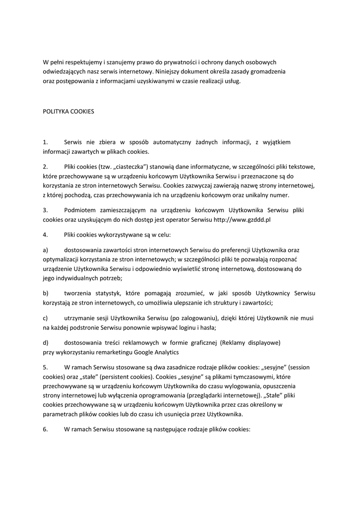 W pełni respektujemy i szanujemy prawo do prywatności i ochrony danych osobowych odwiedzających nasz serwis internetowy. Niniejszy dokument określa zasady gromadzenia oraz postępowania z informacjami uzyskiwanymi w czasie realizacji usług. POLITYKA COOKIES 1. Serwis nie zbiera w sposób automatyczny żadnych informacji, z wyjątkiem informacji zawartych w plikach cookies. 2. Pliki cookies (tzw. „ciasteczka”) stanowią dane informatyczne, w szczególności pliki tekstowe, które przechowywane są w urządzeniu końcowym Użytkownika Serwisu i przeznaczone są do korzystania ze stron internetowych Serwisu. Cookies zazwyczaj zawierają nazwę strony internetowej, z której pochodzą, czas przechowywania ich na urządzeniu końcowym oraz unikalny numer. 3. Podmiotem zamieszczającym na urządzeniu końcowym Użytkownika Serwisu pliki cookies oraz uzyskującym do nich dostęp jest operator Serwisu http://www.gzddd.pl 4. Pliki cookies wykorzystywane są w celu: a) dostosowania zawartości stron internetowych Serwisu do preferencji Użytkownika oraz optymalizacji korzystania ze stron internetowych; w szczególności pliki te pozwalają rozpoznać urządzenie Użytkownika Serwisu i odpowiednio wyświetlić stronę internetową, dostosowaną do jego indywidualnych potrzeb; b) tworzenia statystyk, które pomagają zrozumieć, w jaki sposób Użytkownicy Serwisu korzystają ze stron internetowych, co umożliwia ulepszanie ich struktury i zawartości; c) utrzymanie sesji Użytkownika Serwisu (po zalogowaniu), dzięki której Użytkownik nie musi na każdej podstronie Serwisu ponownie wpisywać loginu i hasła; d) dostosowania treści reklamowych w formie graficznej (Reklamy displayowe) przy wykorzystaniu remarketingu Google Analytics 5. W ramach Serwisu stosowane są dwa zasadnicze rodzaje plików cookies: „sesyjne” (session cookies) oraz „stałe” (persistent cookies). Cookies „sesyjne” są plikami tymczasowymi, które przechowywane są w urządzeniu końcowym Użytkownika do czasu wylogowania, opuszczenia strony internetowej lub wyłączenia oprogramowania (przeglądarki internetowej). „Stałe” pliki cookies przechowywane są w urządzeniu końcowym Użytkownika przez czas określony w parametrach plików cookies lub do czasu ich usunięcia przez Użytkownika. 6. W ramach Serwisu stosowane są następujące rodzaje plików cookies: a) „niezbędne” pliki cookies, umożliwiające korzystanie z usług dostępnych w ramach Serwisu, np. uwierzytelniające pliki cookies wykorzystywane do usług wymagających uwierzytelniania w ramach Serwisu; b) pliki cookies służące do zapewnienia bezpieczeństwa, np. wykorzystywane do wykrywania nadużyć w zakresie uwierzytelniania w ramach Serwisu; c) „wydajnościowe” pliki cookies, umożliwiające zbieranie informacji o sposobie korzystania ze stron internetowych Serwisu; d) „funkcjonalne” pliki cookies, umożliwiające „zapamiętanie” wybranych przez Użytkownika ustawień i personalizację interfejsu Użytkownika, np. w zakresie wybranego języka lub regionu, z którego pochodzi Użytkownik, rozmiaru czcionki, wyglądu strony internetowej itp.; e) „reklamowe” pliki cookies, umożliwiające dostarczanie reklamowych bardziej dostosowanych do ich zainteresowań. Użytkownikom treści 7. W wielu przypadkach oprogramowanie służące do przeglądania stron internetowych (przeglądarka internetowa) domyślnie dopuszcza przechowywanie plików cookies w urządzeniu końcowym Użytkownika. Użytkownicy Serwisu mogą dokonać w każdym czasie zmiany ustawień dotyczących plików cookies. Ustawienia te mogą zostać zmienione w szczególności w taki sposób, aby blokować automatyczną obsługę plików cookies w ustawieniach przeglądarki internetowej bądź informować o ich każdorazowym zamieszczeniu w urządzeniu Użytkownika Serwisu. Szczegółowe informacje o możliwości i sposobach obsługi plików cookies dostępne są w ustawieniach oprogramowania (przeglądarki internetowej). Użytkownicy mogą zablokować usługę Analytics dla reklam displayowych oraz dostosowywać reklamy w sieci reklamowej Google w Menedżerze preferencji reklam. Można również pobrać program blokujący Google Analytics ze strony https://tools.google.com/dlpage/gaoptout/ 8. Operator Serwisu informuje, że ograniczenia stosowania plików cookies mogą wpłynąć na niektóre funkcjonalności dostępne na stronach internetowych Serwisu. 9. Pliki cookies zamieszczane w urządzeniu końcowym Użytkownika Serwisu i wykorzystywane mogą być również przez współpracujących z operatorem Serwisu reklamodawców oraz partnerów. 10. Więcej informacji na temat plików cookies dostępnych jest pod adresem http://wszystkoociasteczkach.pl lub w sekcji „Pomoc” w menu przeglądarki internetowej.