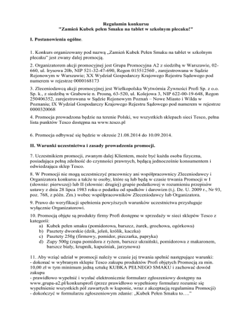 Regulamin konkursu "Zamień Kubek pełen Smaku na tablet w szkolnym plecaku!" I. Postanowienia ogólne. 1. Konkurs organizowany pod nazwą „Zamień Kubek Pełen Smaku na tablet w szkolnym plecaku” jest zwany dalej promocją. 2. Organizatorem akcji promocyjnej jest Grupa Promocyjna A2 z siedzibą w Warszawie, 02660, ul. Irysowa 20b, NIP 521-32-47-690, Regon 015512560 , zarejestrowana w Sądzie Rejonowym w Warszawie; XX Wydział Gospodarczy Krajowego Rejestru Sądowego pod numerem w rejestrze 0000168173 3. Zleceniodawcą akcji promocyjnej jest Wielkopolska Wytwórnia Żywności Profi Sp. z o.o. Sp. k., z siedzibą w Grabowie n. Prosną, 63-520, ul. Kolejowa 3, NIP 622-00-19-648, Regon 250406352, zarejestrowana w Sądzie Rejonowym Poznań – Nowe Miasto i Wilda w Poznaniu; IX Wydział Gospodarczy Krajowego Rejestru Sądowego pod numerem w rejestrze 0000320068 4. Promocja prowadzona będzie na terenie Polski, we wszystkich sklepach sieci Tesco, pełna lista punktów Tesco dostępna na www.tesco.pl 6. Promocja odbywać się będzie w okresie 21.08.2014 do 10.09.2014. II. Warunki uczestnictwa i zasady prowadzenia promocji. 7. Uczestnikiem promocji, zwanym dalej Klientem, może być każda osoba fizyczna, posiadająca pełną zdolność do czynności prawnych, będącą jednocześnie konsumentem i odwiedzająca sklep Tesco. 8. W Promocji nie mogą uczestniczyć pracownicy ani współpracownicy Zleceniodawcy i Organizatora konkursu a także te osoby, które są lub będą w czasie trwania Promocji w I (słownie: pierwszej) lub II (słownie: drugiej) grupie podatkowej w rozumieniu przepisów ustawy z dnia 28 lipca 1983 roku o podatku od spadków i darowizn (t.j. Dz. U. 2009 r., Nr 93, poz. 768, z późn. Zm.) wobec współpracowników Zleceniodawcy lub Organizatora. 9. Prawo do weryfikacji spełnienia powyższych warunków uczestnictwa przysługuje wyłącznie Organizatorowi. 10. Promocją objęte są produkty firmy Profi dostępne w sprzedaży w sieci sklepów Tesco z kategorii: a) Kubek pełen smaku (pomidorowa, barszcz, żurek, grochowa, ogórkowa) b) Pasztety dworskie (dzik, jeleń, królik, kaczka) c) Pasztety 250g (firmowy, pomidor, pieczarka, papryka) d) Zupy 500g (zupa pomidora z ryżem, barszcz ukraiński, pomidorowa z makaronem, barszcz biały, krupnik, kapuśniak, jarzynowa) 11. Aby wziąć udział w promocji należy w czasie jej trwania spełnić następujące warunki: - dokonać w wybranym sklepie Tesco zakupu produktów Profi objętych Promocją za min. 10,00 zł w tym minimum jedną sztukę KUBKA PEŁNEGO SMAKU i zachować dowód zakupu - prawidłowo wypełnić i wysłać elektronicznie formularz zgłoszeniowy dostępny na www.grupa-a2.pl/konkursprofi (przez prawidłowo wypełniony formularz rozumie się wypełnienie wszystkich pól zawartych w kuponie, wraz z akceptacją regulaminu Promocji) - dokończyć w formularzu zgłoszeniowym zdanie: „Kubek Pełen Smaku to….” - każda wielokrotność zakupu za kwotę 10,00 zł upoważnia do wypełnienia i wysłania kolejnych formularzy zgłoszeniowych - do udziału w Promocji mogą zostać zgłoszone tylko i wyłącznie hasła, które: a) nie naruszają prywatności lub innych praw, w tym autorskich, jakichkolwiek innych podmiotów b) nie godzą w dobre imię innych osób c) nie zawierają treści powszechnie używanych za wulgarne i obraźliwe d) nie są zabronione przez prawo 12. Zdobywcami nagród zostaną Uczestnicy, których hasła według Komisji okażą się najlepsze. III. Nagrody i zasady ich wydawania 13. Nagrody za najlepsze dokończenie zdania – 10 tabletów Samsung Galaxy Tab 3 7.0 SMT210 o wartości jednostkowej 499,00 zł z plecakiem Nike o wartości jednostkowej 63,00 zł. Nagrody za kolejne 10 najlepiej dokończonych zdań – Plecaki szkolne na kółkach Jamusu 25 Hi-Tec o wartości jednostkowej 99,00 zł wypełnione smakiem Profi (produkty Profi o wartości ok. 100 zł) 14. Nagrody zostaną przyznane przez Wewnętrzną Komisję powołaną przez Organizatora, do której zadań zależy m.in. weryfikacja nadesłanych haseł oraz zapewnienie uwzględnienia wszystkich prawidłowo nadesłanych kuponów konkursowych. 15. Zwycięzcy nagród za najlepiej dokończone zdanie „Kubek Pełen Smaku to….” bezterminowo upoważnią Organizatora i Zleceniodawcę do publikowania i komercyjnego wykorzystywania zwycięskich haseł. Warunkiem otrzymania nagrody jest podpisanie przez Zwycięzcę oświadczenia zawierającego zgodę na wykorzystywanie zaproponowanego hasła i przekazanie praw autorskich. 16. Pełny opis nagród dostępny na stronie www.grupa-a2.pl/konkursprofi i w siedzibie Organizatora. 17. Informacje o wynikach promocji uzyskać będzie można w siedzibie Organizatora i na stronie www.grupa-a2.pl/konkursprofi 18. Zwycięzcy nagród zostaną powiadomieni o wygranej i trybie jej odbioru telefonicznie, emailowo lub listem poleconym do dnia 17.09.2014 r. 19. Nagrody wydane będą najpóźniej do dnia 25.09.2014. Wydanie nagród nastąpi po przedstawieniu dowodu zakupu uprawniającego do wzięcia udziału w Promocji. Uczestnik ma obowiązek przedstawienia paragonu do weryfikacji w terminie 3 dni od momentu poinformowania o wygranej. Skan paragonu należy przesłać na adres mailowy [email protected] W przypadku braku przedstawienia paragonu potwierdzającego zakup Komisja zastrzega sobie prawo do wyboru kolejnych nagrodzonych haseł. 20. Jeden klient może otrzymać tylko i wyłącznie jedną nagrodę. 21. Nagrody zostaną wydane zgodnie z obowiązującymi przepisami podatkowymi. 22. W uzasadnionych wypadkach organizator zastrzega sobie prawo zastąpienia nagród dodatkowych wymienionych w p.3 regulaminu na inne, podobne, o zbliżonej wartości i właściwościach. 23. Nieodebranie nagrody w terminie oznacza rezygnację z nagrody. W takim przypadku nagroda przechodzi na konto Organizatora. 24. Regulamin promocji będzie dostępny w siedzibie Organizatora, na www.grupaa2.pl/konkursprofi oraz na www.tesco.pl IV. Post