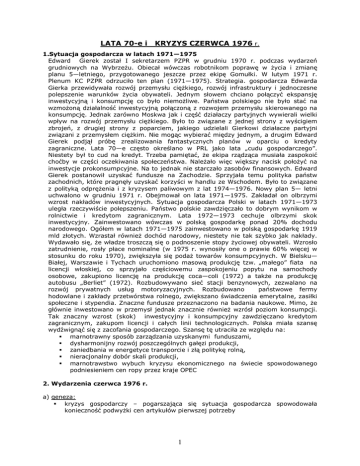 LATA 70-e i KRYZYS CZERWCA 1976 r. 1.Sytuacja gospodarcza w latach 1971—1975 Edward Gierek został I sekretarzem PZPR w grudniu 1970 r. podczas wydarzeń grudniowych na WybrzeŜu. Obiecał wówczas robotnikom poprawę w Ŝycia i zmianę planu 5—letniego, przygotowanego jeszcze przez ekipę Gomułki. W lutym 1971 r. Plenum KC PZPR odrzuciło ten plan (1971—1975). Strategia. gospodarcza Edwarda Gierka przewidywała rozwój przemysłu cięŜkiego, rozwój infrastruktury i jednoczesne polepszenie warunków Ŝycia obywateli. Jednym słowem chciano połączyć ekspansję inwestycyjną i konsumpcję co było niemoŜliwe. Państwa polskiego nie było stać na wzmoŜoną działalność inwestycyjną połączoną z rozwojem przemysłu skierowanego na konsumpcję. Jednak zarówno Moskwa jak i część działaczy partyjnych wywierali wielki wpływ na rozwój przemysłu cięŜkiego. Było to związane z jednej strony z wyścigiem zbrojeń, z drugiej strony z poparciem, jakiego udzielali Gierkowi działacze partyjni związani z przemysłem cięŜkim. Nie mogąc wybierać między jednym, a drugim Edward Gierek podjął próbę zrealizowania fantastycznych planów w oparciu o kredyty zagraniczne. Lata 70—e często określano w PRL jako lata „cudu gospodarczego”. Niestety był to cud na kredyt. Trzeba pamiętać, Ŝe ekipa rządząca musiała zaspokoić choćby w części oczekiwania społeczeństwa. NaleŜało więc większy nacisk połoŜyć na inwestycje prokonsumpcyjne. Na to jednak nie starczało zasobów finansowych. Edward Gierek postanowił uzyskać fundusze na Zachodzie. Sprzyjała temu polityka państw zachodnich, które pragnęły uzyskać korzyści w handlu ze Wschodem. Było to związane z polityką odpręŜenia i z kryzysem paliwowym z lat 1974—1976. Nowy plan 5— letni uchwalono w grudniu 1971 r. Obejmował on lata 1971—1975. Zakładał on olbrzymi wzrost nakładów inwestycyjnych. Sytuacja gospodarcza Polski w latach 1971—1973 uległa rzeczywiście polepszeniu. Państwo polskie zawdzięczało to dobrym wynikom w rolnictwie i kredytom zagranicznym. Lata 1972—1973 cechuje olbrzymi skok inwestycyjny. Zainwestowano wówczas w polską gospodarkę ponad 20% dochodu narodowego. Ogółem w latach 1971—1975 zainwestowano w polską gospodarkę 1919 mld złotych. Wzrastał równieŜ dochód narodowy, niestety nie tak szybko jak nakłady. Wydawało się, Ŝe władze troszczą się o podnoszenie stopy Ŝyciowej obywateli. Wzrosło zatrudnienie, rosły płace nominalne (w 1975 r. wynosiły one o prawie 60% więcej w stosunku do roku 1970), zwiększyła się podaŜ towarów konsumpcyjnych. W Bielsku— Białej, Warszawie i Tychach uruchomiono masową produkcję tzw. „małego” fiata na licencji włoskiej, co sprzyjało częściowemu zaspokojeniu popytu na samochody osobowe, zakupiono licencję na produkcję coca—coli (1972) a takŜe na produkcję autobusu „Berliet” (1972). Rozbudowywano sieć stacji benzynowych, zezwalano na rozwój prywatnych usług motoryzacyjnych. Rozbudowano państwowe fermy hodowlane i zakłady przetwórstwa rolnego, zwiększano świadczenia emerytalne, zasiłki społeczne i stypendia. Znaczne fundusze przeznaczono na badania naukowe. Mimo, Ŝe głównie inwestowano w przemysł jednak znacznie równieŜ wzrósł poziom konsumpcji. Tak znaczny wzrost (skok) inwestycyjny i konsumpcyjny zawdzięczano kredytom zagranicznym, zakupom licencji i całych linii technologicznych. Polska miała szansę wydźwignąć się z zacofania gospodarczego. Szansę tę utraciła ze względu na: marnotrawny sposób zarządzania uzyskanymi funduszami, dysharmonijny rozwój poszczególnych gałęzi produkcji, zaniedbania w energetyce transporcie i złą politykę rolną, nieracjonalny dobór skali produkcji, marnotrawstwo wybuch kryzysu ekonomicznego na świecie spowodowanego podniesieniem cen ropy przez kraje OPEC 2. Wydarzenia czerwca 1976 r. a) geneza: kryzys gospodarczy – pogarszająca się sytuacja gospodarcza spowodowała konieczność podwyŜki cen artykułów pierwszej potrzeby 1 kryzys społeczny – szerzyła się korupcja, powszechna kradzieŜ mienia społecznego (dobro jest „niczyje” bo państwowe), lekcewaŜenie obowiązków zawodowych, niska wydajność pracy, rosło zniechęcenie i pijaństwo nasilał się protest społeczny przeciwko otaczającej rzeczywistości, który zainspirował Kościół i intelektualiści. Prymas Wyszyński w „Kazaniach świętokrzyskich” przypomniał Polakom o prawie do Ŝycia w godności i sprawiedliwości. Opozycjoniści podpisali „List 11”, w którym apelowali o uwolnienie grupy „Ruch” wśród młodzieŜy umacniał się ruch oazowy związany z Kościołem, w którym oprócz wartości chrześcijańskich przekazywano przywiązanie do tradycji demokratycznych w sierpniu 1975 r. władze zapowiedziały nowelizację konstytucji, w której miał się znaleźć zapis o socjalistycznym charakterze państwa, nierozerwalnych więziach z ZSRR, przywódczej roli partii i ograniczeniem praw obywatelskich przez powiązanie ich z wykonywaniem obowiązków wobec państwa, o lojalności katolików wobec socjalistycznego ustroju, chciano równieŜ zmienić nazwę państwa na Polska Rzeczpospolita Socjalistyczna, w grudniu 1975 r. 59 wybitnych intelektualistów podpisało list protestacyjny do władz, w którym sprzeciwiali się wprowadzeniu tych zmian – „List 59” 10.02.1976 r. wprowadzono zmiany do konstytucji ale w łagodniejszej formie, niŜ te które zaproponowano wcześniej. W Art.1. umieszczono stwierdzenie iŜ PRL jest „państwem socjalistycznym”, dodano Art. 3 „przewodnią siłą polityczną społeczeństwa w budowie socjalizmu jest PZPR”, utrzymano zapis o kolektywizacji wsi zmiany w konstytucji wzburzyły część społeczeństwa. Oburzenie wzrosło gdy władze wydrukowały sfałszowany tekst „Kazań świętokrzyskich” prymasa Wyszyńskiego bezpośrednią przyczyną wydarzeń czerwcowych była zapowiedź