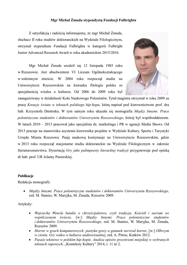 Mgr Michał Żmuda stypendystą Fundacji Fulbrighta Z satysfakcją i radością informujemy, że mgr Michał Żmuda, słuchacz II roku studiów doktoranckich na Wydziale Filologicznym, otrzymał stypendium Fundacji Fulbrighta w kategorii Fulbright Junior Advanced Research Award w roku akademickim 2015/2016. Mgr Michał Żmuda urodził się 12 listopada 1985 roku w Rzeszowie. Jest absolwentem VI Liceum Ogólnokształcącego w rodzinnym mieście. W 2004 roku rozpoczął studia na Uniwersytecie Rzeszowskim na kierunku filologia polska ze specjalnością wiedza o kulturze. Od 2006 do 2009 roku był zaangażowany w działalność Koła Naukowego Polonistów. Tytuł magistra otrzymał w roku 2009 za pracę Kreacje świata w tekstach polskiego hip-hopu, którą napisał pod kierownictwem prof. dra hab. Krzysztofa Dmitruka. W tym samym roku ukazała się monografia Między Innymi. Prace polonistyczne studentów i doktorantów Uniwersytetu Rzeszowskiego, której był współredaktorem. W latach 2010 – 2013 pracował jako specjalista ds. marketingu i PR w agencji Media Shows. Od 2013 pracuje na stanowisku asystenta kierownika projektu w Wydziale Kultury, Sportu i Turystyki Urzędu Miasta Rzeszowa. Pasję naukową kontynuuje na Uniwersytecie Rzeszowskim, gdzie w 2013 roku rozpoczął stacjonarne studia doktoranckie na Wydziale Filologicznym w zakresie literaturoznawstwa. Dysertację Gry jako palimpsesty literackiej tradycji przygotowuje pod opieką dr hab. prof. UR Jolanty Pasterskiej. Publikacje Redakcja monografii: Między Innymi. Prace polonistyczne studentów i doktorantów Uniwersytetu Rzeszowskiego, red. M. Stanisz, W. Maryjka, M. Żmuda, Rzeszów 2009. Artykuły: Wojciecha Wencla batalie o chrześcijaństwo, czyli tradycja, Kościół i sacrum we współczesnym świecie, [w:] Między Innymi. Prace polonistyczne studentów i doktorantów Uniwersytetu Rzeszowskiego, red. M. Stanisz, W. Maryjka, M. Żmuda, Rzeszów 2009. Horror w grach komputerowych: poetyka grozy a gatunek survival horror, [w:] Olbrzym w cieniu. Gry wideo w kulturze audiowizualnej, red. A. Pitrus, Kraków 2012. Pasaże tekstowe w polskim hip-hopie. Analiza opisów przestrzeni miejskiej w wybranych tekstach rapowych, „Konteksty Kultury” 2014, t. 11 nr 2. „Dla jednych trutką a dla innych karmą” - kontestacja w tekstach polskiego hip-hopu, „Konteksty Kultury” 2014, t. 11 nr 4. Skrecz na winylu jako źródło poetyki hip-hopu, „Kultura Współczesna” 2014, nr 4. Udział w konferencjach naukowych: Wojciecha Wencla batalie o chrześcijaństwo, czyli tradycja, Kościół i sacrum we współczesnym świecie, konferencja „Pamięć zbiorowa i indywidualna. Polska literatura a czasy współczesne”, Uniwersytet Rzeszowski 2007. Poetyka buntu w tekstach hip-hopu, konferencja „Pomiędzy Wschodem a Zachodem. Wizje innego w polskiej literaturze współczesnej”, Uniwersytet Rzeszowski, Rzeszów 2008. Władca pierścieni: gra karciana – regeneracja i degeneracja literackiego pierwowzoru, konferencja „Obszary humanistyki”, Uniwersytet Rzeszowski, Rzeszów 2014. „Ja ten kolo jestem, mam plan niecny i szpetny jak wujek Fester” – raper jako (anty?)bohater, konferencja „Antybohater w popkulturze”, Stowarzyszenie Trickster, Wrocław 2014. Styl grania: pomiędzy czytaniem a pisaniem cybertekstu gier wideo, konferencja „Tworzenie postaci: podmiotowość i tożsamość w grach wideo”, Uniwersytet Jagielloński, Kraków 2014. Doświadczanie literackich przestrzeni w grach komputerowych, konferencja „Kultura gier komputerowych 2”, Uniwersytet Łódzki, Łódź 2014. Shattered Memories: The Video Game as a Fabrication of Memory, konferencja „Memory: Forgetting and Creating”, Uniwersytet Gdański, Uniwersytet Jagielloński, Uniwersytet w Paranie, Uniwersytet w São Paulo, Uniwersytet McGill, Gdańsk 2014. Infocom's “Lurking Horror”- A Game Transformed by Gothic Excess, konferencja „All that Gothic 2”, Uniwersytet Łódzki, Łódź 2014. "Valiant Hearts" – gra komputerowa jako remediacja Wielkiej Wojny, konferencja „I Wojna Światowa w literaturze i innych tekstach kultury”, Uniwersytet Rzeszowski, Rzeszów 2014. ’The Lord of the Rings: The Card Game’ – A Machine that Generates Possible Worlds, konferencja „Games and Literary Theory: 2nd Annual Conference”, Uniwersytet w Amsterdamie, Amsterdam 2014. Zainteresowania badawcze: teoria literatury, gry w kontekście literaturoznawczym, gry jako teksty kultury, literatura współczesna, kultura hip-hopu.