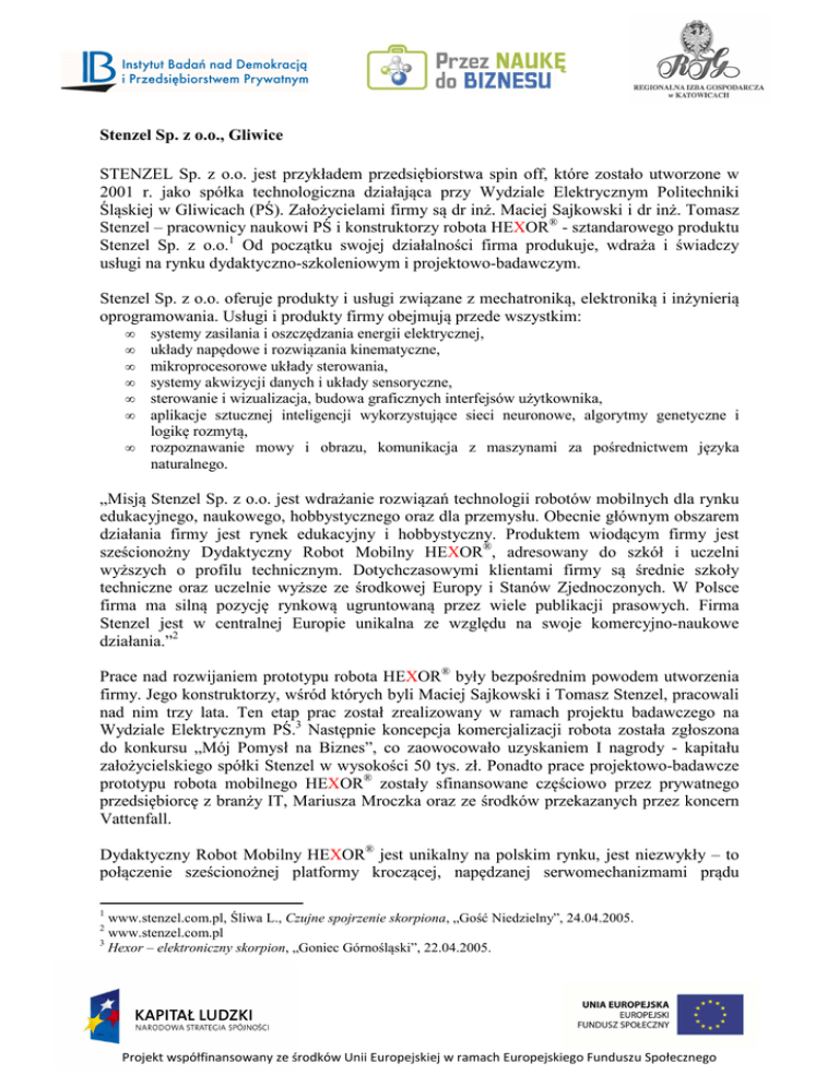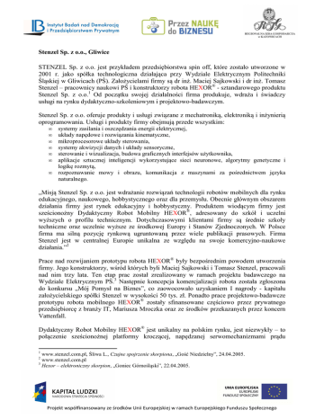 Stenzel Sp. z o.o., Gliwice STENZEL Sp. z o.o. jest przykładem przedsiębiorstwa spin off, które zostało utworzone w 2001 r. jako spółka technologiczna działająca przy Wydziale Elektrycznym Politechniki Śląskiej w Gliwicach (PŚ). Założycielami firmy są dr inż. Maciej Sajkowski i dr inż. Tomasz Stenzel – pracownicy naukowi PŚ i konstruktorzy robota HEXOR® - sztandarowego produktu Stenzel Sp. z o.o.1 Od początku swojej działalności firma produkuje, wdraża i świadczy usługi na rynku dydaktyczno-szkoleniowym i projektowo-badawczym. Stenzel Sp. z o.o. oferuje produkty i usługi związane z mechatroniką, elektroniką i inżynierią oprogramowania. Usługi i produkty firmy obejmują przede wszystkim: • • • • • • • systemy zasilania i oszczędzania energii elektrycznej, układy napędowe i rozwiązania kinematyczne, mikroprocesorowe układy sterowania, systemy akwizycji danych i układy sensoryczne, sterowanie i wizualizacja, budowa graficznych interfejsów użytkownika, aplikacje sztucznej inteligencji wykorzystujące sieci neuronowe, algorytmy genetyczne i logikę rozmytą, rozpoznawanie mowy i obrazu, komunikacja z maszynami za pośrednictwem języka naturalnego. „Misją Stenzel Sp. z o.o. jest wdrażanie rozwiązań technologii robotów mobilnych dla rynku edukacyjnego, naukowego, hobbystycznego oraz dla przemysłu. Obecnie głównym obszarem działania firmy jest rynek edukacyjny i hobbystyczny. Produktem wiodącym firmy jest sześcionożny Dydaktyczny Robot Mobilny HEXOR®, adresowany do szkół i uczelni wyższych o profilu technicznym. Dotychczasowymi klientami firmy są średnie szkoły techniczne oraz uczelnie wyższe ze środkowej Europy i Stanów Zjednoczonych. W Polsce firma ma silną pozycję rynkową ugruntowaną przez wiele publikacji prasowych. Firma Stenzel jest w centralnej Europie unikalna ze względu na swoje komercyjno-naukowe działania.”2 Prace nad rozwijaniem prototypu robota HEXOR® były bezpośrednim powodem utworzenia firmy. Jego konstruktorzy, wśród których byli Maciej Sajkowski i Tomasz Stenzel, pracowali nad nim trzy lata. Ten etap prac został zrealizowany w ramach projektu badawczego na Wydziale Elektrycznym PŚ.3 Następnie koncepcja komercjalizacji robota została zgłoszona do konkursu „Mój Pomysł na Biznes”, co zaowocowało uzyskaniem I nagrody - kapitału założycielskiego spółki Stenzel w wysokości 50 tys. zł. Ponadto prace projektowo-badawcze prototypu robota mobilnego HEXOR® zostały sfinansowane częściowo przez prywatnego przedsiębiorcę z branży IT, Mariusza Mroczka oraz ze środków przekazanych przez koncern Vattenfall. Dydaktyczny Robot Mobilny HEXOR® jest unikalny na polskim rynku, jest niezwykły – to połączenie sześcionożnej platformy kroczącej, napędzanej serwomechanizmami prądu 1 www.stenzel.com.pl, Śliwa L., Czujne spojrzenie skorpiona, „Gość Niedzielny”, 24.04.2005. www.stenzel.com.pl 3 Hexor – elektroniczny skorpion, „Goniec Górnośląski”, 22.04.2005. 2 Projekt współfinansowany ze środków Unii Europejskiej w ramach Europejskiego Funduszu Społecznego stałego, z nowoczesnym sterownikiem mikroprocesorowym oraz zestawem czujników i układów akwizycji danych ze środowiska otaczającego robota. HEXOR®, wzorowany na żyjącym w naturze skorpionie, jest wyposażony w czujniki pozwalające lokalizować przeszkody – widzi w ciemności, mierzy temperaturę otoczenia, dzięki kamerze rejestruje obraz w swoim polu widzenia, który jest przesyłany do Internetu i może być monitorowany w dowolnym komputerze lub w telefonie komórkowym. Podstawowe oprogramowanie sterujące robotem umożliwia łatwą modyfikację jego funkcji na różnych poziomach oraz rozbudowę przez dodawanie funkcji danego użytkownika, który może tworzyć własne aplikacje w językach BASIC, asembler lub C. Elementarne funkcje robota to: określanie kierunku poruszania się, możliwość pomiaru odległości od przeszkody, możliwość pomiaru temperatury otoczenia robota, włączanie lub wyłączanie dodatkowych urządzeń peryferyjnych zamontowanych na jego pokładzie. Dzięki modułowej budowie robota do istniejących już modułów odpowiedzialnych za rejestrowanie, przetwarzanie i przesyłanie wrażeń zmysłowych można dodawać kolejne, np. kompas, czujnik ruchu, czujnik natężenia oświetlenia, czujnik stężenia różnych gazów czy natężenia poziomu dźwięku. Przewagą HEXORa® nad produktami tej kategorii jest jego cena. Robot jest stale udoskonalany, jego konstruktorzy widzą w nim duży potencjał i możliwości szerokiego zastosowania – HEXOR® może być pomocny np. w monitoringu pomieszczeń, może zastąpić człowieka w trudnych lub niebezpiecznych zadaniach, może być wykorzystywany przez osoby niepełnosprawne. Dalsze prace rozwojowe będą uzależnione od pozyskania kolejnych funduszy. Dopracowania wymaga np. technologia sterowania robotem na podstawie analizowanego na bieżąco obrazu z kamery umieszczonej na pokładzie HEXORa® . Obecnie firma ma swoją siedzibę w gliwickim Technoparku. Zależnie od realizowanych na bieżąco projektów, firma zatrudnia personel w odpowiednim wymiarze czasu – współpracuje z wysoko wyspecjalizowanymi i doświadczonymi inżynierami i naukowcami, głównie z Politechniki Śląskiej w Gliwicach. Zespół specjalistów firmy Stenzel pracuje m.in. nad programem dydaktycznym na bazie robota HEXOR® przeznaczonym dla uczniów średnich szkół technicznych o profilu elektrycznym lub informatycznym. Robot może być również wykorzystywany jako pomoc dydaktyczna w nauczaniu fizyki, elektroniki, techniki cyfrowej, techniki mikroprocesorów czy mechatroniki. Robot pobudza kreatywność jego użytkowników i umożliwia szybką weryfikację ich pomysłów. Dotychczas firma została uhonorowana kilkoma nagrodami, m.in. została „Liderem Innowacji” w województwie śląskim w 2003 r., a Tomasz Stenzel i Maciej Sajkowski zosta