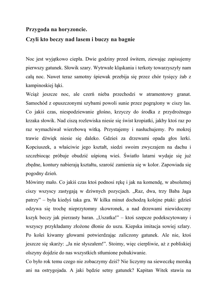 Przygoda na horyzoncie. Czyli kto beczy nad lasem i buczy na bagnie Noc jest wyjątkowo ciepła. Dwie godziny przed świtem, ziewając zapisujemy pierwszy gatunek. Słowik szary. Wytrwałe kląskania i terkoty towarzyszyły nam całą noc. Nawet teraz samotny śpiewak przebija się przez chór tysięcy żab z kampinoskiej łąki. Wciąż jeszcze noc, ale czerń nieba przechodzi w atramentowy granat. Samochód z opuszczonymi szybami powoli sunie przez pogrążony w ciszy las. Co jakiś czas, niespodziewanie głośno, krzyczy do środka z przydrożnego krzaka słowik. Nad ciszą rozlewiska niesie się świst kropiatki, jakby ktoś raz po raz wymachiwał wierzbową witką. Przystajemy i nasłuchujemy. Po mokrej trawie dźwięk niesie się daleko. Gdzieś za drzewami opada głos lerki. Kopciuszek, a właściwie jego kształt, siedzi swoim zwyczajem na dachu i szczebiocąc próbuje obudzić uśpioną wieś. Światło latarni wydaje się już zbędne, kontury nabierają kształtu, szarość zamienia się w kolor. Zapowiada się pogodny dzień. Mówimy mało. Co jakiś czas ktoś podnosi rękę i jak na komendę, w absolutnej ciszy wszyscy zastygają w dziwnych pozycjach. „Raz, dwa, trzy Baba Jaga patrzy” – była kiedyś taka gra. W kilka minut dochodzą kolejne ptaki: gdzieś odzywa się trochę nieprzytomny skowronek, a nad drzewami niewidoczny kszyk beczy jak pierzasty baran. „Uszatka!” – ktoś szepcze podekscytowany i wszyscy przykładamy złożone dłonie do uszu. Kiepska imitacja sowiej szlary. Po kolei kiwamy głowami potwierdzając zaliczony gatunek. Ale nie, ktoś jeszcze się skarży: „Ja nie słyszałem!”. Stoimy, więc cierpliwie, aż z pobliskiej olszyny dojdzie do nas wszystkich stłumione pohukiwanie. Co było rok temu czego nie zobaczymy dziś? Nie liczymy na sieweczkę morską ani na ostrygojada. A jaki będzie setny gatunek? Kapitan Witek stawia na bociana czarnego, Janek na remiza, Asia typuje gąsiorka, Michał bielika, a Piotrek rybitwę białoskrzydłą. W niskim porannym słońcu, przez łąkę przebiega dzik, a tuż za nim, nad powierzchnią trawy błyskają prążkowane grzbiety warchlaków. Słońce oświetla czubki drzew i przyszedł czas na pierwsze zdjęcie: pod tablicą z łosiem i wielkim krzakiem bzu. Na pobliskim drzewie bezwstydnie kopulują piecuszki, a my zagłębiamy się w las. Martwe drzewo z dziurami. „To dobre miejsce na dzięciołka” wyrokuje Piotrek. Dzięciołek widocznie jest innego zdania. Idziemy szybko popędzani przez chmary krwiopijców. Nie, nie przystaniemy tu by kontemplować zapach łanu konwalii. Wskakujemy do samochodu, ale zatrzymuje nas okrzyk Janka: „czekajcie, czekajcie!”. Chwila napięcia, wszyscy celują w jeden punkt. „Raniuszek!”. Siedzi na szczycie brzozy jak bawełniana kulka z ogonem. Koło małego mostu, na uschłym drzewie majestatyczny, długonogi błotniak wypatruje ofiary. W słońcu widać jego zmrużone, żółte oczy. Lustrujemy szybko okolicę i pędzimy dalej, w stronę Wisły. Dzisiaj nie będziemy się rozczulać, każdym potrzeszczem, który śpiewa tak jakby próbował coś za szybko powiedzieć. Droga niczym grobla prowadzi nas pomiędzy podmokłymi łąkami. Zbliżamy się Wisły i co chwilę ktoś woła: „Stop!”. Wyskakujemy w pośpiechu. Widok jak malowany – archaiczne stogi, a na nich pozuje kszyk ze swoim bezsensownie długim dziobem. Pod słońce wydaje się prawie czarny. Gdzieś z łoziny pogwizduje dziwonia. „Nice to meet you. Nice to meet you” przedrzeźnia Asia. Koło dziesiątej łapię mały kryzys. Jak to, to jeszcze nie wieczór? Nad Wisłą mokro, każdy na własną rękę próbuję znaleźć najlepszą przeprawę. Przechodzenie kałuży w kaloszach przypomina bieg z kubkiem pełnym kawy. Pośpiech nie jest wskazany. Gdzieś tu wybija nasz 100 gatunek. Batalion – a więc nikt nie trafił. Jeszcze miesiąc temu były tu ich setki, teraz napotykamy wyjątkowych maruderów. Nad małą zatoczką, na piaszczystej łasze, przycupnęły cztery piękne ohary. Przez lunetę wypatrujemy niespodziewanego gościa. To ostrygojad, w którego zwątpiliśmy. Swoim czerwonym dziobem coś tam wygrzebuje z piachu. Nowe ptaki zaczynają nam przychodzić z trudem. Gdzieś pod Płockiem wyskakujemy na hasło „bielik”. Zjeżdżamy z szosy, a wielkie ptaszysko, przelatuje nad rzekę. Na drugim brzegu pośpiesznie drepce biegus rdzawy, raz po raz zanurzając swój czarny dziób w mule. Słońce się chowa, niebo zaciąga. Spada kilka wielkich kropli deszczu. Dobrze, że akurat teraz, kiedy przed nami 150 kilometrów. Czas odwiedzić stawy w Raszynie, rezerwat-paradoks, w którym można płoszyć ptaki. Na szczęście prześladowane kormorany i czaple niewiele sobie robią z podpływających do ich gniazd łódek. Czas gwałtownie przyśpiesza, więc szybkim krokiem idziemy na staw, gdzie przez ostatnie dni widywano bączka. Po dłuższej chwili Michał wypatruje przygarbiony kształt człapiącego wśród trzcin ptaka. Gdyby nie sprzęt pozostałby dla nas niewidoczny. Za plecami słyszymy znajome gęganie i inny, głęboki, przenikliwy głos. Z pomiędzy drzew wylatuję gęgawa i bernikla kanadyjska. Wydaje się wielka jak łabędź. Co da nam Warszawa? Nie zawodzi puszczyk w Parku Arkadia. Siedzi w ulubionej dziupli i patrzy na nas przymrużonymi oczami, jakby znudzony. Niespodziewanie na jednym z parkowych stawów widzimy kolejną berniklę kanadyjską. Wydaje się zdziwiona poświęcaną jej uwagą. Sprint przez Łazienki pozwala nam dopisać mandarynkę. A na posterunku pod iglicą Pałacu Kultury i Nauki trwa nieruchomy jak egipski posążek sokół wędrowny. Słońce niemal znika za widnokręgiem, kiedy dojeżdżamy do Kuligowa. Dobiega nas głębokie, basowe buczenie niewidocznego bąka, z podmokłych pastwisk fletowo nawołują rycyki. Zapadający zmierzch sprawia, że znowu musimy nadstawić uszu. Stoimy w wieczornej ciszy. Gdzieś przed nami na porośniętej wrzosem w