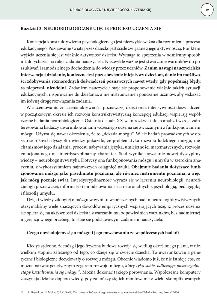 NEUROBIOLOGICZNE UJĘCIE PROCESU UCZENIA SIĘ Rozdział 3. NEUROBIOLOGICZNE UJĘCIE PROCESU UCZENIA SIĘ Koncepcja konstruktywizmu psychologicznego jest niezwykle ważna dla rozumienia procesu edukacyjnego. Poznawanie świata przez dziecko jest ściśle związane z jego aktywnością. Punktem wyjścia uczenia się jest właśnie aktywność dziecka. Wymaga to spojrzenia w odmienny sposób niż dotychczas na rolę i zadania nauczyciela. Niezwykle ważne jest stwarzanie warunków do poszukiwań i samodzielnego dochodzenia do wiedzy przez uczniów. Zanim nastąpi nauczycielska interwencja i działanie, konieczne jest pozostawienie inicjatywy dzieciom, danie im możliwości zdobywania różnorodnych doświadczeń poznawczych nawet wtedy, gdy popełniają błędy, są niepewni, nieudolni. Zadaniem nauczyciela staje się proponowanie właśnie takich sytuacji edukacyjnych, inspirowanie do działania, a nie instruowanie i pouczanie uczniów, aby wskazać im jedyną drogę rozwiązania zadania. W akcentowaniu znaczenia aktywności poznawczej dzieci oraz intensywności doświadczeń w początkowym okresie ich rozwoju konstruktywistyczną koncepcję edukacji wspierają współczesne badania neurobiologiczne. Ostatnia dekada XX w. to rozkwit takich analiz i wzrost zainteresowania badaczy uwarunkowaniami wczesnego uczenia się związanymi z funkcjonowaniem mózgu. Używa się nawet określenia, że to „dekada mózgu”. Wiele badań prowadzonych w obszarze różnych dyscyplin wiedzy pokazało, że problematyka rozwoju ludzkiego mózgu, mechanizmów jego działania, procesu nabywania języka, umiejętności matematycznych, rozwoju emocjonalnego ma interdyscyplinarny charakter. Stąd wynika powstanie nowej dyscypliny wiedzy – neurokognitywistyki. Dotyczy ona funkcjonowania mózgu i umysłu w szerokim znaczeniu, z wykorzystaniem najnowszych osiągnięć nauki. Obejmuje badania dotyczące funkcjonowania mózgu jako przedmiotu poznania, ale również instrumentu poznania, a więc jak mózg poznaje świat. Interdyscyplinarność wyraża się w łączeniu neurobiologii, neurofizjologii poznawczej, informatyki i modelowania sieci neuronalnych z psychologią, pedagogiką i filozofią umysłu. Dzięki wiedzy zdobytej o mózgu w wyniku współczesnych badań neurokognitywistycznych otrzymaliśmy wiele znaczących dowodów empirycznych wspierających tezę, iż proces uczenia się opiera się na aktywności dziecka i stwarzaniu mu odpowiednich warunków, bez nadmiernej ingerencji w jego przebieg, to staje się podstawowym zadaniem nauczyciela. Czego dowiadujemy się o mózgu i jego powstawaniu ze współczesnych badań? Kiedyś sądzono, że mózg i jego fizyczna budowa rozwija się według określonego planu, w niewielkim stopniu zależnego od tego, co dzieje się w świecie dziecka. To uwarunkowania genetyczne i biologiczne decydowały o rozwoju mózgu. Obecnie wiadomo już, że nie istnieje coś, co można nazwać genetycznym zegarem rozwoju mózgu, który tyka sobie, odliczając poszczególne etapy kształtowania się mózgu13. Można dokonać takiego porównania. Współczesne komputery zaczynają działać dopiero wtedy, gdy zakończy się ich montowanie z wielu skomplikowanych 13 $*RSQLN$10HOW]RII3..XKO1DXNRZLHFZNRá\VFH&]HJRRXP\ĞOHXF]ąQDVPDáHG]LHFL"0HGLD5RG]LQD3R]QDĔ 19 NEUROBIOLOGICZNE UJĘCIE PROCESU UCZENIA SIĘ 20 elementów i części. Gdy go uruchomimy to rozpoczyna się jego działanie, ale elementy budowy nie będą ulegały zasadniczym zmianom, bez względu na długość użytkowania, stanowią stałe fragmenty tego urządzenia. W przypadku mózgu jest inaczej. Gdy zaczyna funkcjonować nie jest jeszcze „kompletnie zmontowany”. I co więcej tworzy nowe połączenia już po uruchomieniu, w czasie swojego działania. Na jego budowę, kształt połączeń i obwodów bardzo duży wpływ mają doświadczenia. One modyfikują mózg. Wszystko, co dziecko widzi, słyszy, próbuje językiem, wącha, wpływa na sposób, w jaki mózg tworzy nowe połączenia14. Jednym słowem jesteśmy aktywnymi uczestnikami konstruowania naszych mózgów, a nasze doświadczenia są bardzo różne, stąd każdy z nas dysponuje mózgiem o specyficznych dla siebie właściwościach. Mózg osoby dorosłej dysponuje ogromnie skomplikowaną i gęstą siecią połączeń, szacuje się je na ok. 1000 bilionów. Każdy człowiek ma specyficzny, odmienny od innych wzór połączeń. Zatem nasz mózg nadaje nam indywidualne cechy. Fascynującym doświadczeniem staje się poznawanie procesu rozwoju mózgu. Dorosły człowiek dysponuje 100 miliardami komórek nerwowych w mózgu, zwanych neuronami. To liczba porównywalna z liczbą gwiazd Drogi Mlecznej. W mózgu niemowlęcia jest już ukształtowana większość tych neuronów, ale jednocześnie waży on ¼ mózgu dorosłego. Co więc rośnie i zmienia się w czasie rozwoju? Otóż rosną neurony, ale to co ulega zasadniczym zmianom to siatka połączeń między komórkami. Warunkiem tworzenia się tej siatki połączeń międzykomórkowych w mózgu jest aktywność dziecka i gromadzone doświadczenia. Komórki rosną w różnych częściach mózgu, aby na siebie oddziaływać muszą się komunikować, czyli łączyć, często na odległość. Neurony więc wytwarzają sieć połączeń, które umożliwiają tę komunikację. Grupy komórek wysyłają falami sygnały w tym samym czasie, wytwarzają między sobą połączenia (ulubionym powiedzeniem badaczy mózgu jest: Neurony, które jednocześnie się aktywizują, łączą się)15. Gdy komórki wysyłają między sobą sygnały z dużą częstotliwością tworzą się trwałe połączenia. Gdy dojrzewają, rozgałęziają się i tworzą nowe połączenia. Rozgałęzienia zwane aksonami przekazują informacje z komórki na zewnątrz, zaś rozgałęzienia dendrytowe do wewnątrz. Następuje więc połączenie aksonu z dendrytem. Połączenie między komórkami nazywa się synapsą. Liczba synaps w mózgu informuje o post