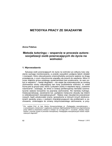 A. Fidelus METODYKA PRACY ZE SKAZANYMI Anna Fidelus Metoda tutoringu – wsparcie w procesie autoresocjalizacji osób powracających do Ŝycia na wolności 1. Wprowadzenie Sytuacja osób powracających do Ŝycia na wolności po odbyciu kary więzienia wymaga monitorowania, a przede wszystkim podjęcia takich działań i rozwiązań, które zdecydowanie uniemoŜliwiłyby ponowne wejście na drogę przestępczą, z czym nieuchronnie wiązałby się powrót do więzienia. Mimo iŜ coraz większa grupa polskiego społeczeństwa jest przekonana, Ŝe sam pobyt w więzieniu – nawet długoletni – nie wiąŜe się automatycznie ze zmianą zachowania osoby odbywającej tam karę pozbawienia wolności, to nadal liczna jest ta grupa ludzi, która z pobytem osoby w więzieniu łączy „cudowne nawrócenie”, uwaŜając, Ŝe okres w izolacji penitencjarnej niemalŜe automatycznie wpływa korzystnie na poprawę zachowania. Nic bardziej mylnego. Instytucjonalizacja, zaostrzenie kar, podejście medyczne okazały się mitami w oddziaływaniach resocjalizacyjnych1. NaleŜy więc nieustannie poszukiwać nowych, bądź udoskonalać znane, sprawdzone w róŜnych innych okolicznościach sposoby pracy z osobami charakteryzującymi się problemami w zachowaniu, zmierzające do zmiany dotychczasowego zachowania, w przy1 Por. wykład Prof. dr hab. Marka Konopczyńskiego pt. „Pedagogika resocjalizacyjna – w poszukiwaniu toŜsamości” wygłoszony podczas Ogólnopolskiej Konferencji organizowanej przez UMCS w Kazimierzu Dolnym w dniach 12–13 maja 2011 r. na temat: „Zasoby indywidualne i czynniki ryzyka w procesie resocjalizacji. Pedagogika resocjalizacyjna wobec współczesnych zagroŜeń”. 82 Probacja 1, 2012 Metoda tutoringu – wsparcie w procesie autoresocjalizacji... padku pracy resocjalizacyjnej – zmiany funkcjonowania o charakterze przestępczym. Nie jest to zadanie łatwe, szczególnie we współczesnych czasach, które charakteryzują się nieustannymi przeobraŜeniami w obszarze Ŝycia społecznego, brakiem przejrzystości relacji międzyludzkich, chaosem w świecie wartości i porządku aksjonormatywnego. Ludziom dzisiejszym doskwiera brak środków do budowy solidnych, trwałych toŜsamości, a nie znajdują oni gruntu, w którym mogliby nabytą toŜsamość zakotwiczyć, chroniąc ją przed dryfowaniem2. Tego rodzaju zjawiska Ŝycia społecznego z pewnością nie ułatwiają pracy resocjalizacyjnej z osobami mającymi za sobą przeszłość przestępczą, pobyt w izolacji więziennej, a takŜe charakteryzujących się „zranioną toŜsamością”. A przecieŜ, jak zauwaŜył Charles Taylor, jednym z aspektów kreowania toŜsamości ludzkiej jest problem tzw. dramatu uznania. „Od chwili, gdy aspirujemy do samookreślenia, zwłaszcza oryginalnego, pojawia się potencjalna niezgodność między istnieniem, do którego pretendujemy, a istnieniem, które inni gotowi są nam przyznać. Jest to przestrzeń uznania, o które się dopominamy, ale którego inni mogą nam odmówić”3. Tym bardziej proces korygujący zachowanie osób odczuwających problemy toŜsamościowe w otoczeniu mało stabilnym, zrelatywizowanym, nie jest zadaniem łatwym. „ToŜsamość jest zjawiskiem wyrastającym z dialektycznego związku między jednostką a społeczeństwem”4, toteŜ w procesie resocjalizacji bardzo waŜnym elementem jest budowanie i wzmacnianie prawidłowych relacji osoby resocjalizowanej z otoczeniem społecznym. Nie bez znaczenia dla funkcjonowania człowieka po opuszczeniu zakładu karnego jest przebieg procesu resocjalizacji penitencjarnej, realizowanego w trakcie pobytu w zakładzie karnym. H. Machel określa resocjalizację penitencjarną jako „ogół oddziaływań zamierzonych i zaprogramowanych przez personel pedagogiczno-psychologiczny adresowanych do przestępców odbywających karę pozbawienia wolności w zakładach karnych”, której celem jest „uzyskanie takich zmian w obszarze osobowości tych osób, które uchronią je od powrotu do zachowań przestępczych po odbyciu kary i umoŜliwią poprawne funkcjonowanie społeczne”5. Mimo wielu głosów krytyki dotyczących resocjalizacji penitencjarnej naleŜy wyraźnie zaznaczyć, Ŝe w polskich zakładach karnych z roku na rok podejmowanych jest wiele róŜnorodnych działań pomocowych pozwalających na zmianę zachowania osób, do których są skierowane. Dlaczego więc dostrzegamy 2 Z. B a u m a n, ToŜsamość, Gdańsk 2007, s. 52. A. J a w ł o w s k a, ToŜsamość na sprzedaŜ, (w:) A. J a w ł o w s k a (red.), Wokół problemów toŜsamości, Warszawa 2001, s. 54. 4 P. L. B e r g e r, T. L u c k m a n n, Społeczne tworzenie rzeczywistości, Warszawa 2010, s. 251. 5 H. M a c h e l, Resocjalizacja penitencjarna: istota, dylematy terminologiczne, społeczny sens, kilka uwag teoretycznych i kadrowych, Resocjalizacja Polska, Rocznik 2010, nr 1, s. 176. 3 Probacja 1, 2012 83 A. Fidelus wręcz paradoksalną sytuację: zwiększenie róŜnorodnych ofert pomocowych na terenie zakładów karnych nie koresponduje z lepszym, tzn. pozaprzestępczym funkcjonowaniem byłych skazanych w warunkach wolnościowych?6. Odpowiedzi na postawione pytanie jest wiele. Z pewnością naleŜałoby zwrócić uwagę na konieczność przeorganizowania pewnych elementów samego systemu penitencjarnego, a takŜe charakteru jakości działań w konkretnych relacjach ze skazanym. NaleŜy zauwaŜyć, Ŝe często bez zmian w organizacji samego systemu penitencjarnego nie są moŜliwe przeobraŜenia na polu konkretnych działań resocjalizacyjnych, zmierzających do udanego powrotu skazanego do wolnościowego Ŝycia społecznego. Dla przykładu przywołam chociaŜby często przytaczane dane o przeludnieniu więzień, które na pewno nie wspomagają działań resocjalizacyjnych prowadzonych w grupie osób tam przebywających. A przecieŜ przeludnienie to nie jedyny mankament natury organizacyjnej zakładów karnych. W niniejszym artykule podejmę rozwaŜan