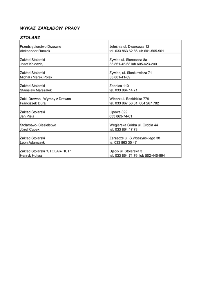 WYKAZ ZAKŁADÓW PRACY STOLARZ