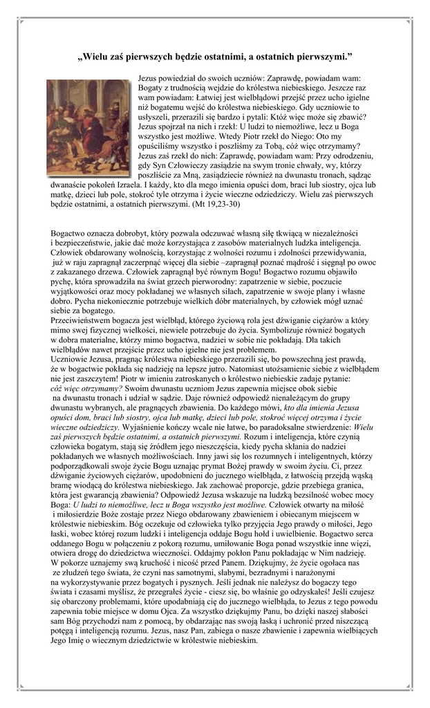 „Wielu zaś pierwszych będzie ostatnimi, a ostatnich pierwszymi.” Jezus powiedział do swoich uczniów: Zaprawdę, powiadam wam: Bogaty z trudnością wejdzie do królestwa niebieskiego. Jeszcze raz wam powiadam: Łatwiej jest wielbłądowi przejść przez ucho igielne niż bogatemu wejść do królestwa niebieskiego. Gdy uczniowie to usłyszeli, przerazili się bardzo i pytali: Któż więc może się zbawić? Jezus spojrzał na nich i rzekł: U ludzi to niemożliwe, lecz u Boga wszystko jest możliwe. Wtedy Piotr rzekł do Niego: Oto my opuściliśmy wszystko i poszliśmy za Tobą, cóż więc otrzymamy? Jezus zaś rzekł do nich: Zaprawdę, powiadam wam: Przy odrodzeniu, gdy Syn Człowieczy zasiądzie na swym tronie chwały, wy, którzy poszliście za Mną, zasiądziecie również na dwunastu tronach, sądząc dwanaście pokoleń Izraela. I każdy, kto dla mego imienia opuści dom, braci lub siostry, ojca lub matkę, dzieci lub pole, stokroć tyle otrzyma i życie wieczne odziedziczy. Wielu zaś pierwszych będzie ostatnimi, a ostatnich pierwszymi. (Mt 19,23-30) Bogactwo oznacza dobrobyt, który pozwala odczuwać własną siłę tkwiącą w niezależności i bezpieczeństwie, jakie dać może korzystająca z zasobów materialnych ludzka inteligencja. Człowiek obdarowany wolnością, korzystając z wolności rozumu i zdolności przewidywania, już w raju zapragnął zaczerpnąć więcej dla siebie –zapragnął poznać mądrość i sięgnął po owoc z zakazanego drzewa. Człowiek zapragnął być równym Bogu! Bogactwo rozumu objawiło pychę, która sprowadziła na świat grzech pierworodny: zapatrzenie w siebie, poczucie wyjątkowości oraz mocy pokładanej we własnych siłach, zapatrzenie w swoje plany i własne dobro. Pycha niekoniecznie potrzebuje wielkich dóbr materialnych, by człowiek mógł uznać siebie za bogatego. Przeciwieństwem bogacza jest wielbłąd, którego życiową rola jest dźwiganie ciężarów a który mimo swej fizycznej wielkości, niewiele potrzebuje do życia. Symbolizuje również bogatych w dobra materialne, którzy mimo bogactwa, nadziei w sobie nie pokładają. Dla takich wielbłądów nawet przejście przez ucho igielne nie jest problemem. Uczniowie Jezusa, pragnąc królestwa niebieskiego przerazili się, bo powszechną jest prawdą, że w bogactwie pokłada się nadzieję na lepsze jutro. Natomiast utożsamienie siebie z wielbłądem nie jest zaszczytem! Piotr w imieniu zatroskanych o królestwo niebieskie zadaje pytanie: cóż więc otrzymamy? Swoim dwunastu uczniom Jezus zapewnia miejsce obok siebie na dwunastu tronach i udział w sądzie. Daje również odpowiedź nienależącym do grupy dwunastu wybranych, ale pragnących zbawienia. Do każdego mówi, kto dla imienia Jezusa opuści dom, braci lub siostry, ojca lub matkę, dzieci lub pole, stokroć więcej otrzyma i życie wieczne odziedziczy. Wyjaśnienie kończy wcale nie łatwe, bo paradoksalne stwierdzenie: Wielu zaś pierwszych będzie ostatnimi, a ostatnich pierwszymi. Rozum i inteligencja, które czynią człowieka bogatym, stają się źródłem jego nieszczęścia, kiedy pycha skłania do nadziei pokładanych we własnych możliwościach. Inny jawi się los rozumnych i inteligentnych, którzy podporządkowali swoje życie Bogu uznając prymat Bożej prawdy w swoim życiu. Ci, przez dźwiganie życiowych ciężarów, upodobnieni do jucznego wielbłąda, z łatwością przejdą wąską bramę wiodącą do królestwa niebieskiego. Jak zachować proporcje, gdzie przebiega granica, która jest gwarancją zbawienia? Odpowiedź Jezusa wskazuje na ludzką bezsilność wobec mocy Boga: U ludzi to niemożliwe, lecz u Boga wszystko jest możliwe. Człowiek otwarty na miłość i miłosierdzie Boże zostaje przez Niego obdarowany zbawieniem i obiecanym miejscem w królestwie niebieskim. Bóg oczekuje od człowieka tylko przyjęcia Jego prawdy o miłości, Jego łaski, wobec której rozum ludzki i inteligencja oddaje Bogu hołd i uwielbienie. Bogactwo serca oddanego Bogu w połączeniu z pokorą rozumu, umiłowanie Boga ponad wszystkie inne więzi, otwiera drogę do dziedzictwa wieczności. Oddajmy pokłon Panu pokładając w Nim nadzieję. W pokorze uznajemy swą kruchość i nicość przed Panem. Dziękujmy, że życie ogołaca nas ze złudzeń tego świata, że czyni nas samotnymi, słabymi, bezradnymi i narażonymi na wykorzystywanie przez bogatych i pysznych. Jeśli jednak nie należysz do bogaczy tego świata i czasami myślisz, że przegrałeś życie - ciesz się, bo właśnie go odzyskałeś! Jeśli czujesz się obarczony problemami, które upodabniają cię do jucznego wielbłąda, to Jezus z tego powodu zapewnia tobie miejsce w domu Ojca. Za wszystko dziękujmy Panu, bo dzięki naszej słabości sam Bóg przychodzi nam z pomocą, by obdarzając nas swoją łaską i uchronić przed niszczącą potęgą i inteligencją rozumu. Jezus, nasz Pan, zabiega o nasze zbawienie i zapewnia wielbiących Jego Imię o wiecznym dziedzictwie w królestwie niebieskim.