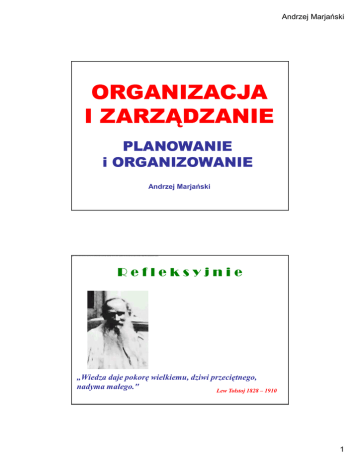 Andrzej Marjański ORGANIZACJA I ZARZĄDZANIE PLANOWANIE i ORGANIZOWANIE Andrzej Marjański A by chronić pry watność uŜy tk ownik a, program PowerPoint uniemoŜliwił automaty czne pobranie tego zewnętrznego obrazu. A by pobrać i wy świetlić ten obraz, k lik nij przy cisk Opcje na pask u k omunik atów, a następnie k lik nij opcję Włącz zawartość zewnętrzną. Refleksyjnie „Wiedza daje pokorę wielkiemu, dziwi przeciętnego, nadyma małego." Lew Tołstoj 1828 – 1910 1 Andrzej Marjański Andrzej Marjański (56) 3 Główne funkcje zarządzania PLANOWANIE ORGANIZOWANIE PODEJMOWANIE DECYZJI. CELE NASZEJ ORGANIZACJI PRZYWÓDZTWO KONTROLOWANIE Planowanie Zdolność do planowania uznawana jest za najwaŜniejszą umiejętność człowieka Obejmuje ustalanie celów oraz formułowanie planów. Pozwala zatem odpowiedzieć na dwa podstawowe pytania: co naleŜy robić? jak to robić? 2 Andrzej Marjański Andrzej Marjański (56) 5 Planowanie Planowanie jest działalnością uniwersalną, uprawianą przez wszystkie organizacje. śadna z organizacji nie planuje w identyczny sposób. Działalność - Działać mogą tylko ludzie – poniewaŜ tylko człowiek posiada zdolność wyobraŜania sobie z góry celu własnego działania Funkcjonowanie - Działania instynktowne, wykonywane pod przymusem lub bez udziału świadomości Andrzej Marjański (56) 6 Planowanie Planowanie umoŜliwia przewidywanie przyszłych trendów określanie najlepszej strategii i taktyki umoŜliwiających osiągnięcie celów organizacji. określa cele (co ma być zrobione) określa środki (jak ma być zrobione). * 3 Andrzej Marjański Andrzej Marjański (56) 7 Planowanie odpowiada na trzy fundamentalne dla przedsiębiorstwa pytania. 1. Jak przedstawia się obecna sytuacja? Jaki jest stan gospodarki? Jakie są moŜliwości zaspokojenia zapotrzebowania ludzi? Jak wielka jest konkurencja? 2. Dokąd zmierzamy? 3. Jak zamierzamy osiągnąć cel? – Główna część planowania * Andrzej Marjański (56) 8 Cele organizacji Działanie dokonywane jest ze względu na określony, uświadomiony sobie cel przez podejmującego działanie Cel – jest to coś co zamierzamy osiągnąć w przyszłości, na tyle cenne (poŜądane) dla działającego, Ŝe dla jego spowodowania lub utrzymania jest on gotów podjąć działanie. 4 Andrzej Marjański Andrzej Marjański (56) 9 Funkcje celów w organizacji Stanowią wskazówkę i nadają jednolity kierunek działaniom ludzi pracujących w organizacji. Pozwalają zrozumieć dokąd organizacja zmierza i dlaczego jest waŜne osiągnięcie stanu docelowego. Praktyka ustalania celów wpływa na planowanie. Dobre wytyczanie celów sprzyja dobremu planowaniu, a ono ułatwia ustalanie celów w przyszłości. Cele mogą być źródłem motywacji dla pracowników organizacji. Sformułowane konkretnie, o umiarkowanym stopniu trudności, mogą motywować ludzi do cięŜszej pracy, zwłaszcza jeŜeli osiągnięcie celu moŜe zostać nagrodzone. Cele dają skuteczny mechanizm oceny i kontroli. Przyszłe wyniki będzie moŜna oceniać na podstawie stopnia realizacji wytyczonych dziś celów * Andrzej Marjański (56) 10 Klasyfikacja celów Klasyfikacja celów moŜe być dokonywane ze względu na róŜne kryteria np.: udatność działania spontaniczność wyboru hierarchię zakres stopień zgodności stopniowalność czas realizacji Klasyfikacje te są uŜyteczne, poniewaŜ zwracają uwagę na zaleŜności między celami i potencjalne problemy w realizacji * 5 Andrzej Marjański Andrzej Marjański (56) 11 Klasyfikacja celów Udatność działania Główne – dla których osiągnięcia działanie jest podejmowane Uboczne – których realizacja zwiększa wynik uŜyteczny działania, dla nich samych działanie nie zostałoby podjęte. Spontaniczność wyboru Własne – spontaniczne Zadane – przewaŜające. Znaczenie ma identyfikowanie się działającego z celem sformułowanym przez kogoś innego. Andrzej Marjański (56) 12 Klasyfikacja celów Hierarchia Końcowe – efekt końcowy działania Pośrednie – są tylko środkami, których osiągnięcie, stanowi warunek osiągnięcia celu końcowego. Zakres Indywidualne – poszczególnych członków danej organizacji Partykularne – podzielane przez członków danej grupy społecznej zarówno formalnej jak i nieformalnej. Instytucjonalne – wspólne dla członków organizacji. 6 Andrzej Marjański Andrzej Marjański (56) 13 Klasyfikacja celów Zgodność Współrzędne – co najmniej niesprzeczne Konkurencyjne – ich realizacja wymaga zuŜywania tych samych ograniczonych zasobów. Alternatywne – realizacja jednego celu wyklucza realizację pozostałych Stopniowalność Stopniowalne – moŜliwe do osiągnięcia w roŜnym stopniu Niestopniowalne – osiąga się je całkowicie, albo w ogóle się nie osiąga. * Andrzej Marjański (56) 14 Klasyfikacja celów Czasookres Długookresowe – strategiczne (kilka lat) Średniookresowe – taktyczne (co najmniej 1 rok) Krótkookresowe – operacyjne (do 1 roku) Zachodzi konieczność zapewnienia zgodności między celami realizowanymi w róŜnych okresach * 7 Andrzej Marjański Andrzej Marjański 15 (56) Proces planowania Planowanie odbywa się w kontekście określonego otoczenia Zrozumienie i poznanie otoczenia jest pierwszym krokiem w planowaniu i ma podstawowe znaczenie Zrozumienie otoczenia jest niezbędne do ustalenia ogólnego posłannictwa organizacji czyli MISJI Misja organizacji wyznacza cel organizacji, załoŜenia, wartości i kierunki Z misji wypływają równoległe strumienie celów i planów * Andrzej Marjański 16 (56) Proces planowania Otoczenie Misja organizacji Cele Przesłanki Wartości Kierunki Cele strategiczne Cele taktyczne Cele operacyjne Plany strategiczne Plany taktyczne Plany operacyjne Źródło: R.W. Griffin, Podstawy zarządzania organizacjami, s. 200 8 Andrzej Marjański Andrzej Marjański (56) 17 Misja organizacji Planowanie celów musi rozpoczynać się od określenia c