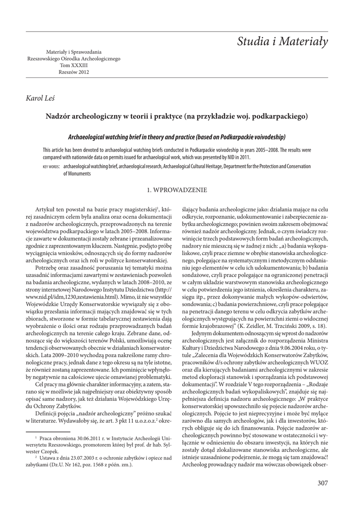 Studia i Materiały Materiały i Sprawozdania Rzeszowskiego Ośrodka Archeologicznego Tom XXXIII Rzeszów 2012 Karol Leś Nadzór archeologiczny w teorii i praktyce (na przykładzie woj. podkarpackiego) Archaeological watching brief in theory and practice (based on Podkarpackie voivodeship) This article has been devoted to archaeological watching briefs conducted in Podkarpackie voivodeship in years 2005–2008. The results were compared with nationwide data on permits issued for archaeological work, which was presented by NID in 2011. key words: archaeological watching brief, archaeological research, Archaeological Cultural Heritage, Department for the Protection and Conservation of Monuments 1. Wprowadzenie Artykuł ten powstał na bazie pracy magisterskiej1, której zasadniczym celem była analiza oraz ocena dokumentacji z nadzorów archeologicznych, przeprowadzonych na terenie województwa podkarpackiego w latach 2005–2008. Informacje zawarte w dokumentacji zostały zebrane i przeanalizowane zgodnie z zaprezentowanym kluczem. Następnie, podjęto próbę wyciągnięcia wniosków, odnoszących się do formy nadzorów archeologicznych oraz ich roli w polityce konserwatorskiej. Potrzebę oraz zasadność poruszania tej tematyki można uzasadnić informacjami zawartymi w zestawieniach pozwoleń na badania archeologiczne, wydanych w latach 2008–2010, ze strony internetowej Narodowego Instytutu Dziedzictwa (http:// www.nid.pl/idm,1230,zestawienia.html). Mimo, iż nie wszystkie Wojewódzkie Urzędy Konserwatorskie wywiązały się z obowiązku przesłania informacji mających znajdować się w tych zbiorach, stworzone w formie tabelarycznej zestawienia dają wyobrażenie o ilości oraz rodzaju przeprowadzanych badań archeologicznych na terenie całego kraju. Zebrane dane, odnoszące się do większości terenów Polski, umożliwiają ocenę tendencji obserwowanych obecnie w działaniach konserwatorskich. Lata 2009–2010 wychodzą poza nakreślone ramy chronologiczne pracy, jednak dane z tego okresu są na tyle istotne, że również zostaną zaprezentowane. Ich pominięcie wpłynęłoby negatywnie na całościowe ujecie omawianej problematyki. Cel pracy ma głównie charakter informacyjny, a zatem, starano się w możliwie jak najpełniejszy oraz obiektywny sposób opisać same nadzory, jak też działania Wojewódzkiego Urzędu Ochrony Zabytków. Definicji pojęcia „nadzór archeologiczny” próżno szukać w literaturze. Wydawałoby się, że art. 3 pkt 11 u.o.z.o.z.2 okre1 Praca obroniona 30.06.2011 r. w Instytucie Archeologii Uniwersytetu Rzeszowskiego, promotorem której był prof. dr hab. Sylwester Czopek. 2 Ustawa z dnia 23.07.2003 r. o ochronie zabytków i opiece nad zabytkami (Dz.U. Nr 162, poz. 1568 z późn. zm.). ślający badania archeologiczne jako: działania mające na celu odkrycie, rozpoznanie, udokumentowanie i zabezpieczenie zabytku archeologicznego; powinien swoim zakresem obejmować również nadzór archeologiczny. Jednak, o czym świadczy rozwinięcie trzech podstawowych form badań archeologicznych, nadzory nie mieszczą się w żadnej z nich: „a) badania wykopaliskowe, czyli prace ziemne w obrębie stanowiska archeologicznego, polegające na systematycznym i metodycznym odsłanianiu jego elementów w celu ich udokumentowania; b) badania sondażowe, czyli prace polegające na ograniczonej penetracji w całym układzie warstwowym stanowiska archeologicznego w celu potwierdzenia jego istnienia, określenia charakteru, zasięgu itp., przez dokonywanie małych wykopów-odwiertów, sondowania; c) badania powierzchniowe, czyli prace polegające na penetracji danego terenu w celu odkrycia zabytków archeologicznych występujących na powierzchni ziemi o widocznej formie krajobrazowej” (K. Zeidler, M. Trzciński 2009, s. 18). Jedynym dokumentem odnoszącym się wprost do nadzorów archeologicznych jest załącznik do rozporządzenia Ministra Kultury i Dziedzictwa Narodowego z dnia 9.06.2004 roku, o tytule „Zalecenia dla Wojewódzkich Konserwatorów Zabytków, pracowników d/s ochrony zabytków archeologicznych WUOZ oraz dla kierujących badaniami archeologicznymi w zakresie metod eksploracji stanowisk i sporządzania ich podstawowej dokumentacji”. W rozdziale V tego rozporządzenia – „Rodzaje archeologicznych badań wykopaliskowych”, znajduje się najpełniejsza definicja nadzoru archeologicznego: „W praktyce konserwatorskiej upowszechniło się pojecie nadzorów archeologicznych. Pojęcie to jest nieprecyzyjne i może być mylące zarówno dla samych archeologów, jak i dla inwestorów, których obliguje się do ich finansowania. Pojęcie nadzorów archeologicznych powinno być stosowane w ostateczności i wyłącznie w odniesieniu do obszaru inwestycji, na których nie zostały dotąd zlokalizowane stanowiska archeologiczne, ale istnieje uzasadnione podejrzenie, że mogą się tam znajdować! Archeolog prowadzący nadzór ma wówczas obowiązek obser- 307 Tab el a 1 Udział (%) nadzorów archeologicznych (N) w wydanych pozwoleniach konserwatorskich (P), na terenie Polski w latach 2008–2010 Tab el l e 1 Prozentueller Anteil der archäologischen Aufsichten (N) an den konservatorischen Genehmigungen (P) in den Jahren 2008–2010 auf den polnischen Gebieten Województwo 2008 r. P N 2009 r. % P N 2010 r. % P N % Dolnośląskie 1460 470 32,2 1496 414 27,7 1763 695 39,4 Kujawsko-Pomorskie 313 286 91,4 427 309 72,4 376 204 54,2 Lubelskie 156 105 67,3 97 67 69,1 233 133 57,1 Lubuskie 311 80 25,7 276 195 70,6 243 176 72,4 Łódzkie 368 239 64,9 386 289 74,9 58 45 77,6 Małopolskie 18 1 5,5 23 0 0 3 0 0 Mazowieckie 106 59 55,7 177 124 70,1 354 196 55,4 Opolskie 27 21 77,8 91 61 67 43 37 86 Podkarpackie 93 47 49,5 132 63 47,4 146 57 39 Podlaskie 93 38 40,9 76 45 59,2 84 46 54,8 Pomorskie 74 14 18,9 110 27 24,5 184 57 30,1 Śląskie 308 69 22,4 322 88 27,3 320 8 2,5 Świętokrzyskie 90 52 57,8 145 105 72,4 162 4 2,5 Warmińsko-Mazurskie 182 94 51,6 198 126 6