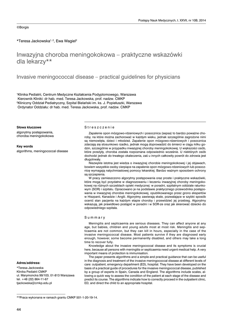 Postępy Nauk Medycznych, t. XXVII, nr 10B, 2014 ©Borgis *Teresa Jackowska1, 2, Ewa Wagiel2 Inwazyjna choroba meningokokowa – praktyczne wskazówki dla lekarzy** Invasive meningococcal disease – practical guidelines for physicians 1 Klinika Pediatrii, Centrum Medyczne Kształcenia Podyplomowego, Warszawa Kierownik Kliniki: dr hab. med. Teresa Jackowska, prof. nadzw. CMKP 2 Kliniczny Oddział Pediatryczny, Szpital Bielański im. ks. J. Popiełuszki, Warszawa Ordynator Oddziału: dr hab. med. Teresa Jackowska, prof. nadzw. CMKP Słowa kluczowe Streszczenie algorytmy postępowania, choroba meningokokowa Zapalenie opon mózgowo-rdzeniowych i posocznica (sepsa) to bardzo poważne choroby, na które można zachorować w każdym wieku, jednak szczególnie zagrożone nimi są niemowlęta, dzieci i młodzież. Zapalenie opon mózgowo-rdzeniowych i posocznica zdarzają się stosunkowo rzadko, jednak mogą doprowadzić do śmierci w ciągu kilku godzin, szczególnie w przypadku inwazyjnej choroby meningokokowej. U większości osób, które przeżyły, choroba została rozpoznana odpowiednio wcześnie. U niektórych osób dochodzi jednak do trwałego okaleczenia, zaś u innych całkowity powrót do zdrowia jest długotrwały. Niezwykle istotna jest wiedza o inwazyjnej chorobie meningokokowej i jej objawach, bowiem wszystkie osoby cierpiące na zapalenie opon mózgowo-rdzeniowych lub posocznicę wymagają natychmiastowej pomocy lekarskiej. Bardzo ważnym sposobem ochrony są szczepienia. W pracy zamieszczono algorytmy postępowania oraz proste i praktyczne wskazówki, które mogą być przydatne w diagnozowaniu i leczeniu inwazyjnej choroby meningokokowej na różnych szczeblach opieki medycznej: w poradni, szpitalnym oddziale ratunkowym (SOR) i szpitalu. Opracowano je na podstawie praktycznego przewodnika postępowania w inwazyjnej chorobie meningokokowej, opublikowanego przez grono ekspertów w Hiszpanii, Kanadzie i Anglii. Algorytmy zawierają skale, pozwalające w szybki sposób ocenić stan pacjenta na każdym etapie choroby i przewidzieć jej przebieg. Algorytmy wskazują, jak prawidłowo postąpić w poradni i w SOR-ze oraz jak skierować dziecko do odpowiedniego szpitala. Key words algorithms, meningococcal disease Summary Adres/address: *Teresa Jackowska Klinika Pediatrii CMKP ul. Marymoncka 99/103, 01-813 Warszawa tel. +48 (22) 864-11-67 [email protected] Meningitis and septicaemia are serious diseases. They can affect anyone at any age, but babies, children and young adults most at most risk. Meningitis and septicaemia are not common, but they can kill in hours, especially in the case of the invasive meningococcal disease. Most patients survive if they are diagnosed early enough, however, some become permanently disabled, and others may take a long time to recover fully. Knowledge about the invasive meningococcal disease and its symptoms is crucial here, because all persons with meningitis or septicaemia need urgent medical help. A very important means of protection is immunisation. The paper presents algorithms and a simple and practical guidance that can be useful in the diagnosis and treatment of the invasive meningococcal disease at different levels of care: outpatient, emergency department (ED), hospital. They have been developed on the basis of a practical guide of procedures for the invasive meningococcal disease, published by a group of experts in Spain, Canada and England. The algorithms include scales, allowing a quick way to assess the condition of the patient at each stage of the disease and predict its course. The algorithms indicate how to correctly proceed in the outpatient clinic, ED, and direct the child to an appropriate hospital. **Praca wykonana w ramach grantu CMKP 501-1-20-19-14. 44 Inwazyjna choroba meningokokowa – praktyczne wskazówki dla lekarzy WSTĘP Zapalenie opon mózgowo-rdzeniowych i posocznica (sepsa) to bardzo poważne choroby, na które można zachorować w każdym wieku. Zdarzają się stosunkowo rzadko, jednak mogą doprowadzić do śmierci w ciągu kilku godzin, zwłaszcza w przypadku inwazyjnej choroby meningokokowej (IChM). Szczególnie zagrożone są niemowlęta, dzieci i młodzież. U większości osób, które przeżyły, choroba została rozpoznana odpowiednio wcześnie. Z tego względu niezwykle istotne są: znajomość objawów, prawidłowa ocena stanu pacjenta, szybka i prawidłowa interwencja na różnych szczeblach opieki medycznej: w poradni, szpitalnym oddziale ratunkowym (SOR) i szpitalu. Wszystkie osoby cierpiące na zapalenie opon mózgowo-rdzeniowych lub posocznicę wymagają natychmiastowej pomocy lekarskiej. Bardzo ważnym sposobem ochrony są szczepienia. W 2011 roku w Europie zapadalność na IChM wynosiła 0,75/100 000 mieszkańców i była niższa niż w 2007 roku (1,02/100 000). Jednak u dzieci poniżej 5. roku życia zapadalność jest wyższa i wynosi 5,73/100 000, a u osób w wieku 15-24 lata – 1,29/100 000 (1). W Polsce zapadalność na IChM według danych Krajowego Ośrodka Referencyjnego ds. Diagnostyki Bakteryjnych Zakażeń Ośrodkowego Układu Nerwowego (KOROUN) w 2012 roku wynosiła 0,62/100 000 mieszkańców. Dane z lat 2002-2011 wskazują, że ponad 46% wszystkich zakażeń występuje u dzieci poniżej 5. r.ż., w tym 21% u dzieci poniżej pierwszego r.ż., u których zapadalność na IChM w 2012 roku wyniosła 13,96/100 000 (2). W latach 70. XX wieku w Hiszpanii stwierdzono wzrost zachorowań na IChM. W 1979 roku notowano prawie 18 przypadków na 100 000 mieszkańców, przy średniej zapadalności w Europie poniżej 1/100 000. Wśród zachorowań przeważał serotyp B. W kolejnych latach liczba zachorowań zmniejszała się, jednak zaczął przeważać serotyp C, który powodował znacznie cięższy przebieg choroby i większą śmiertelność (3). Dlatego też w 1996 roku wprowadzono do programu szczepień ochronnych powszechne, obowiązkowe szczepienia przeciwko meningokokom. Liczba zachorowań zmniejszy
