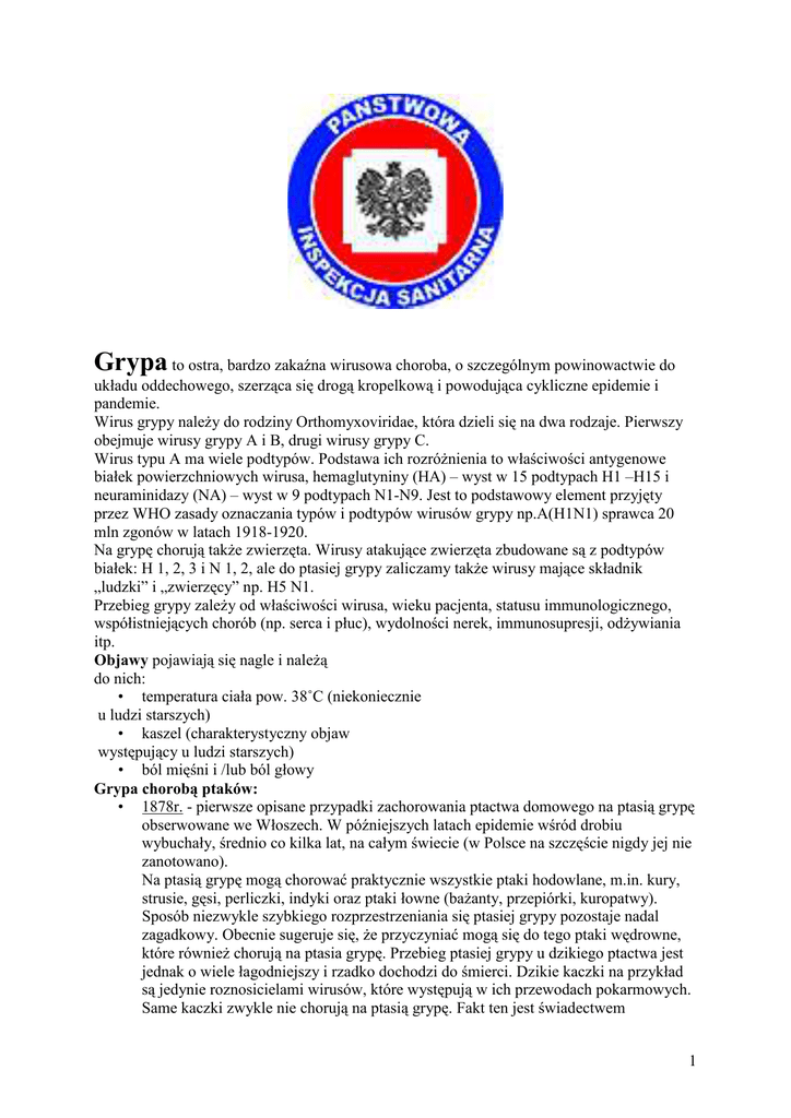 Grypa to ostra, bardzo zakaźna wirusowa choroba, o szczególnym powinowactwie do układu oddechowego, szerząca się drogą kropelkową i powodująca cykliczne epidemie i pandemie. Wirus grypy naleŜy do rodziny Orthomyxoviridae, która dzieli się na dwa rodzaje. Pierwszy obejmuje wirusy grypy A i B, drugi wirusy grypy C. Wirus typu A ma wiele podtypów. Podstawa ich rozróŜnienia to właściwości antygenowe białek powierzchniowych wirusa, hemaglutyniny (HA) – wyst w 15 podtypach H1 –H15 i neuraminidazy (NA) – wyst w 9 podtypach N1-N9. Jest to podstawowy element przyjęty przez WHO zasady oznaczania typów i podtypów wirusów grypy np.A(H1N1) sprawca 20 mln zgonów w latach 1918-1920. Na grypę chorują takŜe zwierzęta. Wirusy atakujące zwierzęta zbudowane są z podtypów białek: H 1, 2, 3 i N 1, 2, ale do ptasiej grypy zaliczamy takŜe wirusy mające składnik „ludzki” i „zwierzęcy” np. H5 N1. Przebieg grypy zaleŜy od właściwości wirusa, wieku pacjenta, statusu immunologicznego, współistniejących chorób (np. serca i płuc), wydolności nerek, immunosupresji, odŜywiania itp. Objawy pojawiają się nagle i naleŜą do nich: • temperatura ciała pow. 38˚C (niekoniecznie u ludzi starszych) • kaszel (charakterystyczny objaw występujący u ludzi starszych) • ból mięśni i /lub ból głowy Grypa chorobą ptaków: • 1878r. - pierwsze opisane przypadki zachorowania ptactwa domowego na ptasią grypę obserwowane we Włoszech. W późniejszych latach epidemie wśród drobiu wybuchały, średnio co kilka lat, na całym świecie (w Polsce na szczęście nigdy jej nie zanotowano). Na ptasią grypę mogą chorować praktycznie wszystkie ptaki hodowlane, m.in. kury, strusie, gęsi, perliczki, indyki oraz ptaki łowne (baŜanty, przepiórki, kuropatwy). Sposób niezwykle szybkiego rozprzestrzeniania się ptasiej grypy pozostaje nadal zagadkowy. Obecnie sugeruje się, Ŝe przyczyniać mogą się do tego ptaki wędrowne, które równieŜ chorują na ptasia grypę. Przebieg ptasiej grypy u dzikiego ptactwa jest jednak o wiele łagodniejszy i rzadko dochodzi do śmierci. Dzikie kaczki na przykład są jedynie roznosicielami wirusów, które występują w ich przewodach pokarmowych. Same kaczki zwykle nie chorują na ptasią grypę. Fakt ten jest świadectwem 1 nieprawdopodobnej „inteligencji” wirusa, który nie jest nawet Ŝywą istotą: wybrał on na swój rezerwuar wędrujące na duŜe odległości zwierzę, aby maksymalnie zwiększyć obszar moŜliwy do zakaŜenia. Hodowcy od lat obserwują u ptaków chorych na ptasią grypę (nazywaną w ich środowisku „pomorem drobiu” w j. ang. fowl plague) następujące objawy: • nastroszone pióra, • utratę apetytu, • posmutnienie, • gorączkę, • obniŜenie nieśności, • gubienie jaj, • miękką skorupkę jaj, • obrzęki i zsinienie głowy, powiek, dzwonków i grzebienia, • nagłe upadki, • wycieki z nosa, • trudności w oddychaniu, • zielone zabarwienie kału, biegunkę, • krwiste zabarwienie wydzieliny z nozdrzy, • obniŜoną koordynację ruchów, • trudności w poruszaniu. Grypa u ptaków pojawia się nagle i wiele ptaków pada bez Ŝadnych uprzednich zwiastunów. Śmiertelność moŜe wynosić od 5% do 100 %. Choroba w stadzie rozprzestrzenia niezwykle szybko na drodze kontaktu z odchodami chorych ptaków, z wydzieliną z ich oczu i nozdrzy i drogą kropelkową. Ze stada do stada wirus przenosić się moŜe poprzez kontakty między chorymi a zdrowymi ptakami oraz przez zanieczyszczony sprzęt i środki transportu (wirus jest bardzo odporny i moŜe przez długi czas przebywać poza organizmami Ŝywymi). Stwierdzono, Ŝe wirusy występują takŜe w Ŝółtku i białku jaja (groźne materiały zakaźne). Światowa Organizacja Zdrowia ostrzega, Ŝe istnieje powaŜne zagroŜenie przejścia wirusa ptasiej grypy na świnie i przemieszania w ich komórkach materiału wirusa ptasiej grypy z wirusem grypy ludzkiej. Według WHO moŜe wówczas powstać bardzo niebezpieczna, nowa mutacja wirusa grypy z którą system immunologiczny człowieka sobie nie poradzi. Wirus grypy moŜe przez długi czas przebywać poza organizmami Ŝywymi. Odporny jest na zamraŜanie, ginie w temperaturze powyŜej 70º C, jest wraŜliwy na detergenty, alkohol, środki dezynfekujące. Mięso drobiu i jaja nie stanowią zagroŜenia, gdy zostaną zachowane ścisłe warunki higieny przy przygotowywaniu posiłków, a mięso i jaja zostaną poddane obróbce termicznej Dziesięć podstawowych zaleceń minimalizujących moŜliwość zaraŜenia się wirusem ptasiej grypy: I. II. III. IV. V. VI. Unikać kontaktu z drobiem W miejscach występowania drobiu nie powinny bawić się dzieci. Dokładne i częste mycie rąk Czyszczenie z uŜyciem detergentów miejsc skaŜonych bądź naraŜonych na skaŜenie W trakcie przygotowywania posiłków przestrzegać zalecanych środków ostroŜności NaleŜy kontaktować się na bieŜąco z lokalnymi SłuŜbami Weterynaryjnymi 2 VII. Nie naleŜy transportować Ŝywego lub martwego drobiu VIII. Jeśli u osoby mającej kontakt z ptactwem lub powracającej z krajów dotkniętych ptasią grypą pojawią się objawy grypowe, po bezzwłocznym umówieniu telefonicznej wizyty u lekarza, powinna ona ograniczyć kontakt z innymi osobami na tyle, na ile jest to moŜliwe, aby zapobiec rozprzestrzenieniu się choroby na inne osoby. IX. W przypadku, kiedy zaistnieje konieczność kontaktu z osobą wykazującą objawy choroby lub chorą, a takŜe chorym lub martwym drobiem naleŜy stosować zalecane środki ochrony osobistej (dobrze przylegającą maskę na usta i nos, gogle, ubranie ochronne, rękawiczki, buty gumowe) X. Po uŜyciu środków ochrony osobistej naleŜy podjąć zalecane działania, m.in. przekazać do utylizacji lub poddać dezynfekcji. Do tej pory nie opracowano skutecznej szczepionki przeciwko wirusowi „ptasiej grypy”. Zaleca się szczepienie istniejącymi szczepionkami przeciwgry
