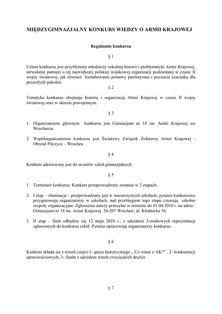 MIĘDZYGIMNAZJALNY KONKURS WIEDZY O ARMII KRAJOWEJ Regulamin konkursu §1 Celem konkursu jest przybliżenie młodzieży szkolnej historii i problematyki Armii Krajowej, utrwalanie pamięci o tej największej polskiej wojskowej organizacji podziemnej w czasie II wojny światowej, jak również kształtowanie postawy patriotyzmu i poczucia szacunku dla przeszłych pokoleń. §2 Tematyka konkursu obejmuje historię i organizację Armii Krajowej w czasie II wojny światowej oraz w okresie powojennym. §3 1. Organizatorem głównym Wrocławiu. konkursu jest Gimnazjum nr 18 im. Armii Krajowej we 2. Współorganizatorem konkursu jest Światowy Związek Żołnierzy Armii Krajowej Obwód Pilczyce – Wrocław. §4 Konkurs adresowany jest do uczniów szkół gimnazjalnych. §5 1. Terminarz konkursu: Konkurs przeprowadzony zostanie w 2 etapach. 2. I etap – eliminacje - przeprowadzany jest w macierzystych szkołach, pytania konkursowe przygotowują organizatorzy w szkołach, nad przebiegiem tego etapu czuwają szkolne zespoły organizacyjne. Zgłoszenia należy przesyłać w terminie do 01.04.2010 r. na adres : Gimnazjum nr 18 im. Armii Krajowej 54-207 Wrocław, ul. Kłodnicka 36. 3. II etap – finał odbędzie się 12 maja 2010 r., z udziałem 3-osobowych reprezentacji zgłoszonych do konkursu szkół. Pytania opracowują organizatorzy konkursu. §6 Konkurs składa się z trzech części:1- quizu historycznego ,, Co wiem o AK?” , 2- konkurencji sprawnościowych, 3- finału z udziałem trzech zwycięskich drużyn §7 1. W quizie historycznym ,,Co wiem o AK?” biorą udział 3-osobowe reprezentacje szkół. 2. Wszyscy uczestnicy przystępują do konkursu równocześnie zajmując miejsca przy stołach. 3. Każdy uczestnik otrzymuje 4 (te same) pytania z historii i organizacji AK. 4. Uczestnicy otrzymują pytania w formie pisemnej na arkuszu, na którym zapisują odpowiedzi samodzielnie, bez porozumiewania się z innymi uczestnikami konkursu. 5. Ocena odpowiedzi dokonywana jest wg skali 5-0: za najlepszą odpowiedź uczestnik otrzymuje 5 punktów , za najsłabszą 1 punkt, za brak odpowiedzi lub całkowicie błędną 0 punktów. 6. Suma otrzymanych punktów za odpowiedzi na wszystkie pytania decyduje o zajętym miejscu przez uczestnika w tej konkurencji: uczestnik, który otrzymał największą ilość punktów uzyskuje I miejsce – i tak kolejno aż do uczestnika, który otrzymał najmniejszą ilość punktów i zajmuje ostatnie miejsce. 7. W punktacji zespołowej liczą się wyniki wszystkich 3 zawodników z danej szkoły. 8. Quiz wygrywa szkoła, która w sumie otrzyma największą ilość punktów, a ostatnie szkoła z najmniejszą ilością punktów wszystkich 3 zawodników. §8 1. Lekturą podstawową w II etapie konkursu jest praca W.Frączkowskiego, Polskie Państwo Podziemne 1939 – 1945 (zarys organizacji), Gdańsk – Lublin 1991. 2. Praca ta jest dostępna w wersji elektronicznej dla uczestników konkursu i będzie przesłana do danej szkoły po wpłynięciu zgłoszenia udziału w konkursie. §9 1. Konkurencje sprawnościowe odbywają się na sali gimnastycznej ( uczniowie zabierają ze sobą stroje i obuwie sportowe). 2. Zespoły rywalizują ze sobą w następujących konkurencjach : - bieg z rannym na noszach na czas (za I m.-ce 10 punktów, II m.-ce 9 punktów, III m.-ce 8 punktów itd. aż do 10 miejsca), - zakładanie opatrunku rannemu ( 1-10 punktów za prawidłowo wykonany opatrunek w określonym czasie; biorą udział wszyscy zawodnicy), - rzut granatem do celu (do 10 punktów - po 1 rzucie każdy zawodnik plus dwa rzuty dodatkowe, czas 3 min., za każdy celny rzut 2 punkty). 3. Punkty zdobyte w konkurencjach sprawnościowych doliczane są do punktacji generalnej. § 10 1. Finał, do którego przystępują trzy zwycięskie drużyny, składa się ze sprawdzenia znajomości 3 zagadnień: a) Słynne akcje zbrojne AK (organizatorzy zaprezentują fragmenty filmów) b) Życiorysy przywódców AK (prezentacja życiorysu i portretu etapami) c) Ordery i odznaczenia związane z AK 2. Punkty zdobyte w etapie 1 i 2 zaliczane są w finale § 11 1. Na każdym etapie konkursu nad jego przebiegiem czuwa jury. 2. W I etapie – szkolne komisje konkursowe powoływane przez dyrektorów i złożone z nauczycieli danej szkoły. 3. W II etapie – Jury Międzygimnazjalnego Konkursu Wiedzy o Armii Krajowej złożone z członków Światowego Związku Żołnierzy Armii Krajowej. 4. Przed rozpoczęciem zmagań przewodniczący jury zapoznaje uczniów z regulaminem, a w szczególności ze sposobem odpowiedzi na pytania oraz podaje zasady oceny odpowiedzi (w konkurencjach sprawnościowych - czas i zasady przyznawania punktów). 5. Do zadań jury należy: zadawanie pytań, ustalanie kolejności osób, przyjmowanie i rozpatrywanie na miejscu protestów, ogłaszanie wyników. § 12 1. Po zakończeniu wszystkich części konkursu jury przyznaje uczestnikom nagrody. 2. Nagrodę główną – Puchar AK otrzymuje zespół, który w punktacji generalnej zajął I miejsce. 3. Wszyscy uczestnicy konkursu otrzymują dyplomy. Uczestnicy, którzy zajęli I, II i III miejsce w kategorii zespołowej lub indywidualnej otrzymują nagrody rzeczowe, a pozostali uczestnicy nagrody pocieszenia. 4. Nagrody w II etapie fundują organizatorzy konkursu. Dyrektor Gimnazjum nr18 mgr Anna Krupowicz Koordynator konkursu: Agnieszka Maziarska Gimnazjum nr 18 54-207 Wrocław 071/ 351-50-9