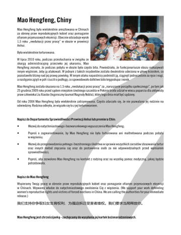Mao Hengfeng, Chiny Mao Hengfeng była wielokrotnie aresztowana w Chinach za obronę praw reprodukcyjnych kobiet oraz pomaganie ofiarom przymusowych eksmisji. Obecnie odsiaduje wyrok 1,5 roku „reedukacji przez pracę” w obozie w prowincji Anhui. Była wielokrotnie torturowana. W lipcu 2010 roku, podczas przesłuchania w związku ze skargą administracyjną przeciwko jej ukaraniu, Mao Hengfeng zeznała, że podczas pobytu w obozie była często bita. Powiedziała, że funkcjonariusze obozu rozkazywali innym więźniom, żeby ją atakowali. W jednym z takich incydentów została dwukrotnie uderzona w głowę krzesłem, co pozostawiło bliznę nad jej prawą powieką. W innym ataku napastnicy podnieśli ją, ciągnęli jednocześnie za ręce i nogi, a następnie zgięli w pół i rzucili o podłogę, co spowodowało dotkliwe bóle kręgosłupa i nerek. Mao Hengfeng została skazana na 1,5 roku „reedukacji przez pracę” za „naruszanie porządku społecznego”, po tym jak 25 grudnia 2009 roku przed sądem miejskim średniego szczebla w Pekinie brała udział w wiecu poparcia dla aktywisty praw człowieka Liu Xiaobo (tegoroczny laureat Nagrody Nobla), który tego dnia miał być sądzony. Od roku 2004 Mao Hengfeng była wielokrotnie zatrzymywana. Często zdarzało się, że nie pozwalano jej rodzinie na odwiedziny. Rodzina odkryła, że wiązało się to z jej torturowaniem. Napisz do Departamentu Sprawiedliwości Prowincji Anhui lub premiera Chin: • Wezwij do natychmiastowego i bezwarunkowego wypuszczenia Mao Hengfeng; • Poproś o zagwarantowanie, by Mao Hengfeng nie była torturowana ani maltretowana podczas pobytu w więzieniu; • Wezwij do przeprowadzenia pełnego i bezstronnego śledztwa w sprawie wszystkich zarzutów stosowania tortur oraz innych metod znęcania się oraz do postawienia osób za nie odpowiedzialnych przed wymiarem sprawiedliwości; • Poproś, aby zezwolono Mao Hengfeng na kontakt z rodziną oraz na wszelką pomoc medyczną, jakiej będzie potrzebowała. Napisz do Mao Hengfeng Wspieramy Twoją pracę w obronie praw reprodukcyjnych kobiet oraz pomaganie ofiarom przymusowych eksmisji w Chinach. Wzywamy władze do natychmiastowego zwolnienia Cię z więzienia. (We support your work defending women’s reproductive rights and victims of forced evictions in China. We are calling the authorities for your immediate release.) 我们支持你争取妇女生育权利,为强迫拆迁受害者维权。我们要求当局释放你。 Mao Hengfeng jest chrześcijanką - zachęcamy do wysyłania jej kartek bożonarodzeniowych. Dyrektor Departamentu Sprawiedliwości Prowincji Anhui Nagłówek: Szanowny Panie Dyrektorze Director of the Anhui Provincial Department of Justice SUN Jianxin Tingzhang Anhuisheng Sifating 335 Huaihelu Hefeishi 230061 Anhuisheng Chińska Republika Ludowa Premier Chińskiej Republiki Ludowej Nagłówek: Your Excellency/Wasza Ekscelencjo Prime Minister of the People's Republic of China WEN Jiabao Guojia Zongli The State Council General Office 2 Fuyoujie Xichengqu Beijingshi 100017 People's Republic of China Faks: +86 551 2215000 Email: [email protected] Można również wysłać apel za pośrednictwem Ambasady Chin w Warszawie Ambasada Chińskiej Republiki Ludowej w Polsce Mao Hengfeng ul. Bonifraterska 1 00-203 Warszawa Shanghai Shi Yangpu Qu Huangxing Lu 1 Hao 811 Shi Chińska Republika Ludowa 200090 Fax: (22) 635 42 11 http://pl.china-embassy.org/pol/ Maraton Pisania Listów Amnesty International 2010 Siódemka S.A. – oficjalny partner logistyczny XI Maratonu Pisania Listów Działaj na rzecz praw człowieka. Dołącz do nas i zostań członkinią/członkiem Amnesty International Polska www.amnesty.org.pl