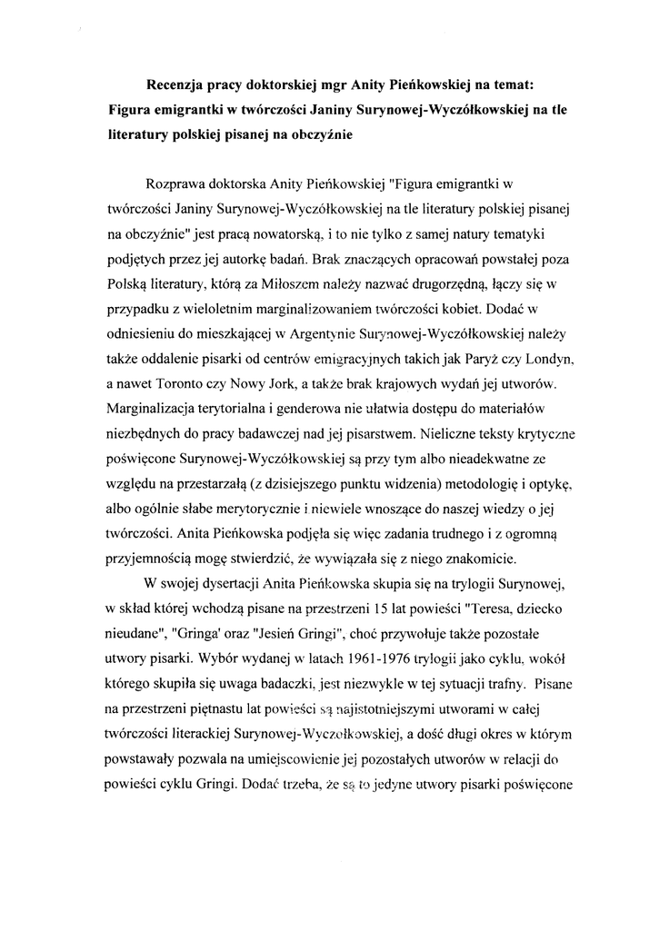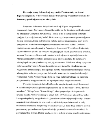 na temat: Recenzjapracy doktorskiej mgr Anity Pierflkowskiej na tle Figura emigrantki w tw6rczoSciJaniny Surynowej-Wycz6lkowskiej literatury polskiejpisanejna ohcryfnie RozprawadoktorskaAnity Pierikowskiej"Figuraemigrantkiw na tle literaturypolskiejpisanej tw6rczoSciJaninySurynowej-Wycz6lkowskiej jest pracqnowatorsk4. na obczyLnie" i to nie tylko z samejnaturytematyki podjgtychprzezjej autorkgbadah.Brak znaczqcychopracowaripowstalejpoza Polsk4literatury,kt6r4 zaMilosz.emnale\tnazwa(drugorzgdnq,l4cry sig w przypadkuz wieloletnimmarginalizowaniem twdrrczolcikobiet.Doda6w -Wycz6lkowsk odniesieniudo mieszkajqcejrv Argenhnie Surynowej iej naleZy tak2eoddaleniepisarkiod centr6wemigracy3nych takichjak ParyZczy Londyn, a nawetTorontoczy Nowy Jork,a takaebrakkrajolvychwydarijej utwor6w. i genderorva Marginalizacjaterytorialna nie ulatwiadostgpudo material6w do pracybadawczejnadjej pisarstwem. niezbgdnych Nielicznetekstykry.tyczne poSwigconeSurynowej-Wy czllkorvskiej s4przrytym albonieadekwatne ze (z dzisiejszego wzglgduna przestarzal4 punktuwidzenia)metodologigi optykg, alboog6lnieslabemery4orycznie i niewielewnosz4ce do naszejwiedzyo jej Anita Piefkou'skapodjglasigwigc zadaniatrudnego fw6rczoSci. i z ogromnq przyjemno6ci4 moggstwierdzii,2e wywi4zalasiEz niegoznakomicie . W swojejdysertacjiAnita Pierikowska skupiasigna trylogii Surynowej, w skladkt6rejwchodzqpisanena przes[rzeni15 lat powieSci"Teresa,dziecko nieudane","Gringa'oraz"JesiefGringi", cho(,przyrvotuje takZepozostale utworypisarki.Wyb6rwydaneju'latach 1961-1976 trylogiijako cyklu.wokol kt6regoskupilasiguwagabadaczki,.iest niezrvyklew tej sl.tuacjitrafny. Pisane pigtnastulat powiefci s4najistotniejszymi na przestrzeni utworamiw calej tw6rczoSciliterackiejSurynou,e.;-S/yczolkcrvskiej, a doSidtugiokresw ktorym jej pozostatych powstawalyporwalana umieiscorvienie utwor6ww relacjido powieScicyklu Gringi.Dodaf trzeha,2es4 t.cjedyneutq/orypisarkipoSwigcone powojennejemigrantkiprzemierzaj4cej emigracji,opisuj4cesytuacjE Europgi buduj4cejswojedorosleiryciew Argentyrlle.Pod4zanie za kolejnymitomami cyklu ulatwia takzeprzyjgcieperspektywyliteraturoznawczej, co - przy wszystkichzwiqzanych z tym ograniczeniach do kt6rychodnoszgsigp6zniejjasno iwyralnie wydajesigwsp6lgra(,zzalo\onymcelembadawczym w tytulepracy. sformulowanym Z uznaniemnale?y tu podkreSli6ogrompracyarchiwalneji bibliograficznejjak4 wykonalaAnita Pierikowska. Uwagii uzupelnienia, kt6re sugerujgponizej,nie ujmujqwartoicipracywlozonejw celudotarciado material6warchiwalnych, rgkopis6w,maszynopis6w i (czgstounikalnych) wydariutwor6wpowstalychna emigracji.Ptazjeszczekoniecznejest - Wycz6lkowskiejod gl6wnychoSrodk6w podkreS Ienie,2e oddalen ie Surynowej Polinijnychnie bylo w tym zadaniupomocne.PodobnieteLbrakprac jej tw6rczo56nie ponvolil na pominigcialub krytycznychomawiaj4cych juZ wczeSniej dyskursywne ujgciaw dysertacjiaspekt6w opracowanych stawiaj4cprzedQeszcze) mgr Pierikowsk4wyzwaniaczgstoprzekraczajqce wymagania rozprawydoktorskiej.Poradzilasobiez nimi znakomicie prezentuj4c opracowanie oryginalne,wyczerpuj4ce i osadzone wyrafunie w podejSciachmetodologicznych po'mv alaj4cychna wszechstronne omowienie jakie wobec materiafuliterackiego,atakhesprawngargumentacjg stanowiska, tw6rczoSciSurynowejzajmujePierikowska. Dodajmy,Zeprzywoluj4ckategorie z katalogupojEi knytyki feministycznejbadaczkanie zamk.ngla sig w granicach jednegopunhu widzeniai nie pominglaczEstodoSitradycyjnychpodejS6 kytycznych dominujqcychw krggachemigracyjnych,atakle odno5nychuwag literaturoznawc6w krajowych.Szczeg6lnie pierwsza ciekawesQw tym aspekcie i drugaczg36, pracy,w kt6rychom6wionei sformulowane s4podstawowe kategorieopisuw ich spolecznych i krytycznoliterackich kontekstach. Pierikowska sprawnieporuszasigpo zagadnieniach i pojgciachwsp6lczesnych badahliteraturoznawczych a jej pracademonstruj e tak2ewyralne otwarcie 3 jak np ekokrytyka,i ich inteligentne badaczkina nowepodejScia, w odniesieniu umiejscowienie do dominuj4cych dyskurs6wpolskiego literaturoznawstwa. Ciekawaprezentacja sylwetkiSurynowejjako pisarki- emigratkiujawia relacje pisarzy,redaktor6w(i animatorow 2yciakulturalnego skomplikowane Srodowisk)i wydawc6w,a takle nielatwewarunki emigracyjnych psychologiczne i finansowe,w jakich tworzylypowojenneemigrantki.Material we wstgpnejczgScipracywnosiwielenowegodo zastanejna zaprezentowany przepracowanie i prezentacjg ten tematwiedzyi a2prosisigo rozszerzenie, przy uty ciu naruEdziantropolo gicznych lub kultur oznawczych.Autorkapracy skupiasigjednakna tropachliteraturoznawczych zajmuj4csigprzede wszystkimfi gur4emigrantki,niestetypozostawi ajqcmakomitymaterial badawcrypozasfer4swoichzainteresowari. Jestto o tyle istotne,2e nawet skr6towepodjgciefych w4tk6wpozwolilobyna integracjQz wywodemgl6wnej pracyciekawychobserwacjizawafich w koricowejczgSci,kt6rew czESci obecnymksztalciestanowiqzbior"temat6wmozliwych"jedyniezarysowanych w rozdzialachobjgtychwsp6lnymtytulem"Kult odmiennoSci" w czgSciIV ZnakomitaorientacjaAnity Pierikowskiej manuskryptu. w kontekstach ci Surynowej-Wycz6lkowskieja tak2ew zagdni eniachrw i4zanych z fw6rczoS emigracyjnym pi sarsfwemk obi et pomvalana nadziejE,2ej ej dysertacja doktorskazostanierezszerzona i kulturozr,awcze o obserwacjeantropologiczne w procesieprzygotowywania wersji ksi4zkowej. jak juz wspomnialam, Analimj4cfigurgemigrantkiAnita Pierikowska, odnosisigdo r6znorodnych wzorc6wkrytycznych,omawiaj46zar6wno pojgciowo66 tradycyjnieusytuowan4 wywodzqc1sigz narodowych emigracyjn4 jak i wybranekategoriefeministyczne, patriarchalnego, wartoScispoleczeristwa a takle dobrzej u2 ugruntowanekategorie Iiteraturozn awczeporw alaj4ce na kategoryzacjetekst6wliterackich.Zjednej stronytrzebazauwtzyc,2e dziqki takiemupodejSciubadaczkaSmialol4czyze sob4kategoriewypracowanew 4 polskim dyskursie Iiteraturozn awczym z femini stycznypojgciowo5ci 4 francusko-i angielskojgzycznqpokazujqcIiteraturgw j ej narodowych kontekstach kryy cznoIiterackich, z drugiej j ednakmozna zarntci6 autorce pracyarbitralno56 w 