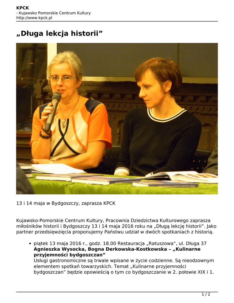 KPCK - Kujawsko Pomorskie Centrum Kultury http://www.kpck.pl „Długa lekcja historii” 13 i 14 maja w Bydgoszczy, zaprasza KPCK Kujawsko-Pomorskie Centrum Kultury, Pracownia Dziedzictwa Kulturowego zaprasza miłośników historii i Bydgoszczy 13 i 14 maja 2016 roku na „Długą lekcję historii”. Jako partner przedsięwzięcia proponujemy Państwu udział w dwóch spotkaniach z historią. piątek 13 maja 2016 r., godz. 18.00 Restauracja „Ratuszowa”, ul. Długa 37 Agnieszka Wysocka, Bogna Derkowska-Kostkowska – „Kulinarne przyjemności bydgoszczan” Usługi gastronomiczne są trwale wpisane w życie codzienne. Są nieodzownym elementem spotkań towarzyskich. Temat „Kulinarne przyjemności bydgoszczan” będzie opowieścią o tym co bydgoszczanie w 2. połowie XIX i 1. 1/2 KPCK - Kujawsko Pomorskie Centrum Kultury http://www.kpck.pl połowie XX wieku jadali, dokąd zaglądali, aby pokrzepić się tanią strawą, a gdzie odbywały się wykwintne przyjęcia. Zapraszamy na „wycieczkę” w poszukiwaniu dawnego smaku naszego miasta. sobota 14 maja 2016 r., godz. 14.00 „Cafe Kino”, ul. Długa 32 Bogna Derkowska-Kostkowska – „Z dziejów kin bydgoskich” Prezentacja „Z dziejów kin bydgoskich” przywoła wspomnienia o początkach powstawania w Bydgoszczy pierwszych sal kinowych. Odpowie na pytania, gdzie znajdowały się kina i jakie posiadały nazwy. Przywoła drogę, jaką pokonały bydgoskie kina od pierwszego kinematografu do pierwszego multipleksu. 2/2 Powered by TCPDF (www.tcpdf.org)