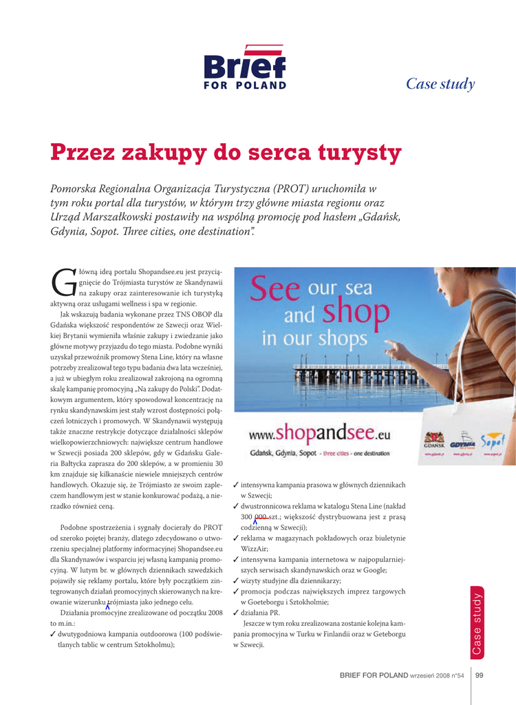 Case study Przez zakupy do serca turysty Pomorska Regionalna Organizacja Turystyczna (PROT) uruchomiła w tym roku portal dla turystów, w którym trzy główne miasta regionu oraz Urząd Marszałkowski postawiły na wspólną promocję pod hasłem „Gdańsk, Gdynia, Sopot. Three cities, one destination”. Podobne spostrzeżenia i sygnały docierały do PROT od szeroko pojętej branży, dlatego zdecydowano o utworzeniu specjalnej platformy informacyjnej Shopandsee.eu dla Skandynawów i wsparciu jej własną kampanią promocyjną. W lutym br. w głównych dziennikach szwedzkich pojawiły się reklamy portalu, które były początkiem zintegrowanych działań promocyjnych skierowanych na kreowanie wizerunku trójmiasta jako jednego celu. Działania promocyjne zrealizowane od początku 2008 to m.in.: 3dwutygodniowa kampania outdoorowa (100 podświetlanych tablic w centrum Sztokholmu); 3intensywna kampania prasowa w głównych dziennikach w Szwecji; 3dwustronnicowa reklama w katalogu Stena Line (nakład 300 000 szt.; większość dystrybuowana jest z prasą codzienną w Szwecji); 3reklama w magazynach pokładowych oraz biuletynie WizzAir; 3intensywna kampania internetowa w najpopularniejszych serwisach skandynawskich oraz w Google; 3wizyty studyjne dla dziennikarzy; 3promocja podczas największych imprez targowych w Goeteborgu i Sztokholmie; 3działania PR. Jeszcze w tym roku zrealizowana zostanie kolejna kampania promocyjna w Turku w Finlandii oraz w Geteborgu w Szwecji. brief for poland wrzesień 2008 n*54 C a se stu d y G łówną ideą portalu Shopandsee.eu jest przyciągnięcie do Trójmiasta turystów ze Skandynawii na zakupy oraz zainteresowanie ich turystyką aktywną oraz usługami wellness i spa w regionie. Jak wskazują badania wykonane przez TNS OBOP dla Gdańska większość respondentów ze Szwecji oraz Wielkiej Brytanii wymieniła właśnie zakupy i zwiedzanie jako główne motywy przyjazdu do tego miasta. Podobne wyniki uzyskał przewoźnik promowy Stena Line, który na własne potrzeby zrealizował tego typu badania dwa lata wcześniej, a już w ubiegłym roku zrealizował zakrojoną na ogromną skalę kampanię promocyjną „Na zakupy do Polski”. Dodatkowym argumentem, który spowodował koncentrację na rynku skandynawskim jest stały wzrost dostępności połączeń lotniczych i promowych. W Skandynawii występują także znaczne restrykcje dotyczące działalności sklepów wielkopowierzchniowych: największe centrum handlowe w Szwecji posiada 200 sklepów, gdy w Gdańsku Galeria Bałtycka zaprasza do 200 sklepów, a w promieniu 30 km znajduje się kilkanaście niewiele mniejszych centrów handlowych. Okazuje się, że Trójmiasto ze swoim zapleczem handlowym jest w stanie konkurować podażą, a nierzadko również ceną. 99 Case study Portal Shopandsee.eu to innowacyjne połączenie różnych grup interesów dla wspólnej korzyści – wzrostu zainteresowania i odwiedzin turystów z zagranicy. Idea ta pozwoliła na wykreowanie platformy informacyjnej, gdzie potencjalny turysta w „kilka kliknięć” może zaplanować swój pobyt w Trójmieście. W serwisie zastosowano bardzo intuicyjne menu, jednak najważniejszym atutem strony pozostaje jej funkcjonalność. Bogata oferta handlowa Trójmiasta jest w znaczny sposób wyeksponowana: znajdziemy tu mapę centrów handlowych oraz szczegółowe opisy partnerskich obiektów – pewnych udogodnieniem dla szukających informacji jest szczegółowa lista sklepów z wyszukiwarką, w której możemy znaleźć sklep z danej branży, np. obuwniczej. Informacje, które turysta znajdzie na portalu pozwalają w 100 proc. na zaplanowanie podróży i zwiedzania. Do tego celu zaprojektowane zostało narzędzie „city guide”, gdzie każdą z wyszukanych informacji można dodać do „koszyka”, a następnie wydrukować bądź przesłać na adres e-mailowy. Dla wygodnych na portalu zamieszczone są gotowe pakiety usług. C as e st u dy Celem było stworzenie portalu uniwersalnego dla całego trójmiasta – turysta nocujący w Gdyni w ciągu dnia zwiedza Gdańsk, natomiast wieczorem bawi się w Sopocie. Jednak, projektując portal pod kątem turystów zagranicznych, wzięliśmy pod uwagę ich potrzeby i zainteresowania, dlatego w portalu znaleźć można oprócz standardowych informacji dotyczących bazy noclegowej, atrakcji czy muzeów, również namiary na usługi medyczne, odnowę biologiczną, turystykę aktywną. Dostępna jest wyszukiwarka połączeń lotniczych i promowych. W lipcu br. przeprowadzony został face-lifting serwisu oraz dodano szereg nowych funkcjonalności dla użytkowników. Jednocześnie wykonane zostały prace techniczne, które już dziś gwarantują portalowi wysokie miejsce w zagranicznych wyszukiwarkach. Dodatkowo portal pozycjonowany 100 brief for poland wrzesień 2008 n*54 jest intensywnie z uwzględnieniem typowych turystów, już nie tak bardzo skoncentrowanych na zakupach. Poza przedstawicielami samorządów w projekcie uczestniczyły także firmy komercyjne, m.in. Port Lotniczy im. Lecha Wałęsy w Gdańsku, Wizzair, Stena Line i Blekingeflyg. Intensywne działania promocyjne i efektywna współpraca z partnerami komercyjnymi przyczyniły się do ponad 150 000 odsłon serwisu od początku jego funkcjonowania, co można zdecydowanie nazwać sukcesem. Jednak zdecydowanie ważniejszym rezultatem jest wzrost świadomości celu, jakim jest Trójmiasto. To dzięki promocji portalu hasło „Gdańsk, Gdynia, Sopot. Three cities, one destination” pojawiło się we wszystkich przekazach promocyjnych. To główny cel projektu – pokazać wspólną ofertę Trójmiasta i zachęcić również do odwiedzenia regionu. Adam Skonieczny, kierownik działu analiz ekonomicznych i marketingu, Port Lotniczy Gdańsk Od czasu wprowadzenia kampanii Shopandsee.eu zaobserwowaliśmy wzrost zainteresowania potencjalnych pasażerów połączeniami objętymi działaniami promocyjnymi. Ścisła współpraca z liniami lotnic