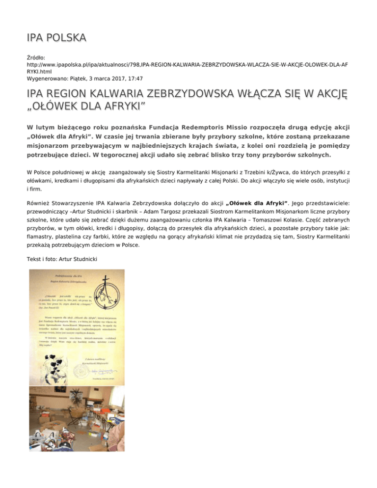 IPA POLSKA Źródło: http://www.ipapolska.pl/ipa/aktualnosci/798,IPA-REGION-KALWARIA-ZEBRZYDOWSKA-WLACZA-SIE-W-AKCJE-OLOWEK-DLA-AF RYKI.html Wygenerowano: Piątek, 3 marca 2017, 17:47 IPA REGION KALWARIA ZEBRZYDOWSKA WŁĄCZA SIĘ W AKCJĘ „OŁÓWEK DLA AFRYKI” W lutym bieżącego roku poznańska Fundacja Redemptoris Missio rozpoczęła drugą edycję akcji „Ołówek dla Afryki”. W czasie jej trwania zbierane były przybory szkolne, które zostaną przekazane misjonarzom przebywającym w najbiedniejszych krajach świata, z kolei oni rozdzielą je pomiędzy potrzebujące dzieci. W tegorocznej akcji udało się zebrać blisko trzy tony przyborów szkolnych. W Polsce południowej w akcję zaangażowały się Siostry Karmelitanki Misjonarki z Trzebini k/Żywca, do których przesyłki z ołówkami, kredkami i długopisami dla afrykańskich dzieci napływały z całej Polski. Do akcji włączyło się wiele osób, instytucji i firm. Również Stowarzyszenie IPA Kalwaria Zebrzydowska dołączyło do akcji „Ołówek dla Afryki”. Jego przedstawiciele: przewodniczący –Artur Studnicki i skarbnik – Adam Targosz przekazali Siostrom Karmelitankom Misjonarkom liczne przybory szkolne, które udało się zebrać dzięki dużemu zaangażowaniu członka IPA Kalwaria – Tomaszowi Kolasie. Część zebranych przyborów, w tym ołówki, kredki i długopisy, dołączą do przesyłek dla afrykańskich dzieci, a pozostałe przybory takie jak: flamastry, plastelina czy farbki, które ze względu na gorący afrykański klimat nie przydadzą się tam, Siostry Karmelitanki przekażą potrzebującym dzieciom w Polsce. Tekst i foto: Artur Studnicki Ocena: 0/5 (0) Tweetnij