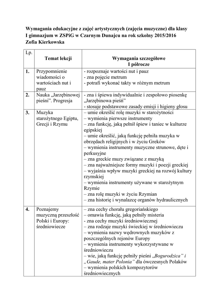 Wymagania edukacyjne z zajęć artystycznych (zajęcia muzyczne) dla klasy I gimnazjum w ZSPiG w Czarnym Dunajcu na rok szkolny 2015/2016 Zofia Kierkowska Lp. Temat lekcji 1. 2. 3. 4. Wymagania szczegółowe I półrocze - rozpoznaje wartości nut i pauz - zna pojęcie metrum - potrafi wykonać takty w różnym metrum Przypomnienie wiadomości o wartościach nut i pauz Nauka „Jarzębinowej - zna i śpiewa indywidualnie i zespołowo piosenkę pieśni”. Progresja „Jarzębinowa pieśń” - stosuje podstawowe zasady emisji i higieny głosu Muzyka – umie określić rolę muzyki w starożytności starożytnego Egiptu, – wymienia pierwsze instrumenty – zna funkcję, jaką pełnił śpiew i taniec w kulturze Grecji i Rzymu egipskiej – umie określić, jaką funkcję pełniła muzyka w obrzędach religijnych i w życiu Greków – wymienia instrumenty muzyczne strunowe, dęte i perkusyjne – zna greckie muzy związane z muzyką – zna najważniejsze formy muzyki i poezji greckiej – wyjaśnia wpływ muzyki greckiej na rozwój kultury rzymskiej – wymienia instrumenty używane w starożytnym Rzymie – zna rolę muzyki w życiu Rzymian – zna historię i wynalazcę organów hydraulicznych Poznajemy muzyczną przeszłość Polski i Europy: średniowiecze – zna cechy chorału gregoriańskiego – omawia funkcję, jaką pełniły misteria - zna cechy muzyki średniowiecznej – zna rodzaje muzyki świeckiej w średniowieczu – wymienia nazwy wędrownych muzyków z poszczególnych rejonów Europy – wymienia instrumenty wykorzystywane w średniowieczu – wie, jaką funkcję pełniły pieśni „Bogurodzica” i „Gaude, mater Polonia” dla ówczesnych Polaków – wymienia polskich kompozytorów średniowiecznych 5. Muzyka renesansu – potrafi omówić rozwój wielogłosowości, homofonię i polifonię – wymienia notację neumatyczną, – zna słynnych artystów renesansu – omawia rozwój muzyki renesansowej – wymienia formy muzyki wokalnej i instrumentalnej – zna instrumenty, jakich najczęściej używano w renesansie – wymienia renesansowych kompozytorów – wyjaśnia pojęcie tabulatury 6. 97- ma Rocznica Odzyskania Niepodległości: „Legiony”, „Idą leśni”- nauka piosenek Słuchamy nagrań muzyki renesansowej - zna i śpiewa indywidualnie i zespołowo piosenki „Legiony” oraz „Idą leśni” - stosuje podstawowe zasady emisji i higieny głosu 7. 89. Jan Sebastian Bach. Barok w muzyce 10. Fuga- forma polifoniczna 11. Antonio Vivalditwórca koncertu solowego 12. Analizujemy temat z Koncertu Skrzypcowego Edur „Wiosna” A. Vivaldiego – omawia rozwój muzyki renesansowej w Polsce – zna kompozytorów polskich tego okresu – omawia, jaką rolę pełnił dwór królewski w rozwoju kultury polskiej epoki renesansu – określa charakter słuchanego motetu G. P. da Palestriny „Stabat Mater” oraz wybranych psalmów M. Gomółki – zna formy wokalno-instrumentalne baroku – zna gatunki muzyki instrumentalnej baroku – zna twórczość J. S. Bacha – słucha i w sposób świadomy analizuje utwory Bacha – omawia rozwój muzyki polskiej w baroku – wymienia polskich kompozytorów barokowych - zna formę fugi - słucha i w sposób świadomy analizuje przebieg głosów w „Toccacie i fudze d- moll” J. S. Bacha - zna twórczość A. Vivaldiego - słucha i w sposób świadomy analizuje utwory Vivaldiego - zna formę koncertu solowego – śpiewa nazwami solmizacyjnymi według zapisu nutowego 13. Arcangelo Corelli i concerto grosso - zna twórczość A. Corellego - słucha i w sposób świadomy analizuje utwory Corellego - zna formę concerto grosso – omawia różnorodność polskiej muzyki ludowej 14. Polska muzyka ludowa w nagraniach – wyjaśnia pojęcie muzyka folkowa Zespołu Pieśni i - słucha i w sposób świadomy analizuje utwory Tańca „Mazowsze” zespołu „Mazowsze” - zna i śpiewa indywidualnie i zespołowo piosenkę 15. Nauka piosenki pt. „Ej, przeleciał „Ej, przeleciał ptaszek” ptaszek” - stosuje podstawowe zasady emisji i higieny głosu - zna i śpiewa indywidualnie i zespołowo wybrane 16. Muzyczne kolędowanie po kolędy góralskie góralsku - stosuje podstawowe zasady emisji i higieny głosu
