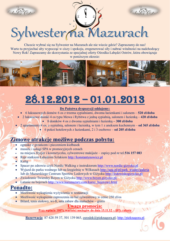 Chcecie wybrać się na Sylwester na Mazurach ale nie wiecie gdzie? Zapraszamy do nas! Warto tu przyjechać aby wypocząć w ciszy i spokoju, zregenerować siły i nabrać witalności na nadchodzący Nowy Rok! Zapraszamy do skorzystania ze specjalnej oferty Ośrodka Łabędzi Ostrów, która obowiązuje w poniższym okresie: 28.12.2012 – 01.01.2013 Do Państwa dyspozycji oddajemy: 6 luksusowych domów 6 os z trzema sypialniami, dwoma łazienkami i salonem – 520 zł/doba 2 luksusowe domki 4 os typu Mewa i Rybitwa z jedną sypialnią, salonem i łazienką – 420 zł/doba 8 domków 4 os z dwoma sypialniami i łazienką – 300 zł/doba 2 apartamenty 4 os, z sypialnią, salonem i łazienką, w tym 1 z aneksem kuchennym – od 365 zł/doba 6 pokoi hotelowych z łazienkami, 2 i 3 osobowe – od 205 zł/doba Zimowe atrakcje możliwe podczas pobytu: ognisko z grzańcem i pieczeniem kiełbasek masaże i usługi SPA w promocyjnych cenach na miejscu fryzjer i kosmetyczka, sylwestrowe makijaże – zapisy pod nr tel.516 157 083 Rejs statkiem Łabędzim Szlakiem http://konstantynowicz.pl Kulig Spacer po zdrowie czyli Nordic Walking z instruktorem http://www.nordic-gizycko.pl Wyjazd do parku wodnego lub na kręgielnię w Wilkasach http://ugg.pl/pl/park_wodny/galeria lub do Mazurskiego Centrum Sportów Lodowych w Giżycku http://lodowiskogizycko.pl/ Zwiedzanie Twierdzy Boyen w Giżycku http://www.boyen.gizycko.pl/ Latanie na bojerach http://www.kursmazury.com/kursy_bojerowe.html Ponadto: Możliwość wykupienia wyżywienia w restauracji Możliwość wykupienia zaproszenia na bal sylwestrowy w cenie 250 zł/os Bilard, tenis stołowy, wi-fi, sala zabaw dla maluchów – gratis Uwaga promocja: Przy wpłacie 100% wartości noclegów do dnia 15.11.12 – 10% rabatu Rezerwacja 87 428 59 37, 501 139 065, [email protected]; http://pieknagora.pl