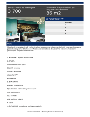 MIESZKANIE na WYNAJEM 3 700 Warszawa, Praga-Południe, gen. Augusta Emila Fieldorfa 86 m2 6175/2095/OMW Secondary 2 5 5 3 Opis Mieszkanie to składa się z 2 sypialni, salonu połączonego z kuchnią, łazienki, holu, pomieszczenia gospodarczego oraz 2 balkonów. Mieszkanie rozkładowe, dwustronne, z dwoma miejscami garażowymi. W pełni umeblowane: 1. KUCHNIA – w pełni wyposażona 2. SALON: a) rozkładana sofa typu L b) stolik kawowy c) stół + 4 krzesła d) szafka RTV e) telewizor 3. SYPIALNIA 1 a) łóżko "małżeńskie" b) duża szafa z drzwiami przesuwnymi c) 2 szafki nocne d) 2 komody e) 2 szafki na książki f) lustro 4. SYPIALNIA 2 (urządzona pod kątem dzieci): Kancelaria GOLDHAUS & Partnerzy Marco von der Vanbrugh a) szafa b) łóżko dziecięce c) półka na książki 5. ŁAZIENKA – w pełni wyposażona 6. POMIESZCZENIE GOSPODARCZE z pralką Do mieszkania przynależą 2 miejsce parkingowe w garażu podziemnym. Do największych atutów tej nieruchomości należy jej lokalizacja! W bloku (na parterze) mieszczą się m.in: apteka, piekarnia, Tesco, bank, poczta, kwiaciarnia, etc. Po drugiej stronie ulicy znajduje się LIDL, BIEDRONKA oraz Stacja STATOIL (24H). 10 min spacerem znajduje się PARK BALATON nad jeziorkiem. W najbliższej okolicy znajdują się liczne środki komunikacji miejskiej (autobusy), co pozwala na szybki dojazd do centrum. 105/ Władysław Kriuk tel. +48/535-896-749 email: [email protected] Kancelaria GOLDHAUS & Partnerzy Marco von der Vanbrugh Powered by TCPDF (www.tcpdf.org)