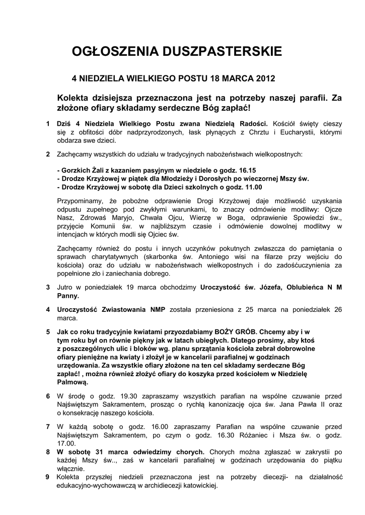 OGŁOSZENIA DUSZPASTERSKIE 4 NIEDZIELA WIELKIEGO POSTU 18 MARCA 2012 Kolekta dzisiejsza przeznaczona jest na potrzeby naszej parafii. Za złożone ofiary składamy serdeczne Bóg zapłać! 1 Dziś 4 Niedziela Wielkiego Postu zwana Niedzielą Radości. Kościół święty cieszy się z obfitości dóbr nadprzyrodzonych, łask płynących z Chrztu i Eucharystii, którymi obdarza swe dzieci. 2 Zachęcamy wszystkich do udziału w tradycyjnych nabożeństwach wielkopostnych: - Gorzkich Żali z kazaniem pasyjnym w niedziele o godz. 16.15 - Drodze Krzyżowej w piątek dla Młodzieży i Dorosłych po wieczornej Mszy św. - Drodze Krzyżowej w sobotę dla Dzieci szkolnych o godz. 11.00 Przypominamy, że pobożne odprawienie Drogi Krzyżowej daje możliwość uzyskania odpustu zupełnego pod zwykłymi warunkami, to znaczy odmówienie modlitwy: Ojcze Nasz, Zdrowaś Maryjo, Chwała Ojcu, Wierzę w Boga, odprawienie Spowiedzi św., przyjęcie Komunii św. w najbliższym czasie i odmówienie dowolnej modlitwy w intencjach w których modli się Ojciec św. Zachęcamy również do postu i innych uczynków pokutnych zwłaszcza do pamiętania o sprawach charytatywnych (skarbonka św. Antoniego wisi na filarze przy wejściu do kościoła) oraz do udziału w nabożeństwach wielkopostnych i do zadośćuczynienia za popełnione zło i zaniechania dobrego. 3 Jutro w poniedziałek 19 marca obchodzimy Uroczystość św. Józefa, Oblubieńca N M Panny. 4 Uroczystość Zwiastowania NMP została przeniesiona z 25 marca na poniedziałek 26 marca. 5 Jak co roku tradycyjnie kwiatami przyozdabiamy BOŻY GRÓB. Chcemy aby i w tym roku był on równie piękny jak w latach ubiegłych. Dlatego prosimy, aby ktoś z poszczególnych ulic i bloków wg. planu sprzątania kościoła zebrał dobrowolne ofiary pieniężne na kwiaty i złożył je w kancelarii parafialnej w godzinach urzędowania. Za wszystkie ofiary złożone na ten cel składamy serdeczne Bóg zapłać! , można również złożyć ofiary do koszyka przed kościołem w Niedzielę Palmową. 6 W środę o godz. 19.30 zapraszamy wszystkich parafian na wspólne czuwanie przed Najświętszym Sakramentem, prosząc o rychłą kanonizację ojca św. Jana Pawła II oraz o konsekrację naszego kościoła. W każdą sobotę o godz. 16.00 zapraszamy Parafian na wspólne czuwanie przed Najświętszym Sakramentem, po czym o godz. 16.30 Różaniec i Msza św. o godz. 17.00. 8 W sobotę 31 marca odwiedzimy chorych. Chorych można zgłaszać w zakrystii po każdej Mszy św.., zaś w kancelarii parafialnej w godzinach urzędowania do piątku włącznie. 9 Kolekta przyszłej niedzieli przeznaczona jest na potrzeby diecezji- na działalność edukacyjno-wychowawczą w archidiecezji katowickiej. 7 10 Paschaliki Wielkanocnego Dzieła Pomocy są do nabycia w kancelarii parafialnej w cenie 6,- zł . Ofiary za paschaliki są przeznaczone dla Caritas Archidiecezji Katowickiej. Prosi się też o przeznaczenie 1% odpisu podatkowego na cele charytatywne Caritas. Na stoliku przy św. Antonim możecie znaleźć numer Fundacji Caritas Katowice. 11 Przypominamy o przedłużeniu miejsca cmentarnego po 20 latach. 12 Kolekta kopertowa z ubiegłej niedzieli wyniosła 500,-zł. Za złożone ofiary składamy serdeczne Bóg zapłać!. 13 Aby zadbać o czystość w naszej świątyni i poczucie odpowiedzialności za nią zapraszamy do sprzątania kościoła w poniedziałek 19.III.2012 i w sobotę 24.III.2012 o godz. 10.00 mieszkańców z Osiedla Orłowiec 59 i 60. Bóg zapłać za tę służbę 14 Wielkopostny Dzień Skupienia dla członków Zespołów Charytatywnych Dekanatu Pszów, odbędzie się w Krzyżkowicach w piątek, 30 marca br. o godz. 16.00. W programie konferencja w Domu Katechetycznym, a potem udział w Nabożeństwie Drogi Krzyżowej o godz. 17.00. 15 Wielkopostny Dzień Skupienia dla Nauczycieli Dekanatu Pszów odbędzie się w kościele NMP Królowej Polski w Czernicy w sobotę, 31 marca br. o godz 14.00. 16 Centrum Formacji Maryjnej w Licheniu zaprasza na rekolekcje maryjne. Szczegóły można poznać na stronie www.maryja.pl lub pod adresem e-mail: [email protected] Zainteresowani mogą też zaczerpnąć wiadomości z folderu „Z Maryją we wspólnocie Kościoła", który znajduje się na stoliku pod figurą św. Antoniego. 17 Stowarzyszenie MOJE MIASTO organizuje darmowy kurs komputerowy w ramach projektu „Kulturalne poszukiwanie z myszk@". Wszystkie szczegóły na tablicy ogłoszeń na rogu placu, w metalowej gablotce oraz w aktualnościach parafialnych.