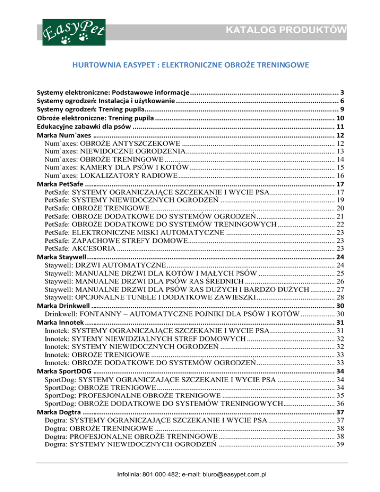 KATALOG PRODUKTÓW HURTOWNIA EASYPET : ELEKTRONICZNE OBROŻE TRENINGOWE Systemy elektroniczne: Podstawowe informacje ........................................................................ 3 Systemy ogrodzeń: Instalacja i użytkowanie ............................................................................... 6 Systemy ogrodzeń: Trening pupila.............................................................................................. 9 Obroże elektroniczne: Trening pupila ....................................................................................... 10 Edukacyjne zabawki dla psów .................................................................................................. 11 Marka Num`axes ..................................................................................................................... 12 Num`axes: OBROŻE ANTYSZCZEKOWE ................................................................................ 12 Num`axes: NIEWIDOCZNE OGRODZENIA.............................................................................. 13 Num`axes: OBROŻE TRENINGOWE ......................................................................................... 14 Num`axes: KAMERY DLA PSÓW I KOTÓW ............................................................................ 15 Num`axes: LOKALIZATORY RADIOWE.................................................................................. 16 Marka PetSafe ......................................................................................................................... 17 PetSafe: SYSTEMY OGRANICZAJĄCE SZCZEKANIE I WYCIE PSA.................................. 17 PetSafe: SYSTEMY NIEWIDOCZNYCH OGRODZEŃ ............................................................ 19 PetSafe: OBROŻE TRENIGOWE ................................................................................................ 20 PetSafe: OBROŻE DODATKOWE DO SYSTEMÓW OGRODZEŃ......................................... 21 PetSafe: OBROŻE DODATKOWE DO SYSTEMÓW TRENINGOWYCH .............................. 22 PetSafe: ELEKTRONICZNE MISKI AUTOMATYCZNE ......................................................... 23 PetSafe: ZAPACHOWE STREFY DOMOWE............................................................................. 23 PetSafe: AKCESORIA .................................................................................................................. 23 Marka Staywell........................................................................................................................ 24 Staywell: DRZWI AUTOMATYCZNE........................................................................................ 24 Staywell: MANUALNE DRZWI DLA KOTÓW I MAŁYCH PSÓW ........................................ 25 Staywell: MANUALNE DRZWI DLA PSÓW RAS ŚREDNICH ............................................... 26 Staywell: MANUALNE DRZWI DLA PSÓW RAS DUŻYCH I BARDZO DUŻYCH ............. 27 Staywell: OPCJONALNE TUNELE I DODATKOWE ZAWIESZKI......................................... 28 Marka Drinkwell ...................................................................................................................... 30 Drinkwell: FONTANNY – AUTOMATYCZNE POJNIKI DLA PSÓW I KOTÓW .................. 30 Marka Innotek ......................................................................................................................... 31 Innotek: SYSTEMY OGRANICZAJĄCE SZCZEKANIE I WYCIE PSA.................................. 31 Innotek: SYTEMY NIEWIDZIALNYCH STREF DOMOWYCH .............................................. 32 Innotek: SYSTEMY NIEWIDOCZNYCH OGRODZEŃ ............................................................ 32 Innotek: OBROŻE TRENIGOWE ................................................................................................ 33 Innotek: OBROŻE DODATKOWE DO SYSTEMÓW OGRODZEŃ......................................... 33 Marka SportDOG ..................................................................................................................... 34 SportDog: SYSTEMY OGRANICZAJĄCE SZCZEKANIE I WYCIE PSA .............................. 34 SportDog: OBROŻE TRENIGOWE............................................................................................. 34 SportDog: PROFESJONALNE OBROŻE TRENIGOWE ........................................................... 35 SportDog: OBROŻE DODATKOWE DO SYSTEMÓW TRENINGOWYCH........................... 36 Marka Dogtra .......................................................................................................................... 37 Dogtra: SYSTEMY OGRANICZAJĄCE SZCZEKANIE I WYCIE PSA................................... 37 Dogtra: OBROŻE TRENINGOWE .............................................................................................. 38 Dogtra: PROFESJONALNE OBROŻE TRENINGOWE............................................................. 38 Dogtra: SYSTEMY NIEWIDOCZNYCH OGRODZEŃ ............................................................. 39 Infolinia: 801 000 482; e-mail: [email protected] KATALOG PRODUKTÓW Dogtra: OBROŻE DODATKOWE DO SYSTEMÓW OGRODZEŃ .......................................... 40 Dogtra: OBROŻE DODATKOWE DO SYSTEMÓW TRENINGOWYCH ............................... 40 Marka PAC............................................................................................................................... 41 PAC: SYSTEMY NIEWIDOCZNYCH OGRODZEŃ................................................................. 41 PAC: OBROŻE TRENIGOWE..................................................................................................... 41 PAC: OBROŻE DODATKOWE DO SYSTEMÓW TRENINGOWYCH................................... 42 Marka Multivet........................................................................................................................ 43 Multivet: OBROŻE TRENINGOWE.......................................................................................
