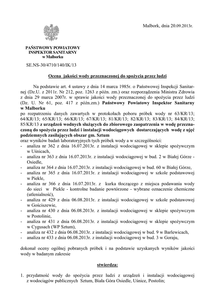 Malbork, dnia 20.09.2013r. PAŃSTWOWY POWIATOWY INSPEKTOR SANITARNY w Malborku SE.NS-30/4710/140/IK/13 Ocena jakości wody przeznaczonej do spożycia przez ludzi Na podstawie art. 4 ustawy z dnia 14 marca 1985r. o Państwowej Inspekcji Sanitarnej (Dz.U. z 2011r. Nr 212, poz. 1263 z późn. zm.) oraz rozporządzenia Ministra Zdrowia z dnia 29 marca 2007r. w sprawie jakości wody przeznaczonej do spożycia przez ludzi (Dz. U. Nr 61, poz. 417 z późn.zm.) Państwowy Powiatowy Inspektor Sanitarny w Malborku po rozpatrzeniu danych zawartych w protokołach poboru próbek wody nr 63/KR/13; 64/KR/13; 65/KR/13; 66/KR/13; 67/KR/13; 81/KR/13; 82/KR/13; 83/KR/13; 84/KR/13; 85/KR/13 z urządzeń wodnych służących do zbiorowego zaopatrzenia w wodę przeznaczoną do spożycia przez ludzi i instalacji wodociągowych dostarczających wodę z ujęć podziemnych zasilających obszar gm. Sztum oraz wyników badań laboratoryjnych tych próbek wody a w szczególności: - analiza nr 362 z dnia 16.07.2013r. z instalacji wodociągowej w sklepie spożywczym w Uśnicach, - analiza nr 363 z dnia 16.07.2013r. z instalacji wodociągowej w bud. 2 w Białej Górze Osiedle, - analiza nr 364 z dnia 16.07.2013r. z instalacji wodociągowej w bud. 60 w Białej Górze, - analiza nr 365 z dnia 16.07.2013r. z instalacji wodociągowej w szkole podstawowej w Piekle, - analiza nr 366 z dnia 16.07.2013r. z kurka tłoczącego z miejsca podawania wody do sieci w Piekle - kontrolne badanie powtórzone - wybrane oznaczenie chemiczne (utlenialność), - analiza nr 429 z dnia 06.08.2013r. z instalacji wodociągowej w szkole podstawowej w Gościszewie, - analiza nr 430 z dnia 06.08.2013r. z instalacji wodociągowej w sklepie spożywczym w Postolinie, - analiza nr 431 z dnia 06.08.2013r. z instalacji wodociągowej w sklepie spożywczym w Cygusach (WP Sztum), - analiza nr 432 z dnia 06.08.2013r. z instalacji wodociągowej w bud. 9 w Barlewicach, - analiza nr 433 z dnia 06.08.2013r. z instalacji wodociągowej w bud. 3 w Goraju, dokonał oceny ogólnej pobranych próbek i na podstawie uzyskanych wyników jakości wody w badanym zakresie stwierdza: 1. przydatność wody do spożycia przez ludzi z urządzeń i instalacji wodociągowej z wodociągów publicznych Sztum, Biała Góra Osiedle, Uśnice, Postolin; 2. warunkową przydatność wody do spożycia przez ludzi z urządzeń i instalacji wodociągowej z wodociągów publicznych Barlewice, Piekło oraz Goraj; 3. warunkową przydatność wody do spożycia przez ludzi, na warunkach przyznanego odstępstwa z wodociągu publicznego Biała Góra; 4. zgodność charakterystyki metod badawczych zastosowanych w omawianych wyżej badaniach laboratoryjnych z wymaganiami określonymi w rozporządzeniu Ministra Zdrowia z dnia 29 marca 2007r. w sprawie jakości wody przeznaczonej do spożycia przez ludzi (Dz. U. Nr 61, poz. 417 z późn.zm.). Uzasadnienie: Państwowy Powiatowy Inspektor Sanitarny w Malborku w oparciu o podjęte i przedstawione czynności związane z nadzorem sanitarnym nad jakością wody stwierdza co następuje: w ramach bieżącego nadzoru sanitarnego Państwowy Powiatowy Inspektor Sanitarny w Malborku przeprowadził badania laboratoryjne wody pod względem bakteriologicznym i fizykochemicznym z urządzeń służących do zbiorowego zaopatrzenia w wodę przeznaczoną do spożycia przez ludzi i instalacji wodociągowych dostarczających wodę, które wykazały niezgodność z wymogami rozporządzenia Ministra Zdrowia z dnia 29 marca 2007r. w sprawie jakości wody przeznaczonej do spożycia przez ludzi (Dz. U. Nr 61, poz. 417 z późn.zm.)tj.: − analiza nr 363 z instalacji wodociągowej w bud. 2 w Białej Górze Osiedle (ponadnormatywna mętność - 22 NTU oraz zawartość liczby bakterii gr. coli - 4jtk/100ml i jonu amonowego - 1,62 mg/dm 3 ), − analiza nr 364 z instalacji wodociągowej w bud. 60 w Białej Górze (ponadnormatywna barwa - 30 NTU oraz zawartość liczby bakterii gr. coli - 1jtk/100ml ), − analiza nr 433 z instalacji wodociągowej w bud. 3 w Goraju (ponadnormatywna zawartość liczby bakterii gr. coli - 2jtk/100ml ). Przedsiębiorstwo Wodociągów i Kanalizacji sp. z o.o. w Sztumie, w ramach kontroli wewnętrznej przeprowadziło badania próbek wody z w/w ujęć. Jakość wody analizowanych próbek odpowiada wymaganiom sanitarnym określonym w rozporządzeniu Ministra Zdrowia z dnia 29 marca 2007r. w sprawie wymagań dotyczących jakości wody przeznaczonej do spożycia przez ludzi (Dz. U. Nr 61, poz. 417 z późn. zm.). Najbardziej doskonała woda do picia nie powinna mieć żadnej barwy. Barwa wody do picia jest zwykle następstwem obecności barwnej substancji organicznej (w pierwszej kolejności kwasów humusowych i fulwowych) związanej z humusową frakcją gleby. Na barwę wody silnie także wpływa obecność żelaza i innych metali, zarówno w postaci naturalnych zanieczyszczeń, jak i produktów korozji. Może być również spowodowana skażeniem źródła wody ściekami przemysłowymi i być pierwszym ostrzeżeniem przed niebezpieczną sytuacją. Należy podjąć dochodzenie celem ustalenia przyczyn barwy dostarczanej wody, zwłaszcza kiedy zmiana barwy jest znaczna. Dnia 09.09.2010r. Państwowy Powiatowy Inspektor Sanitarny w Malborku wydał decyzję administracyjną wyrażającą zgodę na odstępstwo w sprawie jakości wody produkowanej przez wodociąg publiczny Biała Góra – ponadnormatywna zawartość fluoru oraz decyzję o warunkowej przydatności wody do spożycia w odniesieniu do barwy, utlenialności i sodu w terminie do dnia 30.09.2013r. Państwowy Powiatowy Inspektor Sanitarny w Malborku w dniu 25.04.2012r. wydał decyzję administracyjną w sprawie poprawy jakości wody produkowanej przez WP Piekło w terminie do dnia 30.06.2014r. Państwowy Powiatowy Inspektor Sanitarny w Malborku w dniu 20.05.2013r. wydał decyzję administracyjną w sprawie poprawy jakości wody produkowanej przez WP Goraj w terminie do dnia 30.10.2013 r. Państwowy 