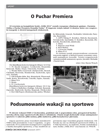 SPORT O Puchar Premiera 10 wrzeÊnia na kompleksie boisk „Orlik 2012” zosta∏y rozegrane eliminacje gminne „Turnieju Orlika o Puchar Premiera Donalda Tuska”. W imprezie wzi´∏o udzia∏ 14 dru˝yn, które swe rozgrywki rozegra∏y w dwóch kategoriach wiekowych. ki, Rybczyƒski, Graczyk, Niedzia∏ek, Sobolewski, Patrycka, Kaczyƒski) 3. ASPN Viking (V. Kotsikos, Ma∏ecki, Kaczmarek, Nowakowski, Spychalski, O. Kotsikos, Kuczyƒski, ˚bikowski, Buczkowski, Jakubczak) 4. Elana 5. Raperzy znad Wis∏y 6. Real Madryt 7. Czerwone Diab∏y 8. Klasa IV d. Po turnieju zosta∏y przeprowadzone ceremonie wr´czenia nagród, w których wszyscy uczestnicy otrzymali pamiàtkowe koszulki. Turniej zorganizowali i przeprowadzili animatorzy aportu: Jaros∏aw Michalak i Dawid Zych. tekst i foto Maciej Wzi´ch Oto klasyfikacja koƒcowa kategorii ch∏opcy 12-13 lat: 1. FC Kaczki (Langner, Centkowski, Dru˝yƒski, Kmieciak, Skalny, Dryps, Ostrowski, Iwaƒski) 2. Wnuki Babci Genowefy (Stefanowski, Bro˝ek, Chyliƒski, Borowski, S∏omkowski, ˚uchowski, Aptowicz, Pawlak) 3. UKS Jedynka Aleks. Kuj. (KoÊcielecki, Wienconek, Susbi, Kotus, Weso∏owski, Umerlik, Zapiec, Kaszak) 4. Klasa VI b 5. Bestie 6. FC Ciechocinek. Klasyfikacja koƒcowa kategorii ch∏opcy 10-11 lat: 1. Dzieci z Bullerbyn (Sza∏yga, Sobczak, Banasiak, Zaporski, Mas∏owski, Kuchta, Kasprzak, OleÊkowski) 2. Hot Chili Pepers (Modrzejewski, J´drys, W∏odars- Podsumowanie wakacji na sportowo W okresie wakacji OSiR w Ciechocinku, podobnie jak w poprzednim roku, przygotowa∏ bardzo szerokà ofert´ zaj´ç sportowych dla dzieci i m∏odzie˝y. Ch´tni mogli doskonaliç swoje umiej´tnoÊci sportowe w zakresie pi∏ki no˝nej, pi∏ki siatkowej, pi∏ki koszykowej i p∏ywania. Zaj´cia sportowe przez wszystkich instruktorów OSiR-u by∏y prowadzone 3 razy w tygodniu, co gwarantowa∏o 10-12 jednostek treningowych w tygodniu z ka˝dej dyscypliny sportowej, a wi´c mo˝liwoÊç za- ZDRÓJ CIECHOCI¡SKI wrzesieƒ 2011 pewnienia zaj´ç wszystkim grupom wiekowym. Odbywa∏y si´ one na obiektach sportowych OSiR-u, tj. w Hali Sportowej, na stadionie, boisku wielofunkcyjnym, boisku „Orlik 2012” oraz basenie 22. WSzUR. 16 Wszystkie zaj´cia cieszy∏y si´ bardzo du˝ym powodzeniem, a w szczególnoÊci zaj´cia z p∏ywania, na które ka˝dorazowo ucz´szcza∏o oko∏o 50 osób. Przez ca∏y okres wakacji letnich na boisku „Orlik 2012” by∏ prowadzony turniej pi∏karski dla m∏odzie˝y „Minimundial 2011”, w którym wzi´∏o udzia∏ 10 dru˝yn (120 osób). Podsumowaniem turnieju by∏y gry fina∏owe, które odby∏y si´ 29 sierpnia, a najlepsze zespo∏y i zawodnicy zostali nagrodzeni pamiàtkowymi medalami i pucharami. Codziennie w godzinach 11.00-21.00 by∏o czynne boisko „Orlik 2012”, gdzie zatrudnieni animatorzy sportu prowadzili równie˝ zaj´cia sportowe z m∏odzie˝à. Oprócz turniejów pi∏ki no˝nej i siatkówki pla˝owej dla m∏odzie˝y w okresie wakacji OSiR by∏ organiza- torem imprez sportowych dla doros∏ych: - 9.07. II Mistrzostwa Ziemi Kujawskiej w Armwrestlingu w Muszli Koncertowej - 100 uczestników, ponad 1000 widzów; - 17.07. Puchar Polski Strong Man juniorów - oko∏o 1000 widzów; - 24.07. Otwarte Mistrzostwa Ciechocinka w siatkówce pla˝owej; - 6.08. Otwarte Mistrzostwa Ciechocinka Oldboyów w siatkówce pla˝owej; - 14.08. Otwarte Mistrzostwa Ciechocinka w siatkówce pla˝owej kobiet i dziewczàt. Wi´cej szczegó∏ów na www.osir.ciechocinek.pl. tekst i foto Maciej Wzi´ch Pi∏ka w grze Podczas wakacji OÊrodek Sportu i Rekreacji w Ciechocinku zorganizowa∏ turniej pi∏ki no˝nej dla m∏odzie˝y szkolnej „Minimundial 2011”. W turnieju wystartowa∏o 10 dru˝yn, które w fazie wst´pnej co dwa dni rozgrywa∏y mecze systemem „ka˝dy z ka˝dym”. Po rozegraniu fazy wst´pnej najlepsza ósemka zakwalifikowa∏a si´ do fazy play-off, która wy∏oni∏a dru˝yny rywalizujàce o poszczególne miejsca. 29 sierpnia odby∏y si´ mecze fina∏owe. Najlepsze dru˝yny otrzyma∏y 17 pamiàtkowe medale i statuetki. Najlepszym zawodnikiem turnieju wybrano Daniela Matuszaka, a bramkarzem Mateusza Hermanowskiego. tekst i foto M. Wzi´ch ZDRÓJ CIECHOCI¡SKI wrzesieƒ 2011