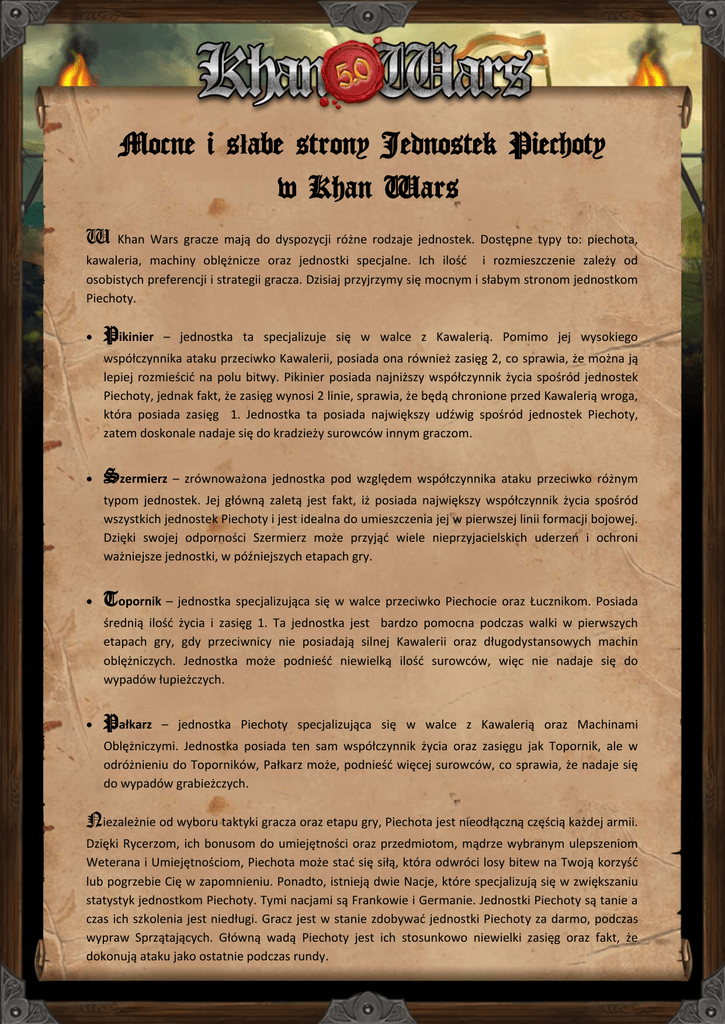 Mocne i słabe strony Jednostek Piechoty w Khan Wars W Khan Wars gracze mają do dyspozycji różne rodzaje jednostek. Dostępne typy to: piechota, kawaleria, machiny oblężnicze oraz jednostki specjalne. Ich ilośd i rozmieszczenie zależy od osobistych preferencji i strategii gracza. Dzisiaj przyjrzymy się mocnym i słabym stronom jednostkom Piechoty. Pikinier – jednostka ta specjalizuje się w walce z Kawalerią. Pomimo jej wysokiego współczynnika ataku przeciwko Kawalerii, posiada ona również zasięg 2, co sprawia, że można ją lepiej rozmieścid na polu bitwy. Pikinier posiada najniższy współczynnik życia spośród jednostek Piechoty, jednak fakt, że zasięg wynosi 2 linie, sprawia, że będą chronione przed Kawalerią wroga, która posiada zasięg 1. Jednostka ta posiada największy udźwig spośród jednostek Piechoty, zatem doskonale nadaje się do kradzieży surowców innym graczom. Szermierz – zrównoważona jednostka pod względem współczynnika ataku przeciwko różnym typom jednostek. Jej główną zaletą jest fakt, iż posiada największy współczynnik życia spośród wszystkich jednostek Piechoty i jest idealna do umieszczenia jej w pierwszej linii formacji bojowej. Dzięki swojej odporności Szermierz może przyjąd wiele nieprzyjacielskich uderzeo i ochroni ważniejsze jednostki, w późniejszych etapach gry. Topornik – jednostka specjalizująca się w walce przeciwko Piechocie oraz Łucznikom. Posiada średnią ilośd życia i zasięg 1. Ta jednostka jest bardzo pomocna podczas walki w pierwszych etapach gry, gdy przeciwnicy nie posiadają silnej Kawalerii oraz długodystansowych machin oblężniczych. Jednostka może podnieśd niewielką ilośd surowców, więc nie nadaje się do wypadów łupieżczych. Pałkarz – jednostka Piechoty specjalizująca się w walce z Kawalerią oraz Machinami Oblężniczymi. Jednostka posiada ten sam współczynnik życia oraz zasięgu jak Topornik, ale w odróżnieniu do Toporników, Pałkarz może, podnieśd więcej surowców, co sprawia, że nadaje się do wypadów grabieżczych. Niezależnie od wyboru taktyki gracza oraz etapu gry, Piechota jest nieodłączną częścią każdej armii. Dzięki Rycerzom, ich bonusom do umiejętności oraz przedmiotom, mądrze wybranym ulepszeniom Weterana i Umiejętnościom, Piechota może stad się siłą, która odwróci losy bitew na Twoją korzyśd lub pogrzebie Cię w zapomnieniu. Ponadto, istnieją dwie Nacje, które specjalizują się w zwiększaniu statystyk jednostkom Piechoty. Tymi nacjami są Frankowie i Germanie. Jednostki Piechoty są tanie a czas ich szkolenia jest niedługi. Gracz jest w stanie zdobywad jednostki Piechoty za darmo, podczas wypraw Sprzątających. Główną wadą Piechoty jest ich stosunkowo niewielki zasięg oraz fakt, że dokonują ataku jako ostatnie podczas rundy.