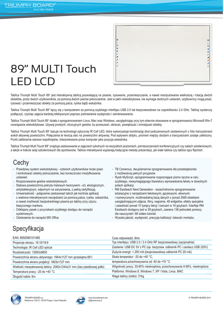 89“ MULTI Touch LED LCD Tablica Triumph Multi Touch 89“ jest interaktywną tablicą pozwalającą na pisanie, rysowanie, przemieszczanie, a nawet manipulowanie wielkością i rotacją dwóch obiektów, przez dwóch użytkowników, za pomocą dwóch palców jednocześnie. Jest w pełni wielodotykowa, nie wymaga osobnych ustawień, użytkownicy mogą pisać, rysować i przemieszczać obiekty za pomocą palca, rysika bądź wskaźnika. Tablica Triumph Multi Touch 89“ łączy się z komputerem za pomocą szybkiego interfejsu USB 2.0 lub bezprzewodowo na częstotliwości 2,4 GHz. Tablicę wystarczy podłączyć, czyniąc zajęcia bardziej efektywnymi poprzez podniesienie wydajności i zainteresowania. Tablica Triumph Multi Touch 89“ działa z oprogramowaniem Linux, Mac oraz Windows, uwzględniając przy tym obecnie stosowane w oprogramowaniu Microsoft Win-7 rozwiązania wielodotykowe. Używaj prostych, intuicyjnych gestów, by przesuwać, obracać, powiększać i zmniejszać obiekty. Tablica Triumph Multi Touch 89“ bazuje na technologii optycznej IR Cell LED, która wykorzystuje kombinację diod podczerwonych zestawionych z foto tranzystorami wokół aktywnej powierzchni. Połączenia te tworzą sieć na powierzchni aktywnej. Pod wpływem dotyku, promień między diodami a tranzystorami zostaje zakłócony. Punkt zakłócenia stanowi współrzędne, interpretowane przez komputer jako pozycja wskaźnika. Tablica Triumph Multi Touch 89“ znajduje zastosowanie w zajęciach szkolnych na wszystkich poziomach, pomieszczeniach konferencyjnych czy salach szkoleniowych, a także w trakcie sesji szkoleniowych dla sportowców. Tablice interaktywne wypierają tradycyjne metody prezentacji, jak białe tablice czy tablice typu flipchart. Cechy - Prawdziwy system wielodotykowy - czterech użytkowników może pisać i kontrolować obiekty jednocześnie, bez konieczności modyfikowania ustawień. - Rozpoznawanie gestów wielodotykowych. - Stalowa powierzchnia pokryta matowym tworzywem - e3, ekologicznym, antybakteryjnym, odpornym na zarysowania, z pełną certyfikacją. - Uniwersalność - połączenie zastosowań takich jak kontrola aplikacji z wieloma interaktywnymi narzędziami za pomocą palca, rysika, wskaźnika, a nawet możliwość bezpośredniego pisania po tablicy przy użyciu klasycznego markera. - Odklejany pasek z przyciskami szybkiego dostępu do narzędzi systemowych. - Odniesienia do narzędzi MS Office - TB Comenius, dwupiśmienne oprogramowanie dla przedsiębiorstw z możliwością pełnych przypisów - Rysik MyScript, oprogramowanie rozpoznające pismo ręczne w celu szybkiego, niewymagającego klawiatury wprowadzania tekstu w dowolnych polach aplikacji. - RM Easiteach Next Generation - wszechstronne oprogramowanie edukacyjne z narzędziami tekstowymi, językowymi, słownymi i numerycznymi, multimedialną bazą danych z ponad 2569 obiektami uwzględniającymi zdjęcia, filmy, nagrania, 48 widgetów, efekty specjalne i zawartość ponad 10 tysięcy lekcji i ćwiczeń w 16 językach. Interfejs RM Easiteach dostępny jest w 39 językach, zawiera 136 jednostek pomocy dla nauczycieli i 80 wideo tutoriali. - Wysoka jakość, wydajność, precyzja kalibracji i łatwość montażu. Specyfikacja EAN: 8592580101465 Proporcje obrazu: 16:10/16:9 Technologia: IR Cell LED optical Rozdzielczość: 12800x9600 Powierzchnia ekranu aktywnego: 1944x1127 mm (przekątna 89“) Powierzchnia ekranu projekcji: 1803x1127 mm Wielkość nieopakowanej tablicy: 2060x1244x31 mm (bez plastikowej półki) Temperatura pracy: -20 do +40 °C Długość kabla: 6m TRIUMPH BOARD a.s. Neklanova 122/15, 128 00 Prague, Czech Republic www.triumphboard.com [email protected] Czas odpowiedzi: 6ms Typ interfejsu: USB 2.0 / 2.4 GHz RF bezprzewodowy (opcjonalnie) Zasilanie: USB DC 5V z PC (op. bezprzew. odbiornik PC i zasilacz USB 220V) Zużycie energii: < 250 mA (bezprzewodowy odbiornik PC 20 mA) Skala temperatur: -20 do +40 °C, temperatura przechowywania od -40 do +70 °C Wilgotność pracy: 30-90% nieskroplona, przechowywanie 0-95%, nieskroplona Platforma: Windows 8, Windows 7, XP i Vista, Linux, MAC Waga tablicy (netto): 31kg © TRIUMPH BOARD 2014 Oprogramowanie TB Comenius W celu zmaksymalizowania interakcji, tablica Triumph 89“ Multi Touch została wyposażona w oprogramowanie TB Comenius zapewniające narzędzia i funkcjonalności zaprojektowane tak, aby zwiększać interaktywność zajęć z pomocą Microsoft Office i oprogramowania edukacyjnego.TB Comenius wraz z tablicąTRIUMPH 89“ MultiTouch pozwala na symultaniczne pisanie, operowanie wskaźnikami, wymazywanie i manipulowanie obiektami bez konieczności użycia w tym celu specjalnych narzędzi. Tablica Triumph 89“ Multi Touch i TB Comenius ożywiają zajęcia i pozwalają na tworzenie własnych planów lekcji. Edytuj zajęcia przy użyciu wielofunkcyjnych narzędzi typu „drag and drop“ (przeciągnij i upuść). Przesuwaj i grupuj obiekty, wycinaj i wklejaj, aby maksymalnie wykorzystać potencjał edukacyjny. TB Comenius pozwala na tworzenie przypisów i zapisywanie Twoich notatek w różnych aplikacjach oprogramowania, uwzględniając MS PowerPoint, Word, Excel... TB Comenius został zlokalizowany w 24 językach! Cechy oprogramowania - Twórz, edytuj i notuj nawet w filmach na żywo - Cliparty, hiperlinki, zoom - Aranżuj, zmieniaj, wypełniaj i grupuj obiekty - Modyfikuj i dostosowuj kształty do własnych wymagań - Udostępniaj ekran PC z własnymi obrazami - Narzędzia pełnoekranowe, rysunki geometryczne, kątomierz, linijka, kompas - Aparat fotograficzny dla dokumentów - i znacznie więcej My Script Stylus Na potrzeby wprowadzania tekstu, użytkownik może wykorzystać aktywowaną słownie klawiaturę ekranową lub użyć najwyższej jakości oprogramowania rozpoznającego pismo ręczne, MyScript Stylus, dostępnego w zestawie. Wspomniane opcje pozwalają uniknąć wracania do komputera w celu wprowadzania pożądanego tekstu. MyScript Stylus konwer