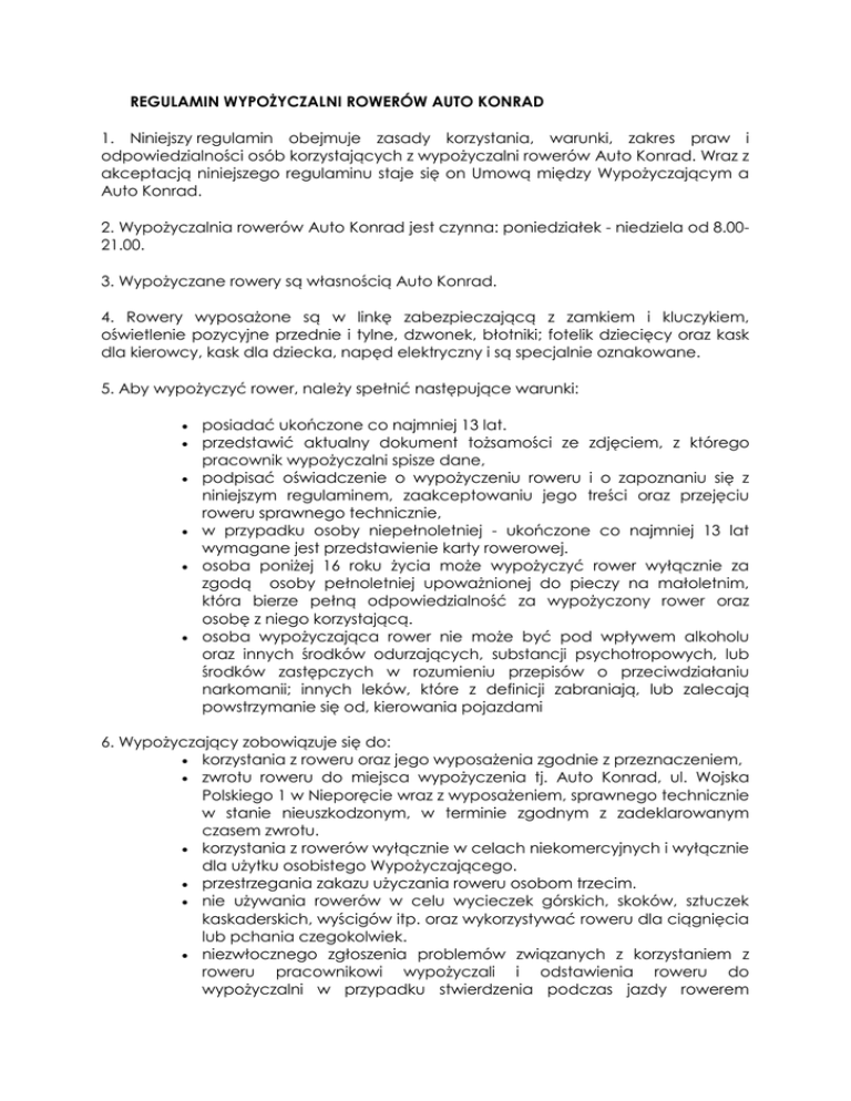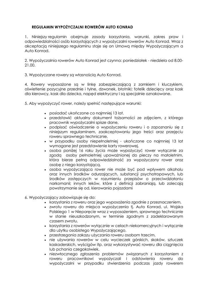 REGULAMIN WYPOŻYCZALNI ROWERÓW AUTO KONRAD 1. Niniejszy regulamin obejmuje zasady korzystania, warunki, zakres praw i odpowiedzialności osób korzystających z wypożyczalni rowerów Auto Konrad. Wraz z akceptacją niniejszego regulaminu staje się on Umową między Wypożyczającym a Auto Konrad. 2. Wypożyczalnia rowerów Auto Konrad jest czynna: poniedziałek - niedziela od 8.0021.00. 3. Wypożyczane rowery są własnością Auto Konrad. 4. Rowery wyposażone są w linkę zabezpieczającą z zamkiem i kluczykiem, oświetlenie pozycyjne przednie i tylne, dzwonek, błotniki; fotelik dziecięcy oraz kask dla kierowcy, kask dla dziecka, napęd elektryczny i są specjalnie oznakowane. 5. Aby wypożyczyć rower, należy spełnić następujące warunki: posiadać ukończone co najmniej 13 lat. przedstawić aktualny dokument tożsamości ze zdjęciem, z którego pracownik wypożyczalni spisze dane, podpisać oświadczenie o wypożyczeniu roweru i o zapoznaniu się z niniejszym regulaminem, zaakceptowaniu jego treści oraz przejęciu roweru sprawnego technicznie, w przypadku osoby niepełnoletniej - ukończone co najmniej 13 lat wymagane jest przedstawienie karty rowerowej. osoba poniżej 16 roku życia może wypożyczyć rower wyłącznie za zgodą osoby pełnoletniej upoważnionej do pieczy na małoletnim, która bierze pełną odpowiedzialność za wypożyczony rower oraz osobę z niego korzystającą. osoba wypożyczająca rower nie może być pod wpływem alkoholu oraz innych środków odurzających, substancji psychotropowych, lub środków zastępczych w rozumieniu przepisów o przeciwdziałaniu narkomanii; innych leków, które z definicji zabraniają, lub zalecają powstrzymanie się od, kierowania pojazdami 6. Wypożyczający zobowiązuje się do: korzystania z roweru oraz jego wyposażenia zgodnie z przeznaczeniem, zwrotu roweru do miejsca wypożyczenia tj. Auto Konrad, ul. Wojska Polskiego 1 w Nieporęcie wraz z wyposażeniem, sprawnego technicznie w stanie nieuszkodzonym, w terminie zgodnym z zadeklarowanym czasem zwrotu. korzystania z rowerów wyłącznie w celach niekomercyjnych i wyłącznie dla użytku osobistego Wypożyczającego. przestrzegania zakazu użyczania roweru osobom trzecim. nie używania rowerów w celu wycieczek górskich, skoków, sztuczek kaskaderskich, wyścigów itp. oraz wykorzystywać roweru dla ciągnięcia lub pchania czegokolwiek. niezwłocznego zgłoszenia problemów związanych z korzystaniem z roweru pracownikowi wypożyczali i odstawienia roweru do wypożyczalni w przypadku stwierdzenia podczas jazdy rowerem jakiejkolwiek usterki roweru. zaniechania samodzielnego dokonywania jakichkolwiek napraw, modyfikacji, wymiany części w wypożyczonym rowerze. pokrycia kosztów naprawy uszkodzonego roweru lub jego wyposażenia, wynikłych z winy wypożyczającego. pokrycia kosztów zakupu nowego roweru w przypadku całkowitego zniszczenia roweru wypożyczonego. 7. W przypadku utraty wypożyczonego roweru lub jego wyposażenia, na skutek okoliczności za które ponosi odpowiedzialność wypożyczający w tym kradzieży lub zgubienia, wypożyczający jest zobowiązany do zwrotu równowartości kosztów odpowiadających wartości roweru oraz jego wyposażenia (na podstawie cen obowiązujących na rynku w dniu stwierdzenia faktu). 8. Wypożyczający zgadza się pokryć wszystkie szkody i kary związane z użytkowaniem roweru wynikające z nieprzestrzegania przepisów prawa obowiązujących w Polsce w tym wynikające z Kodeksu Ruchu Drogowego. 9.Pełną odpowiedzialność za wypadki, wszelkie szkody powstałe w czasie korzystania z wypożyczonego roweru ponosi Wypożyczający. Wypożyczający będąc uczestnikiem ruchu drogowego jest obowiązany przestrzegać zasad poruszania się po drogach i czyni to tylko i wyłącznie na własną odpowiedzialność. Użytkownik zrzeka się wszelkich roszczeń wobec Auto Konrad z tytułu wypadków, poniesionych szkód lub obrażeń powstałych w okresie korzystania z wypożyczonych rowerów. 10.Wypożyczający ponosi wyłączną odpowiedzialność za wszelkie szkody wyrządzone osobom trzecim związane z korzystaniem z wypożyczonych rowerów. 11.W przypadku wypożyczenia rowerów przez grupę zorganizowaną konieczne jest wcześniejsze uzgodnienie terminu oraz ilości rowerów z pracownikiem starostwa. 12.W przypadku nie zwrócenia roweru do momentu zamknięcia Wypożyczalni w dniu zwrotu, dane Wypożyczającego będą przekazane policji z informacją o prawdopodobieństwie popełnienia czynu karalnego przez Wypożyczającego. 13. Jeżeli pracownik wypożyczalni uzna Klienta za niewiarygodnego, może odmówić wypożyczenia roweru bez podania przyczyny. 14.Wypożyczający zobowiązuje się przestrzegać warunków Regulaminu w szczególności zapłacić należności wynikające z regulaminu wypożyczalni na rzecz Auto Konrad oraz używać roweru zgodnie z regulaminem.