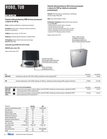 ROBO, TUB 230V Si³ownik elektromechaniczny TUB do bram przesuwnych o ciê¿arze do 3500 kg. Idealny do zastosowañ przemys³owych. Si³ownik elektromechaniczny, samohamowny z wbudowan¹ central¹ steruj¹c¹ Mindy A500. 400V Silny: du¿y moment obrotowy 190 Nm. Si³ownik elektromechaniczny ROBO do bram przesuwnych o ciê¿arze do 600 kg. Funkcjonalny i bezpieczny: funkcje centrali mo¿na rozszerzyæ stosuj¹c kartê PIU: • obs³uga semafora (œwiat³o zielone i czerwone) • obs³uga elektrozamka lub rygla • wyjœcie czasowego oœwietlenia posesji od 5 s do 250 s • funkcja czêœciowego otwarcia bramy (funkcja furtki) • druga linia FOTO dzia³aj¹ca podczas otwierania Prosty: wbudowana elektronika z wyjmowanymi wtyczkami. Sprawdzony: ³atwy monta¿, estetyczne wzornictwo, doskona³e parametry i niezawodnoœæ. Prêdkoœæ przesuwu bramy - do 10.8 m/min. funkcje central strona 72/73 Bezpieczny: zwolnienie podczas otwierania i zamykania bramy. MOCNY, £ATWY W U¯YCIU, ALUMINIOWY MECHANIZM ODBLOKOWANIA AWARYJNEGO NICE W PRZYPADKU BRAKU ZASILANIA Funkcjonalny: funkcje centrali mo¿na rozszerzyæ stosuj¹c kartê PIU (ROBO1000). Fotokomórki typu BF/MOF/FK/F210/FT210/ERA. ROBO500 (patrz strona 120). funkcje central strona 72/73 WYGODNY MECHANIZM ODBLOKOWANIA AWARYJNEGO NICE W PRZYPADKU BRAKU ZASILANIA MOCNY, WYTRZYMA£Y, ALUMINIOWY KORPUS cena netto 1 550,00 cena brutto 1 906,50 si³ownik samohamowny, silnik 3x400V, trójfazowy, do 3500 kg, z wbudowan¹ central¹ steruj¹c¹ A500, sprzêg³o mechaniczne 6 700,00 8 241,00 PRZYK£ADOWE ZESTAWY DO U¯YTKU PRZYDOMOWEGO ROBO1000 zestaw do bram przesuwnych o wadze do 600 kg: si³ownik RO1000 z wbudowan¹ central¹ steruj¹c¹, radioodbiornik SMX2R, ERA FLOR 1 pilot dwukana³owy FLO2RE, fotokomórki BF ROBO1000 zestaw do bram przesuwnych o wadze do 600 kg: si³ownik RO1000 z wbudowan¹ central¹ steruj¹c¹, radioodbiornik SMX2, SMILO 2 piloty dwukana³owe SM2, fotokomórki BF cena netto 1 995,00 cena brutto 2 453,85 2 015,00 2 478,45 Kod ROBO1000 samohamowny si³ownik, silnik 230V, do 600 kg, wbudowana centrala steruj¹ca ROA3 TUB Parametry (V) Zasilanie centrali/Zasilanie silnika (W) Moc pobierana (A) Natê¿enie pr¹du (A) Natê¿enie pr¹du (silnik) (uF) Wbudowany kondensator (IP) Stopieñ zabezpieczenia (Nm) Nominalny moment obrotowy (m/min) Prêdkoœæ bamy (kg) Max. ciê¿ar bramy (oC min/max) Temperatura pracy Klasa izolacji (%) Intensywnoœæ pracy (kg) Ciê¿ar 36| RO1000 230/230 400 1.8 1.8 14 44 17 10.8 600 -20 do +50 1 30 13.5 AUTOMATYKA DO BRAM PRZESUWNYCH TUB 3x400/3x400 1.65 550 44 190 10.0 7700 3500 -20 do +50 F 200 cykli/dzieñ 60.0 AKCESORIA LOLA listwa zêbata nylonowa M4, w odcinkach po 0,5 metra, pakowana po 10 sztuk, cena za 5 mb ROA6 listwa zêbata nylonowa M4, z rdzeniem stalowym, w odcinkach metrowych 200,00 246,00 brutto 50,00 61,50 brutto BF fotokomórki (para), zasiêg 15 - 30 m 160,00 196,80 brutto ROA8 listwa zêbata metalowa M4, ocynkowana, 30x8 mm, w odcinkach metrowych, w kpl. ze œrubami i tulejami dystansowymi ROA81 listwa zêbata metalowa M6, ocynkowana, 30x30 mm, w odcinkach metrowych (do si³owników TUB) 50,00 61,50 brutto 145,00 178,35 brutto LUCY lampa sygnalizacyjna 230V ML lampa sygnalizacyjna 230V z wbudowan¹ anten¹ 433.92 MHz LL lampa sygnalizacyjna 230V z wbudowan¹ anten¹ 433.92 MHz 100,00 123,00 brutto 115,00 141,45 brutto 115,00 141,45 brutto PIU karta rozszerzaj¹ca funkcje central (funkcje strona 72/73) 125,00 153,75 brutto POZOSTA£E AKCESORIA STR. 94-105 WYMIARY SCHEMAT INSTALACJI TUB [legenda] 290 580 [3 x 1.5 mm2] zasilanie [4 x 0.5 mm2] linia foto (RX) [2 x 0.5 mm2] linia foto (TX) [4 x 1.0 mm2] zamek, przycisk [2 x 0.75 mm2] lampa 230V [Rg58] antena 156,5 250 480 mm 240 ZESTAWY DO U¯YTKU PRZYDOMOWEGO ROBO1000 ERA FLOR si³ownik do bram przesuwnych o ciê¿arze do 600 kg FLO2RE 1 pilot dwukana³owy 433.92 MHz SMX2R radioodbiornik uniwersalny, 2-kana³owy 433.92 MHz BF fotokomórki AUTOMATYKA DO BRAM PRZESUWNYCH |37