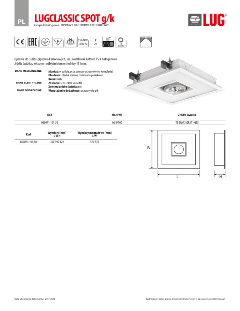 LUGCLASSIC SPOT g/k PL Grupa katalogowa: OPRAWY RASTROWE I MODUŁOWE Oprawa do sufitu gipsowo-kartonowych, na świetlówki kołowe T5 i halogenowe źródła światła z własnym odbłyśnikiem o średnicy 111mm. DANE MECHANICZNE DANE ELEKTRYCZNE DANE DODATKOWE Montaż: w suficie, przy pomocy uchwytów (w komplecie) Obudowa: blacha stalowa malowana proszkowo Kolor: biały Zasilanie: 220-240V 50/60Hz Zawiera źródło światła: nie Wyposażenie dodatkowe: uchwyty do g/k Kod Moc [W] Źródło światła 060071.101.50 1x55/100 T5 2Gx13,QR111 G53 Kod Wymiary [mm] LWH Wymiary montażowe [mm] LW 060071.101.50 390 390 122 370 370 W L Data utworzenia dokumentu: 29-7-2016 H Zastrzegamy sobie prawo zmian konstrukcyjnych w oprawach oświetleniowych